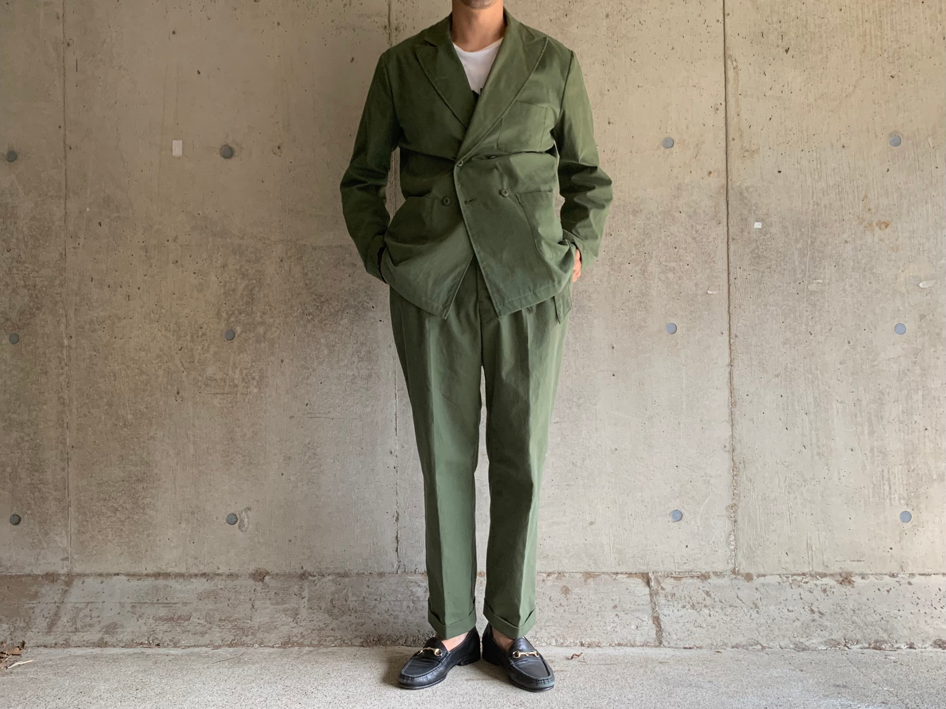 当店で販売している同じスリーピングバッグケースで作ったタックテーパードパンツとセットアップで着用してもグッドです。(全て違う個体で作成しているため、微妙に色が違います。完璧なセットアップをお求めの方は推奨いたしません。)