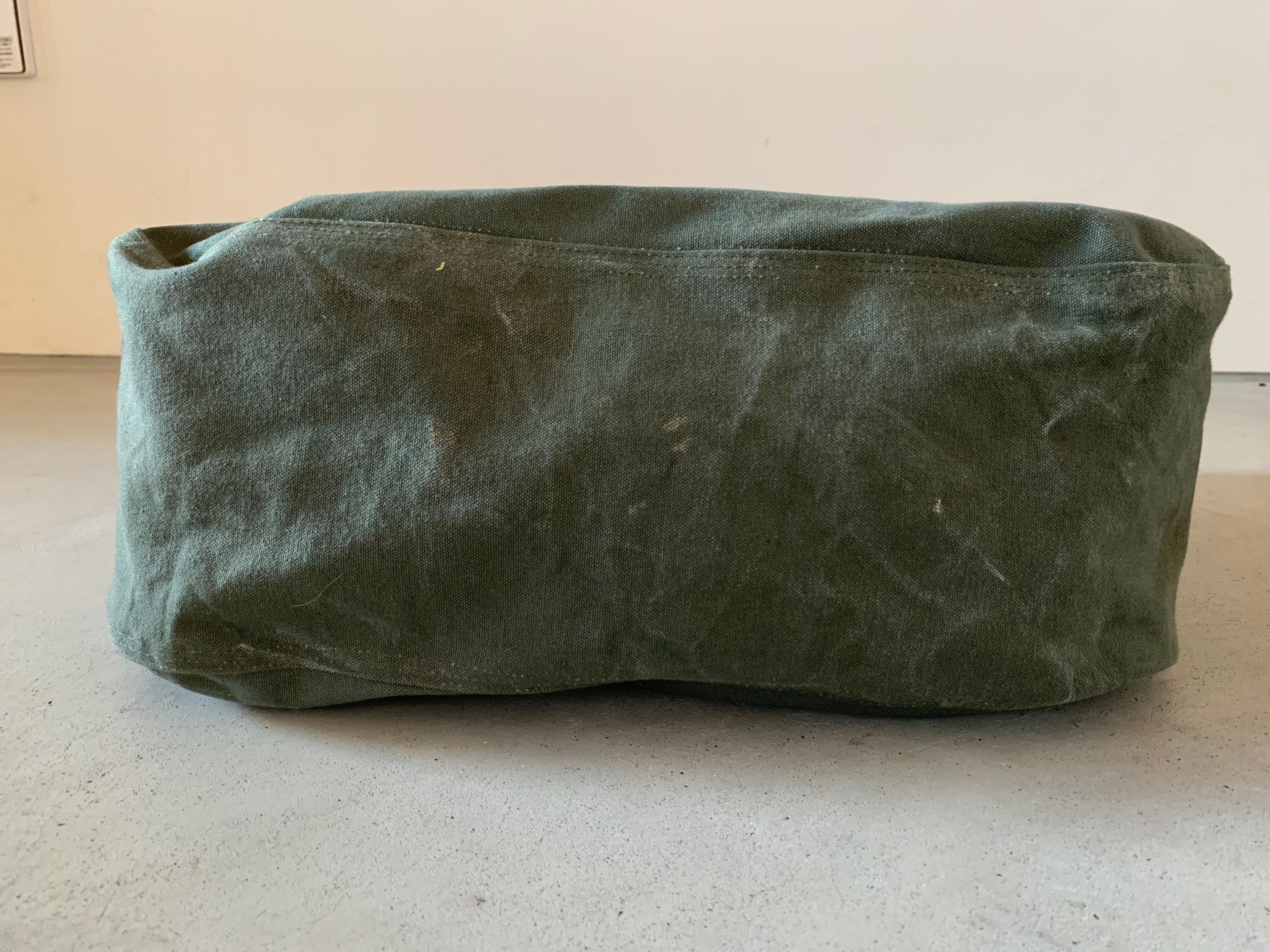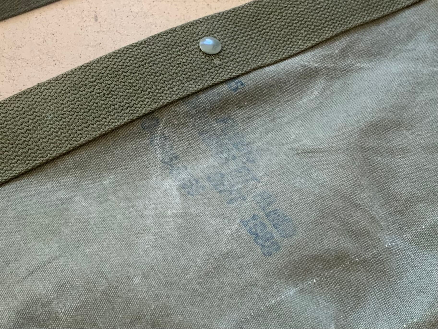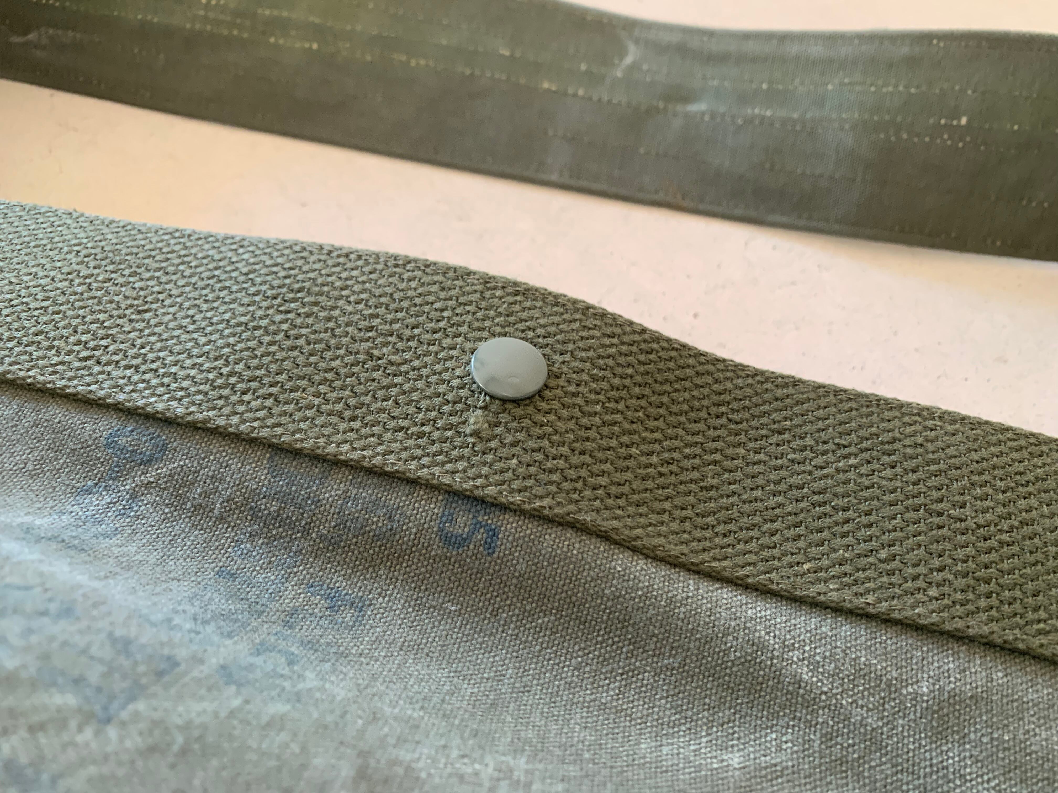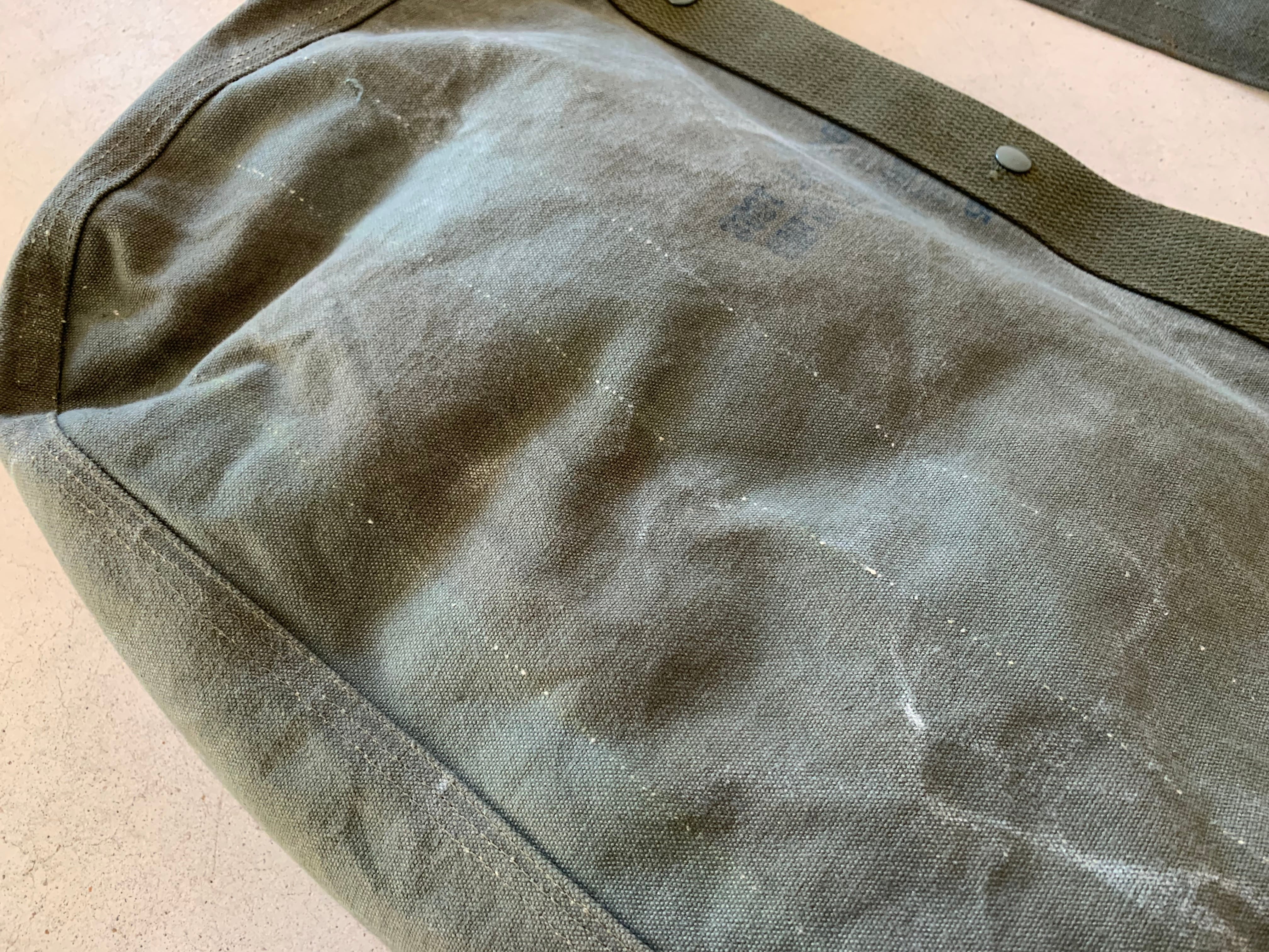 ボディーの生地は80年代頃、アメリカ軍のフライヤーズキットバッグ。当時のステンシルが残っており88年に納入されたことがわかります。素材はコットンキャンバスで使い古してグレーがかったカーキ色がヴィンテージの雰囲気を醸し出してくれます。開口部をぐるりと巻いて、補強しているキャンバステープは50年代のデッドストックの物を使用しています。