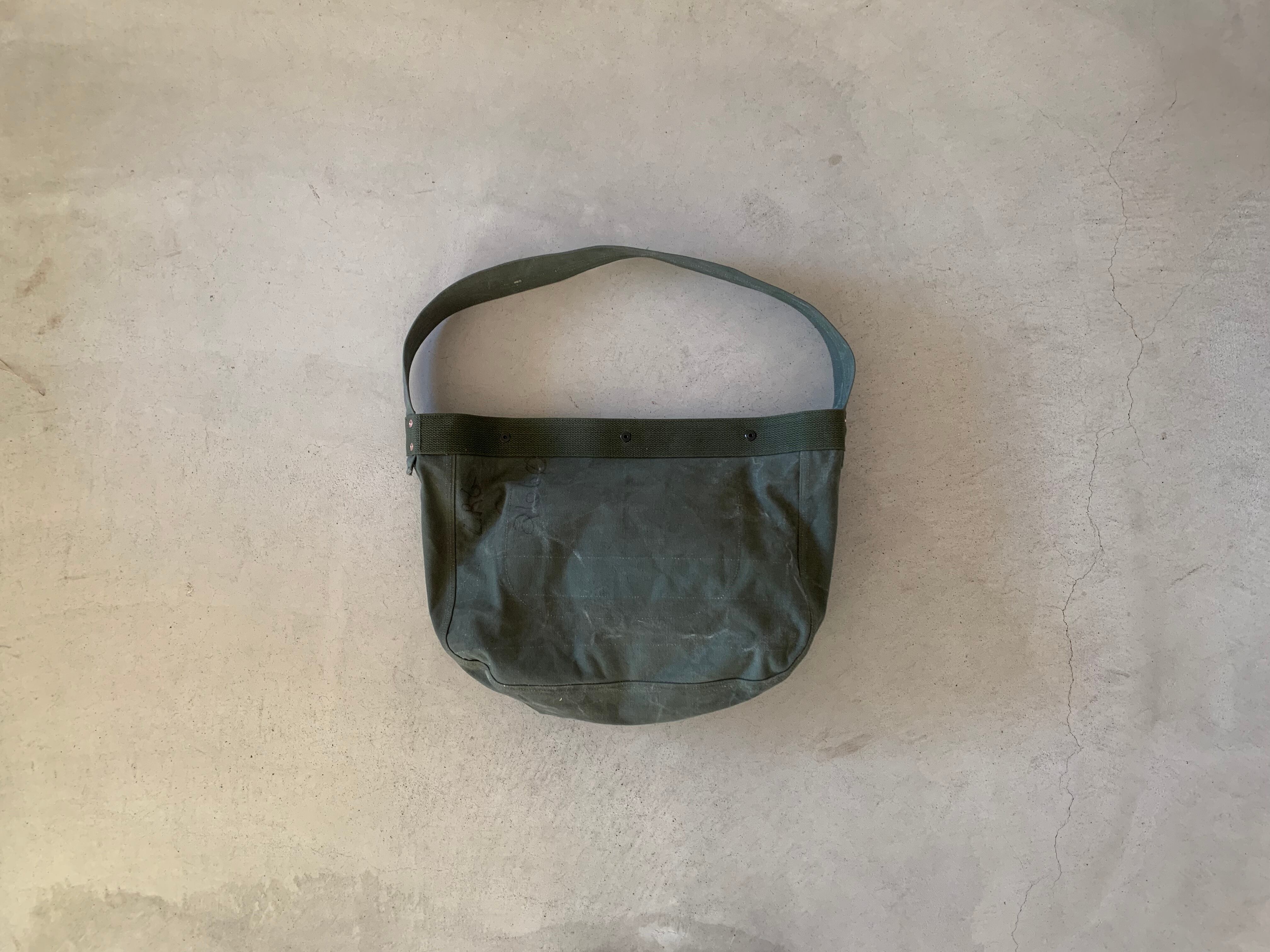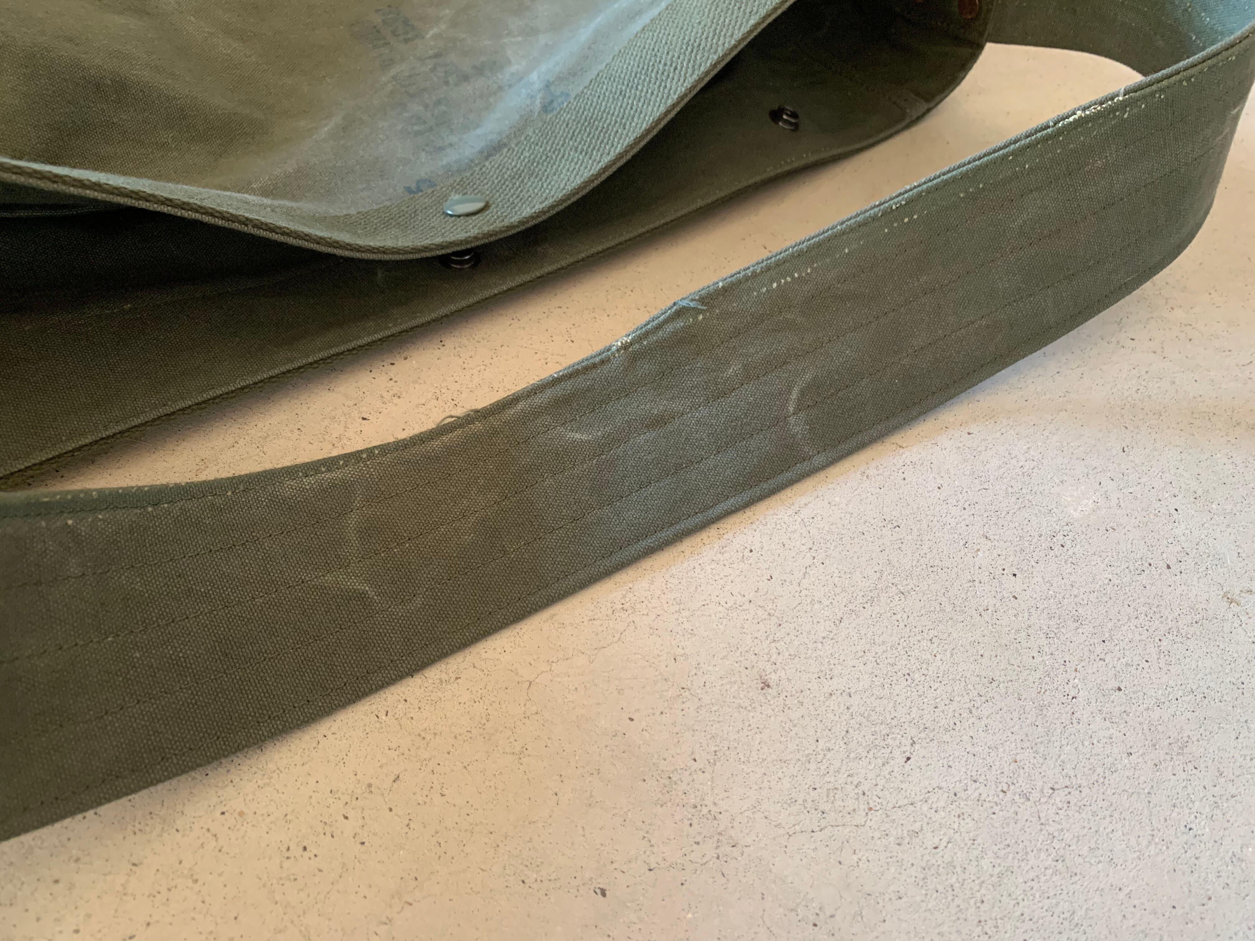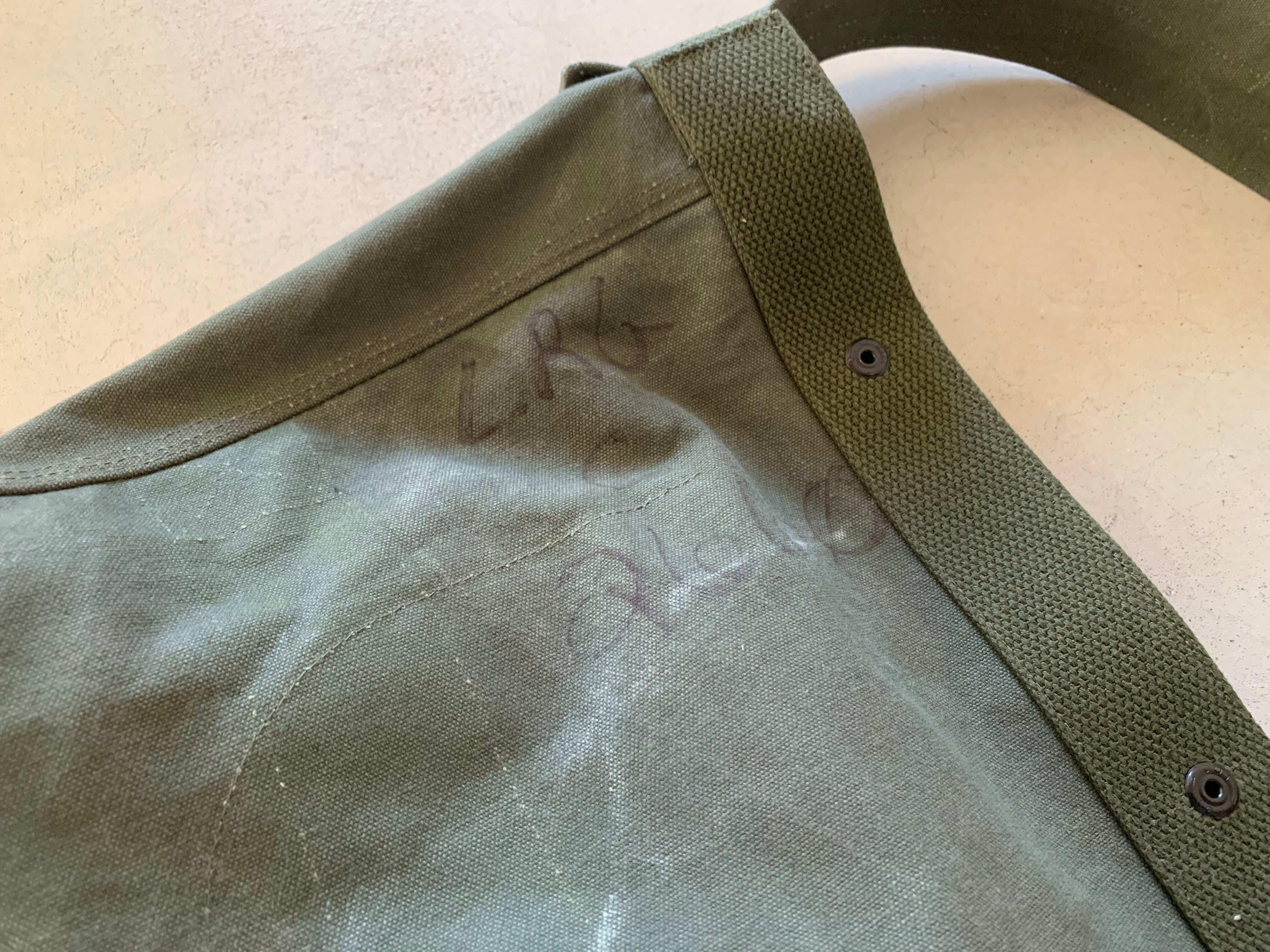 ボディーの生地は80年代頃、アメリカ軍のフライヤーズキットバッグ。当時のステンシルが残っており88年に納入されたことがわかります。素材はコットンキャンバスで使い古してグレーがかったカーキ色がヴィンテージの雰囲気を醸し出してくれます。開口部をぐるりと巻いて、補強しているキャンバステープは50年代のデッドストックの物を使用しています。