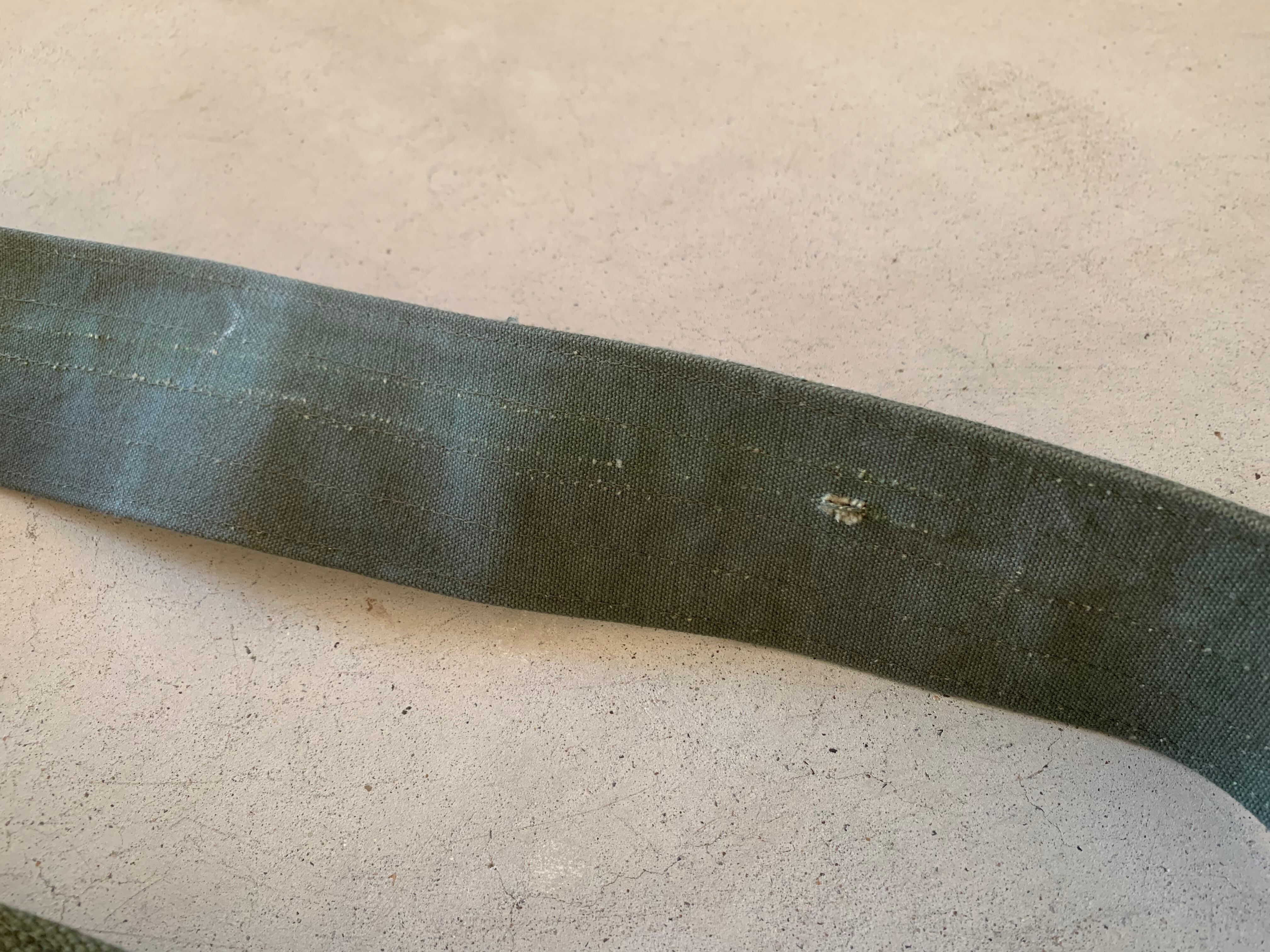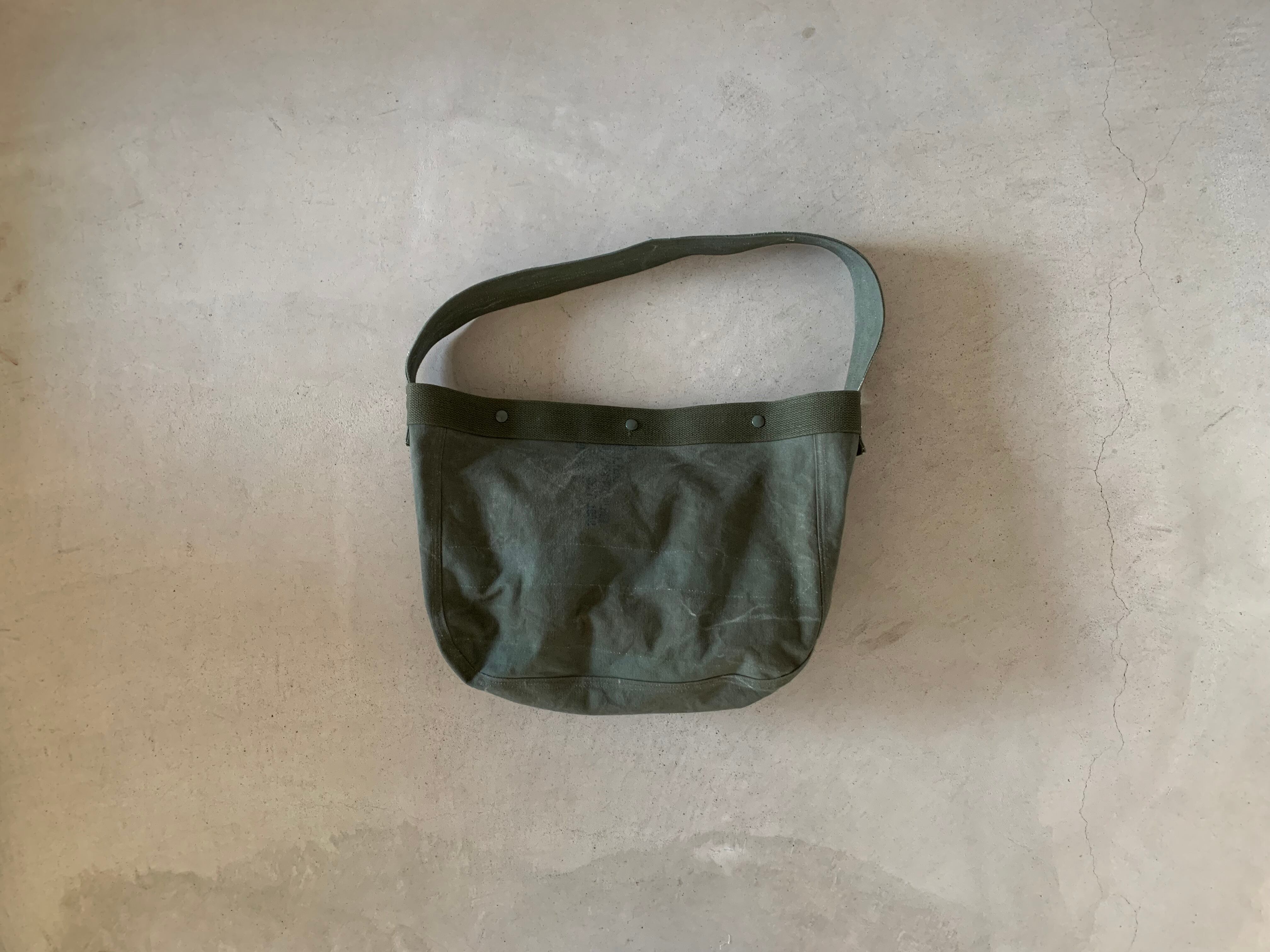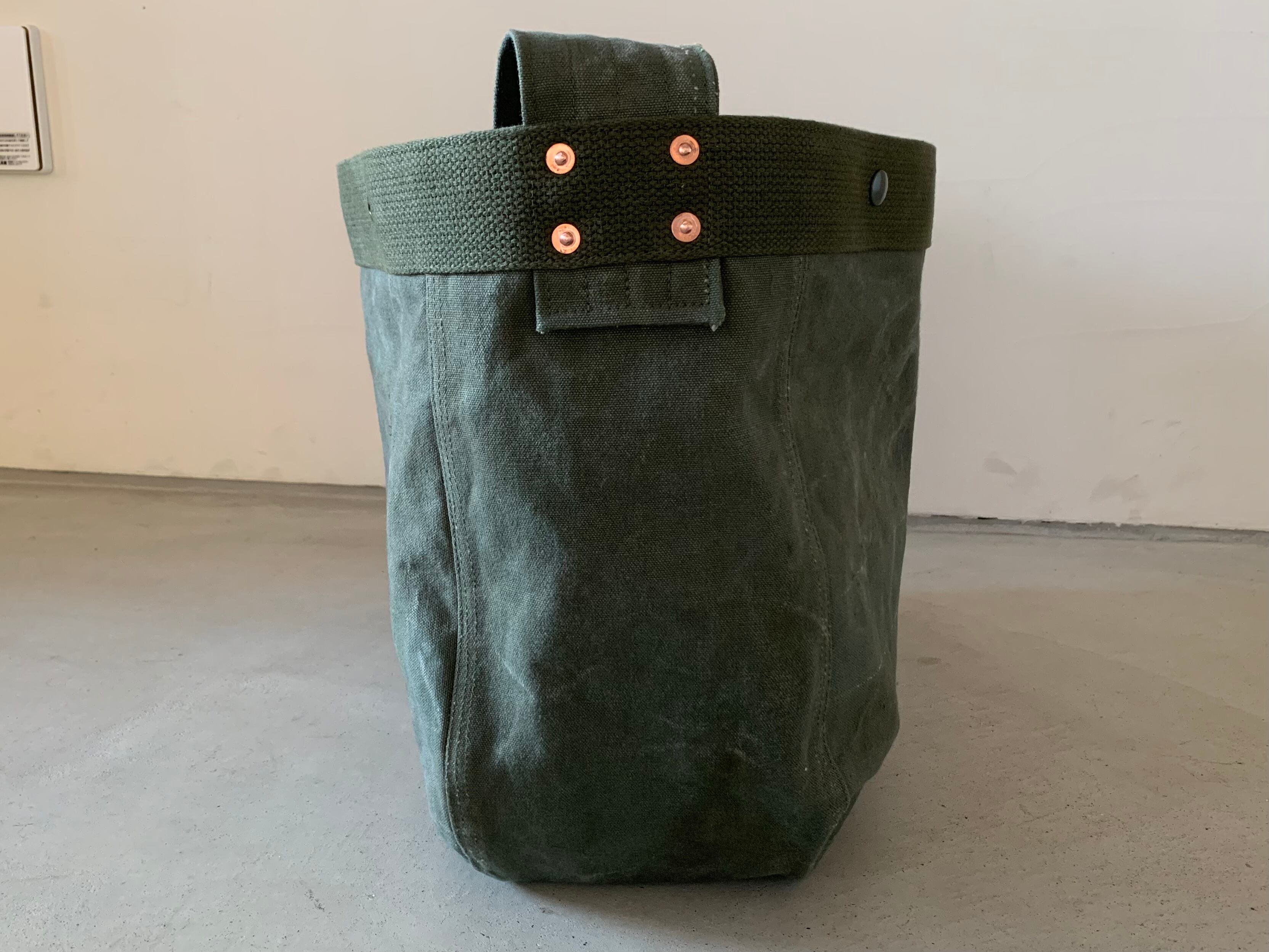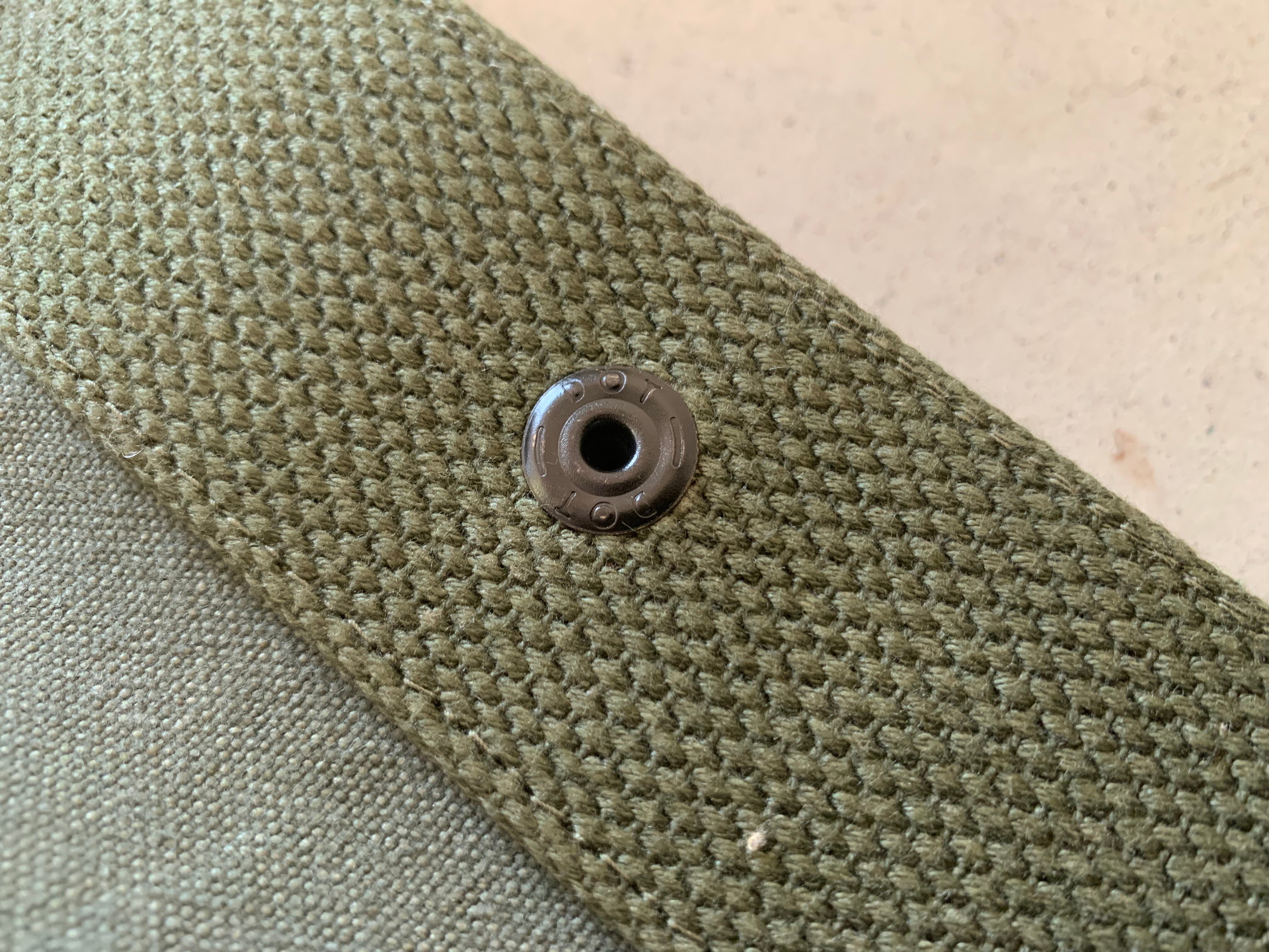 ボディーの生地は80年代頃、アメリカ軍のフライヤーズキットバッグ。当時のステンシルが残っており88年に納入されたことがわかります。素材はコットンキャンバスで使い古してグレーがかったカーキ色がヴィンテージの雰囲気を醸し出してくれます。開口部をぐるりと巻いて、補強しているキャンバステープは50年代のデッドストックの物を使用しています。