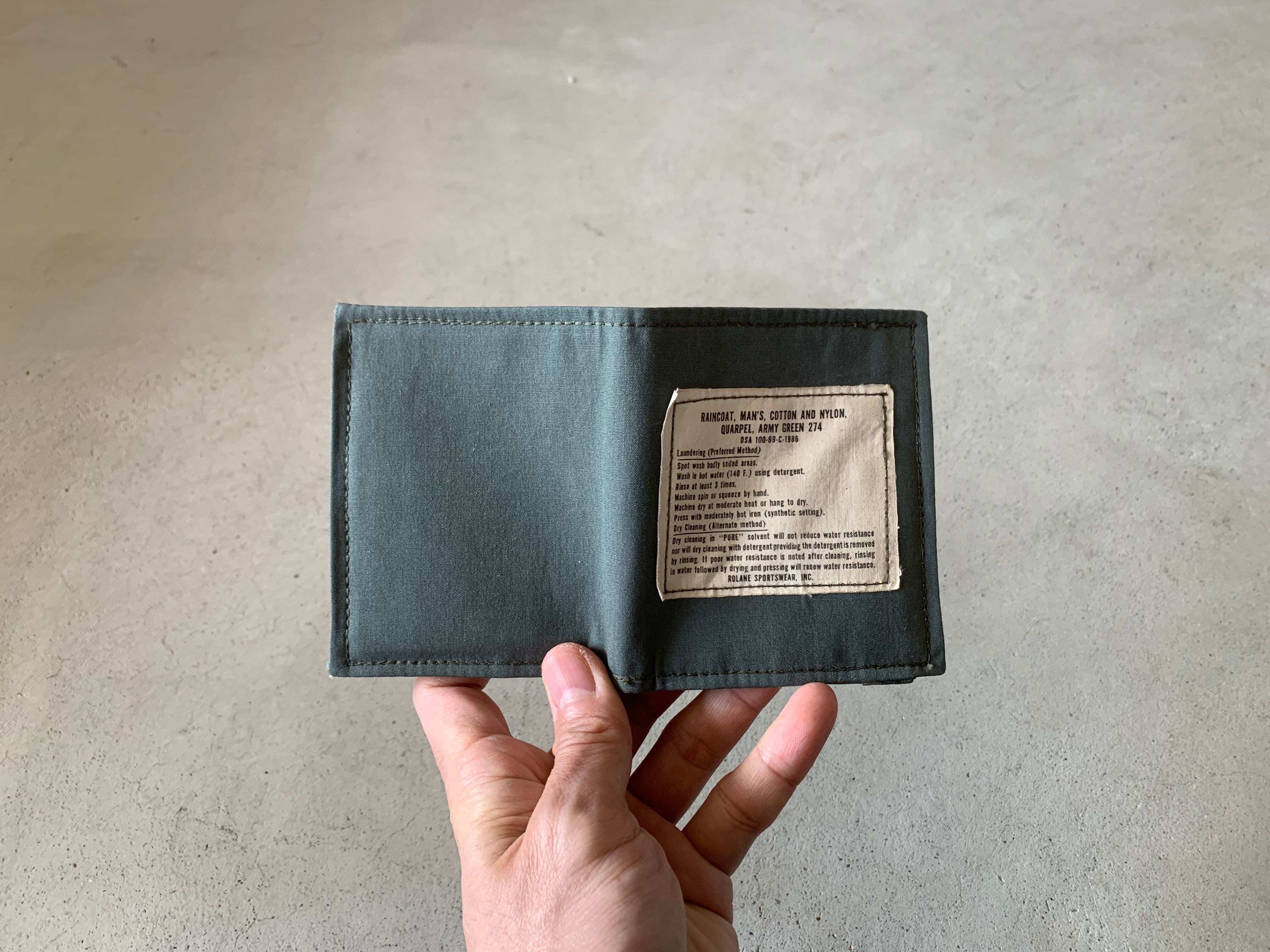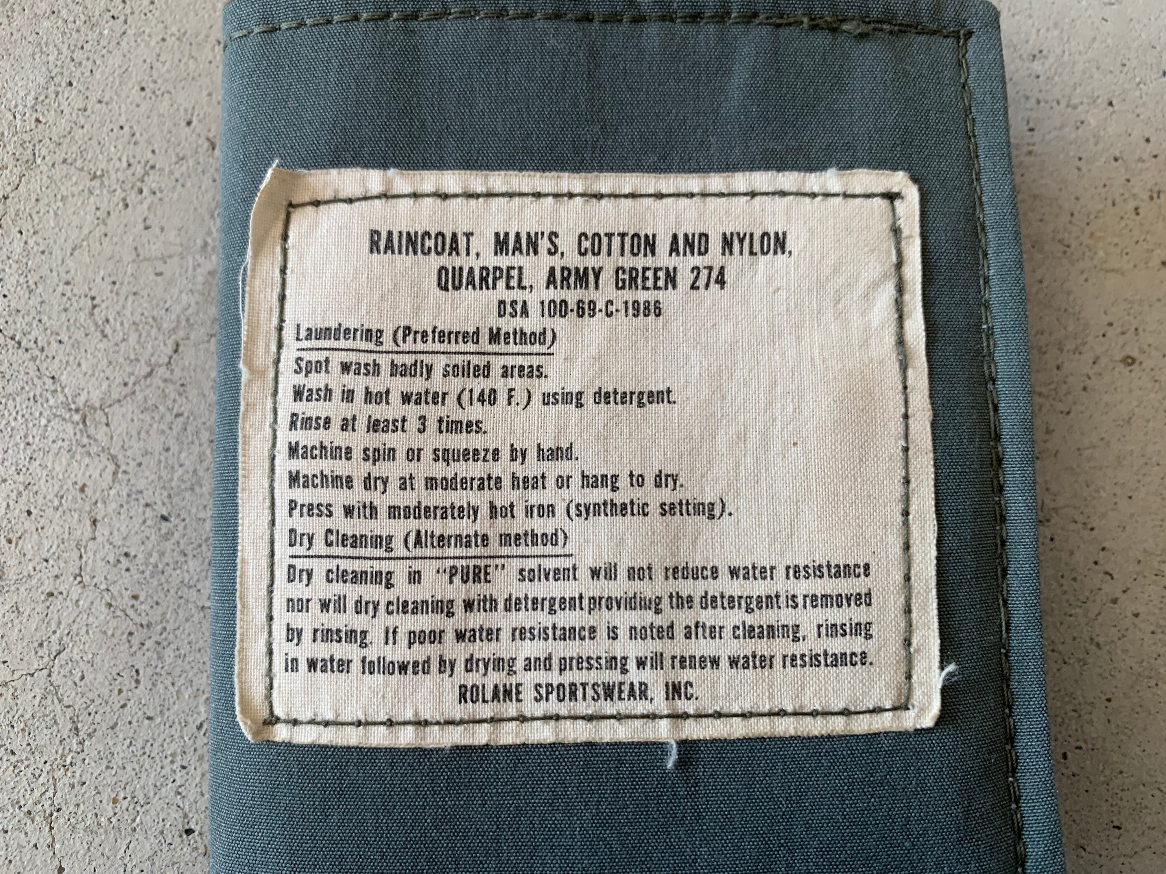 表側の生地は60年代、アメリカ軍のレインコートの生地を使用。表面には、コートについていた実物のミルスペックをつけております。69年に軍へ納入された物だということがわかります。