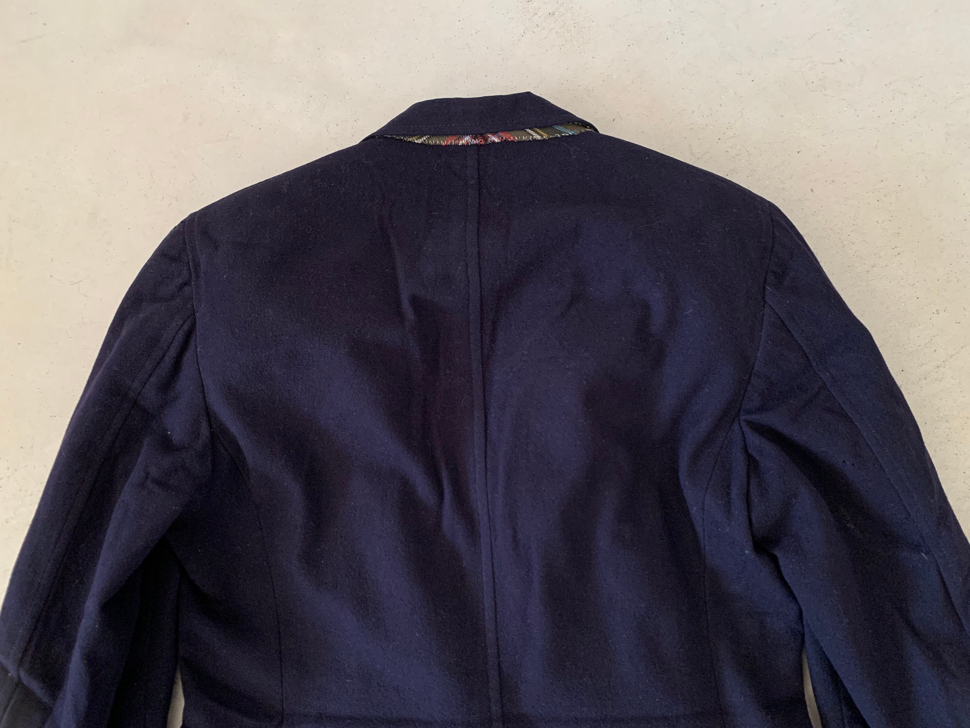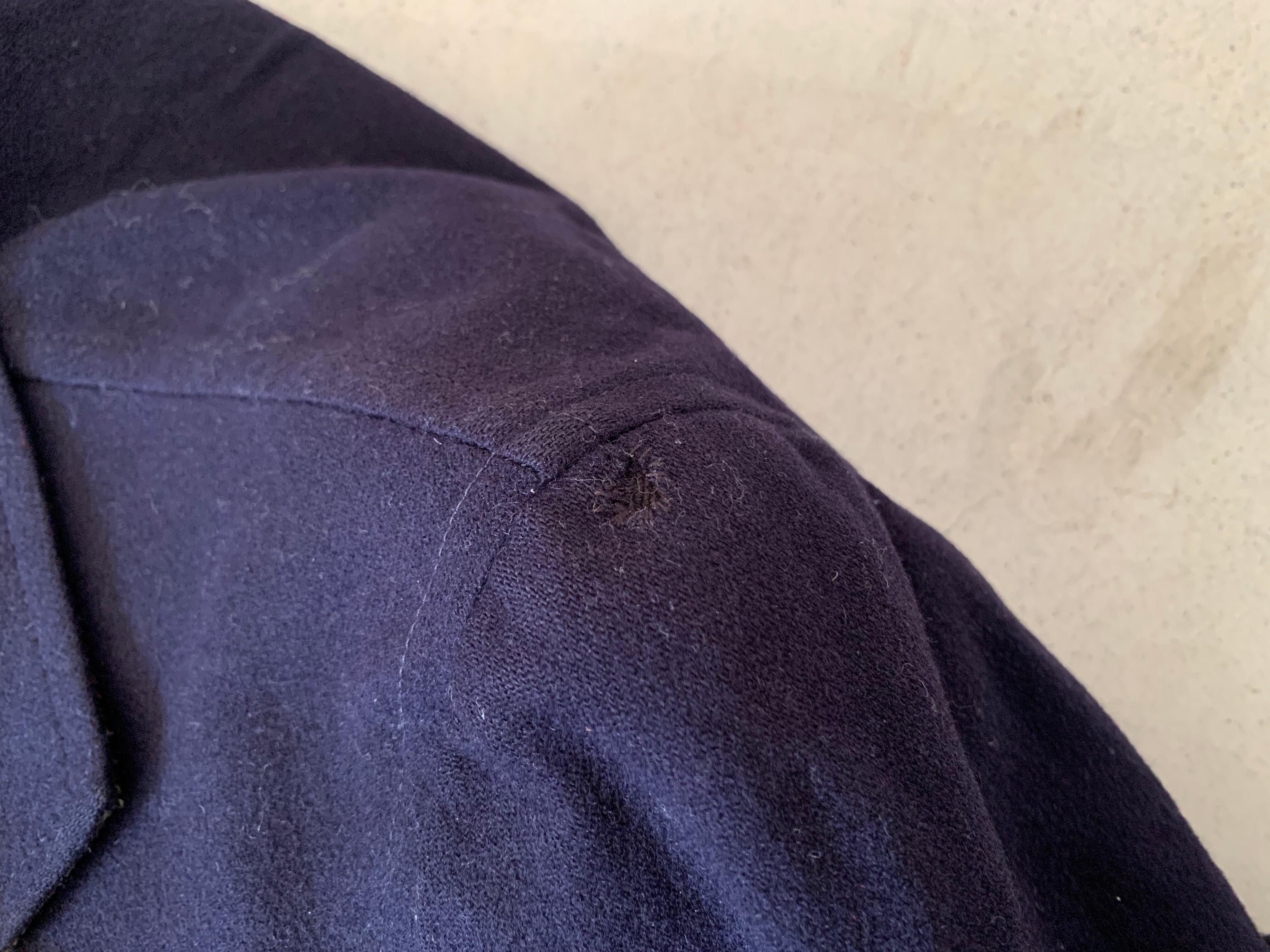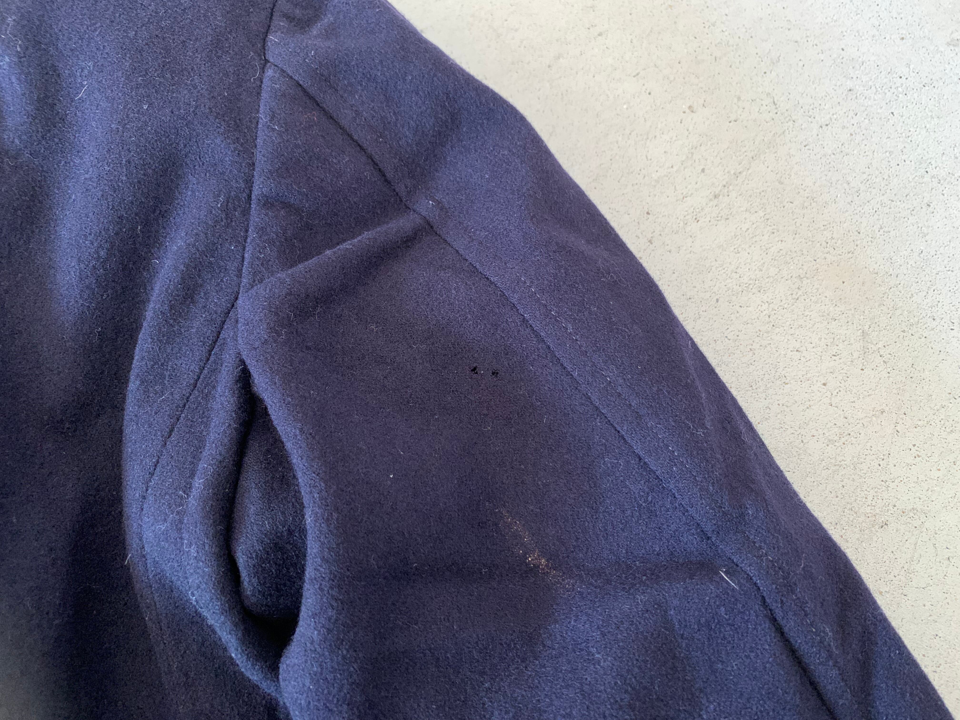 左肩先端にダメージがあります。画像14枚目をご確認ください。右袖の後側に小穴があります。画像15枚目です。裏地の背面にダメージがあります。画像16枚目です。
