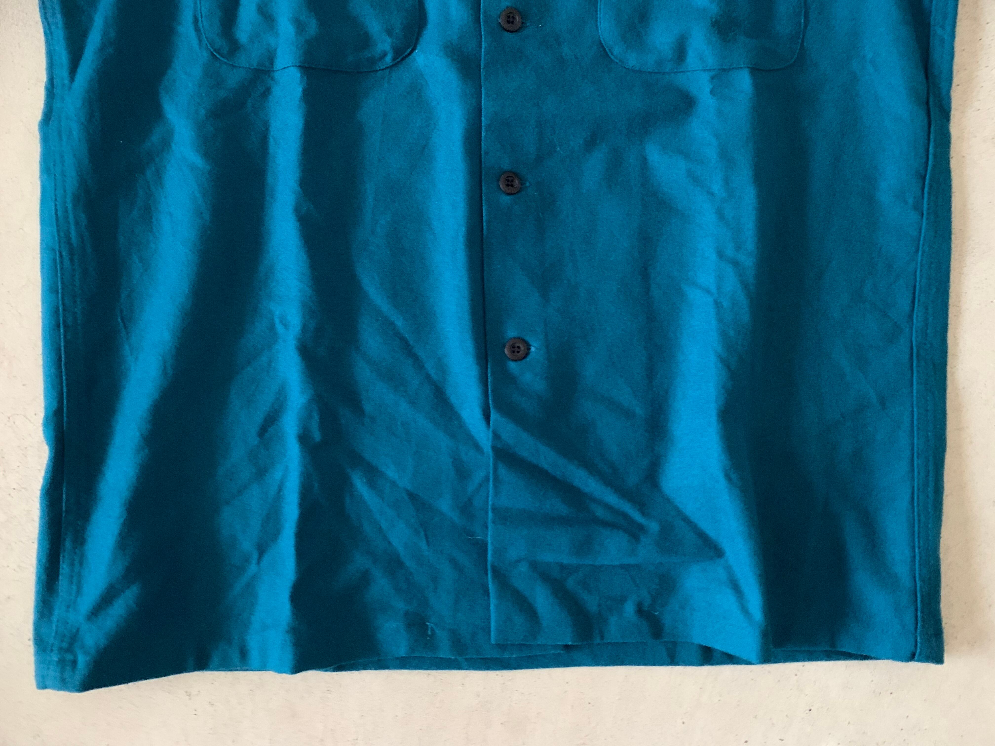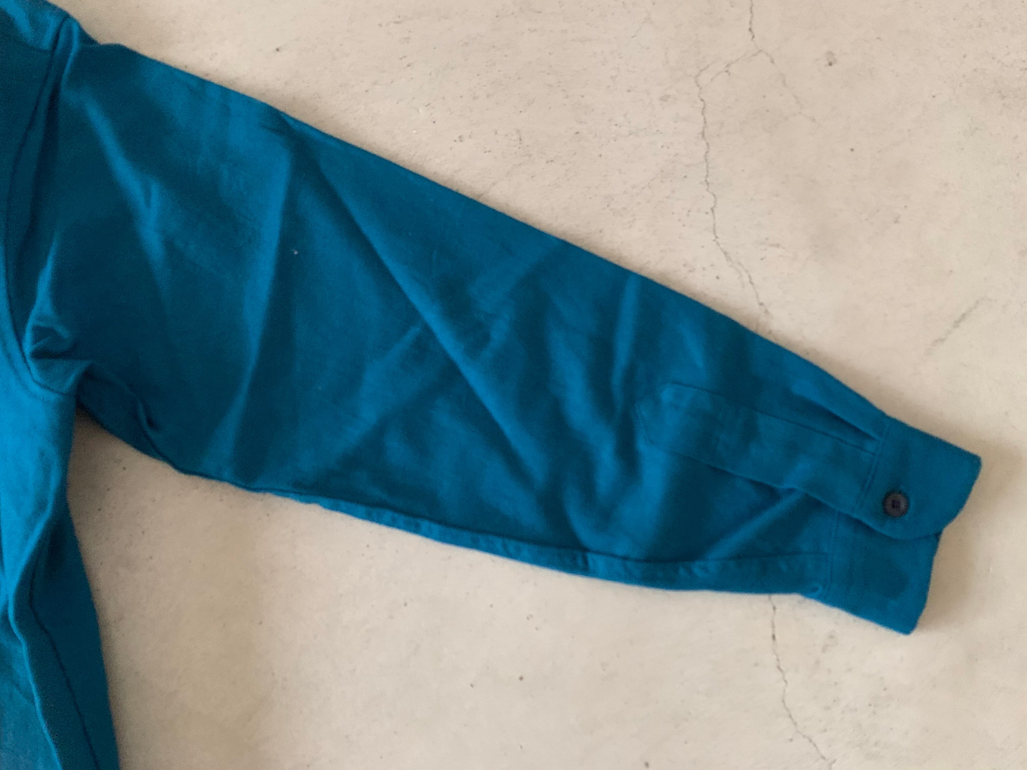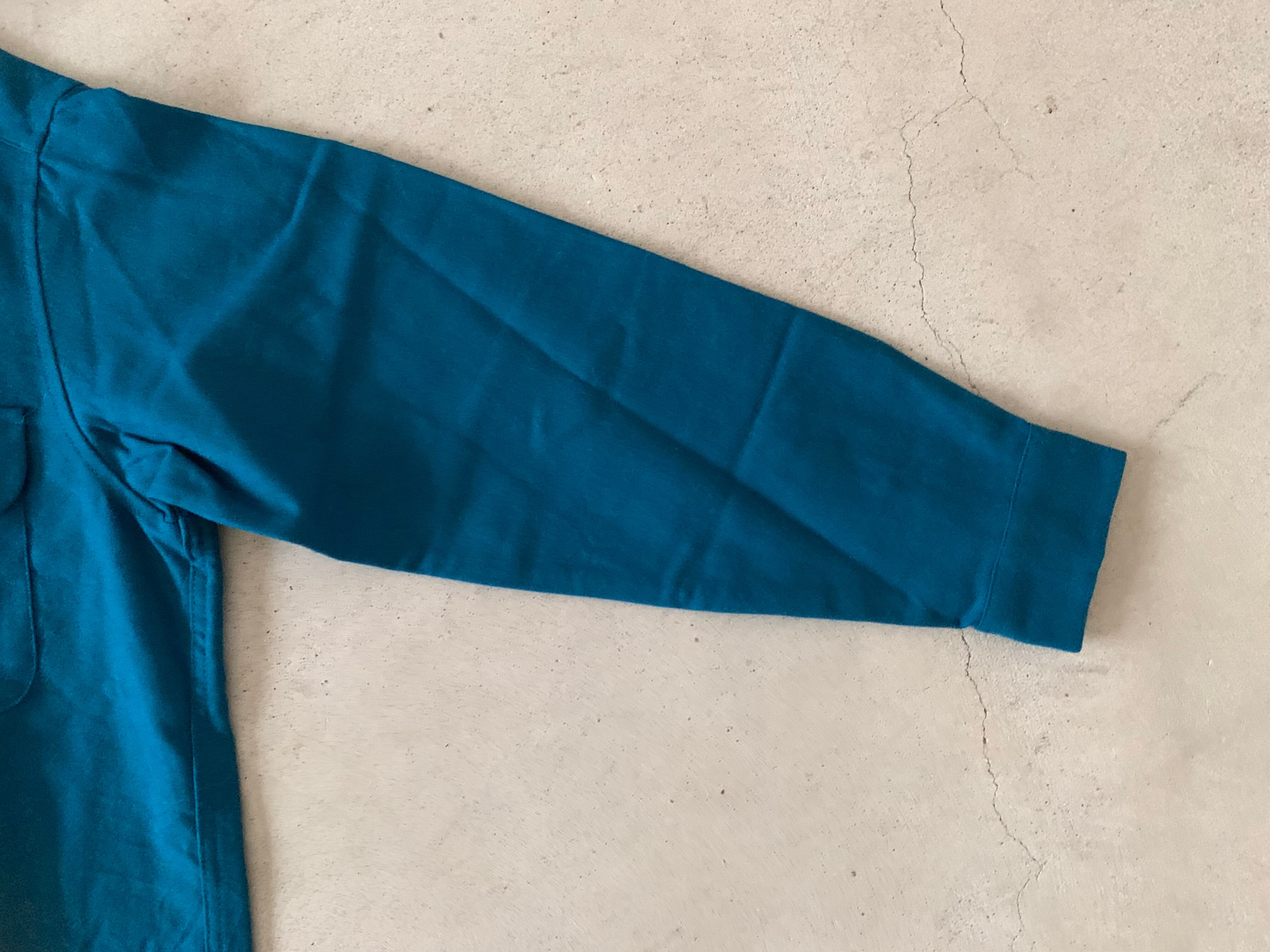 カラーは綺麗な青緑。ボックスシルエットでオープンカラー仕様。