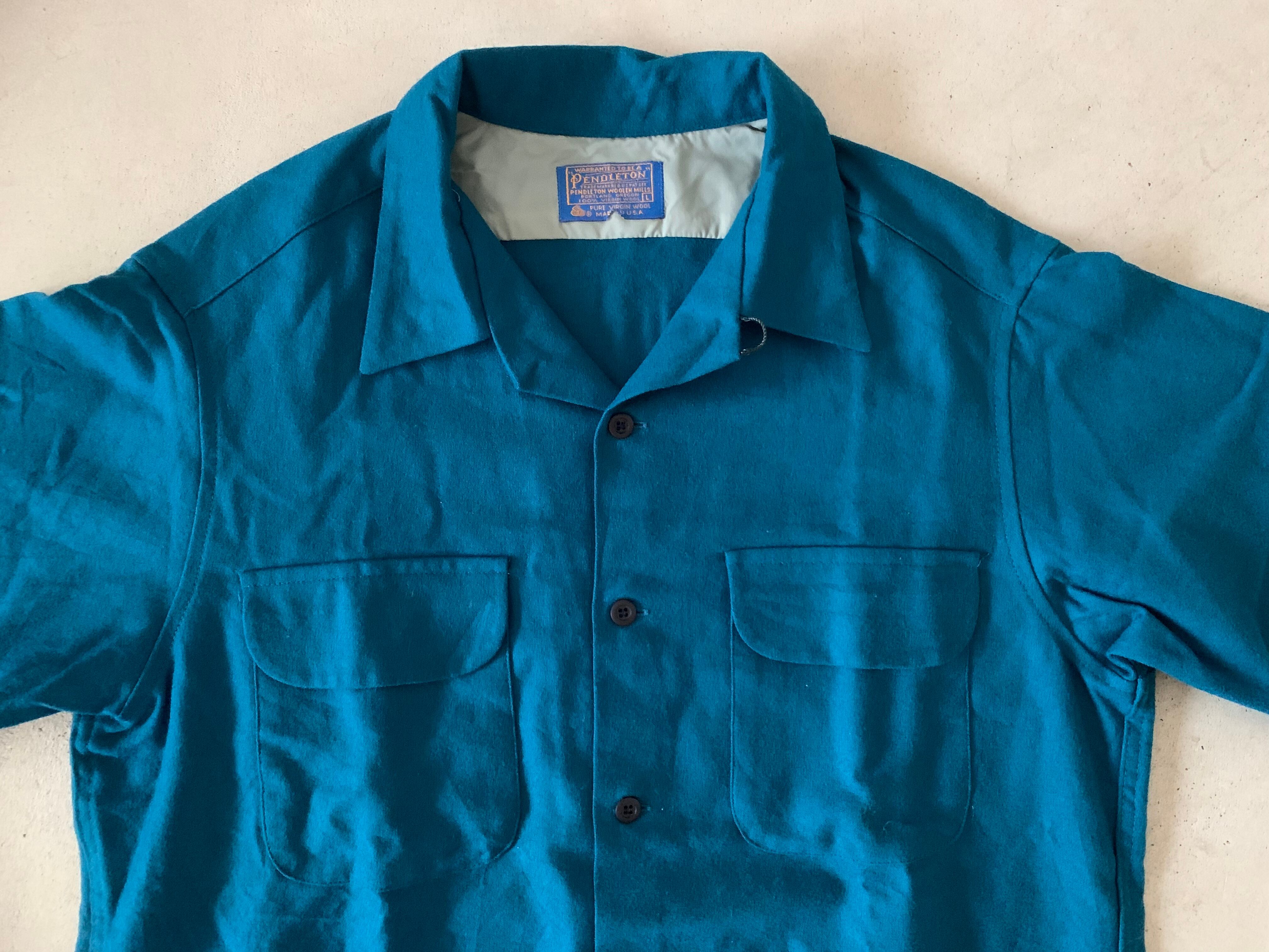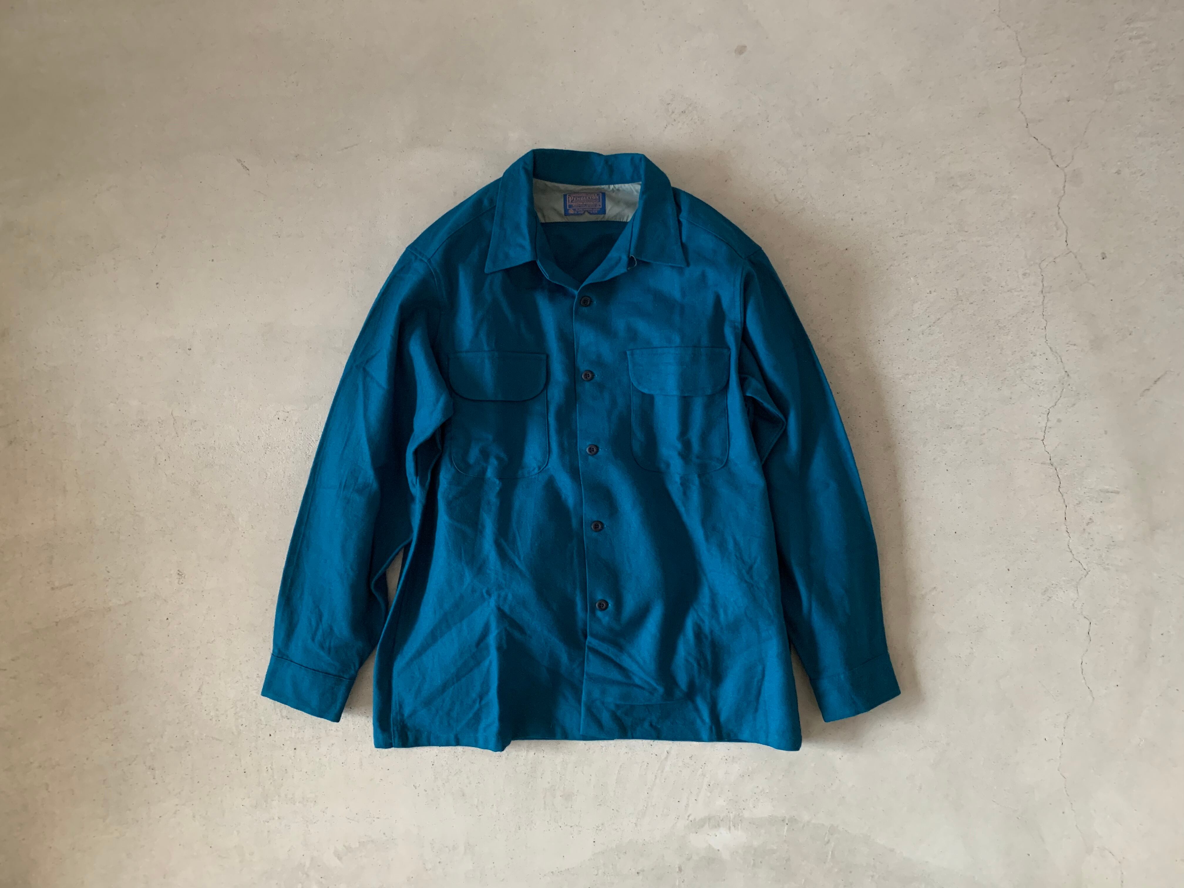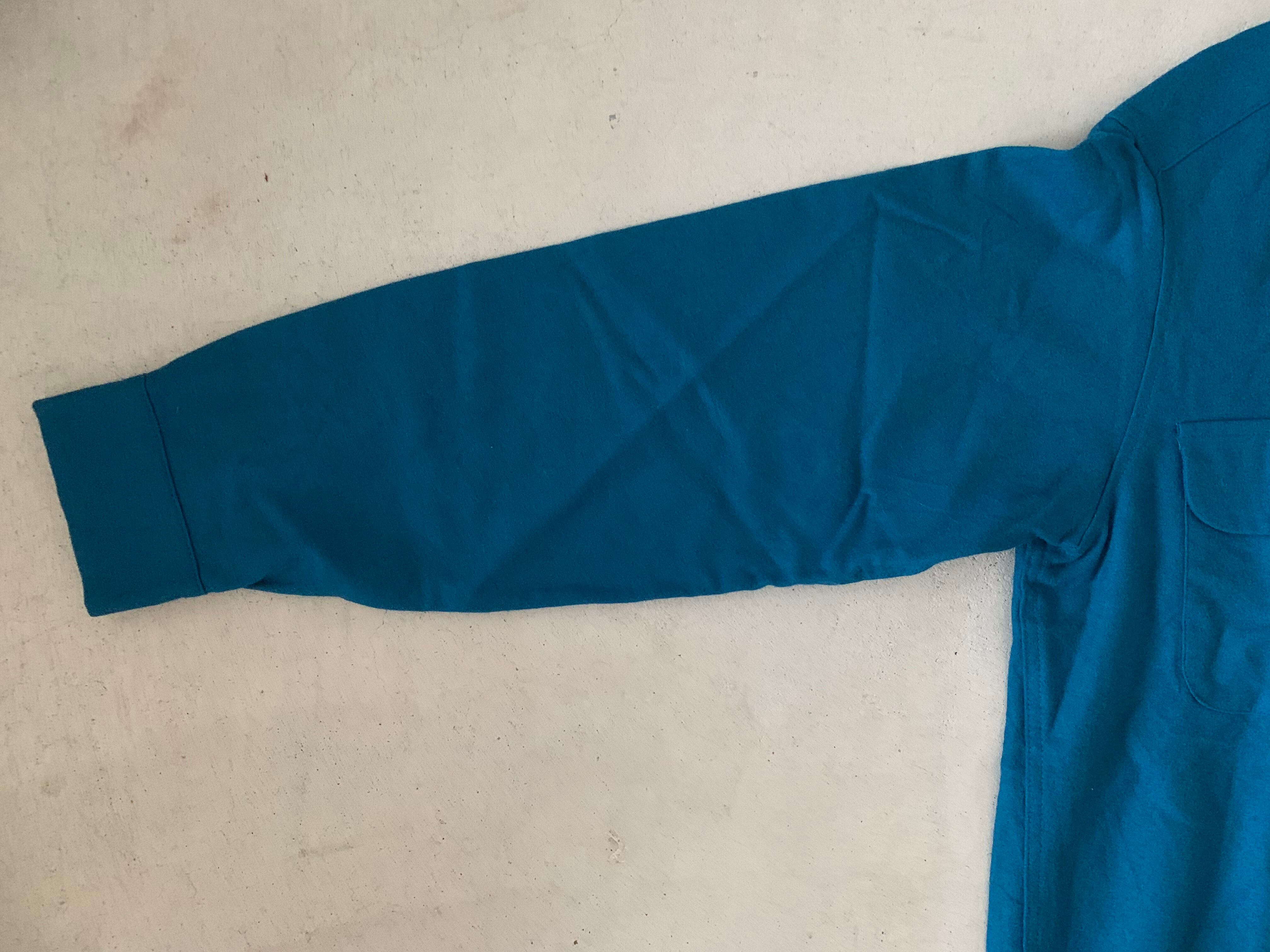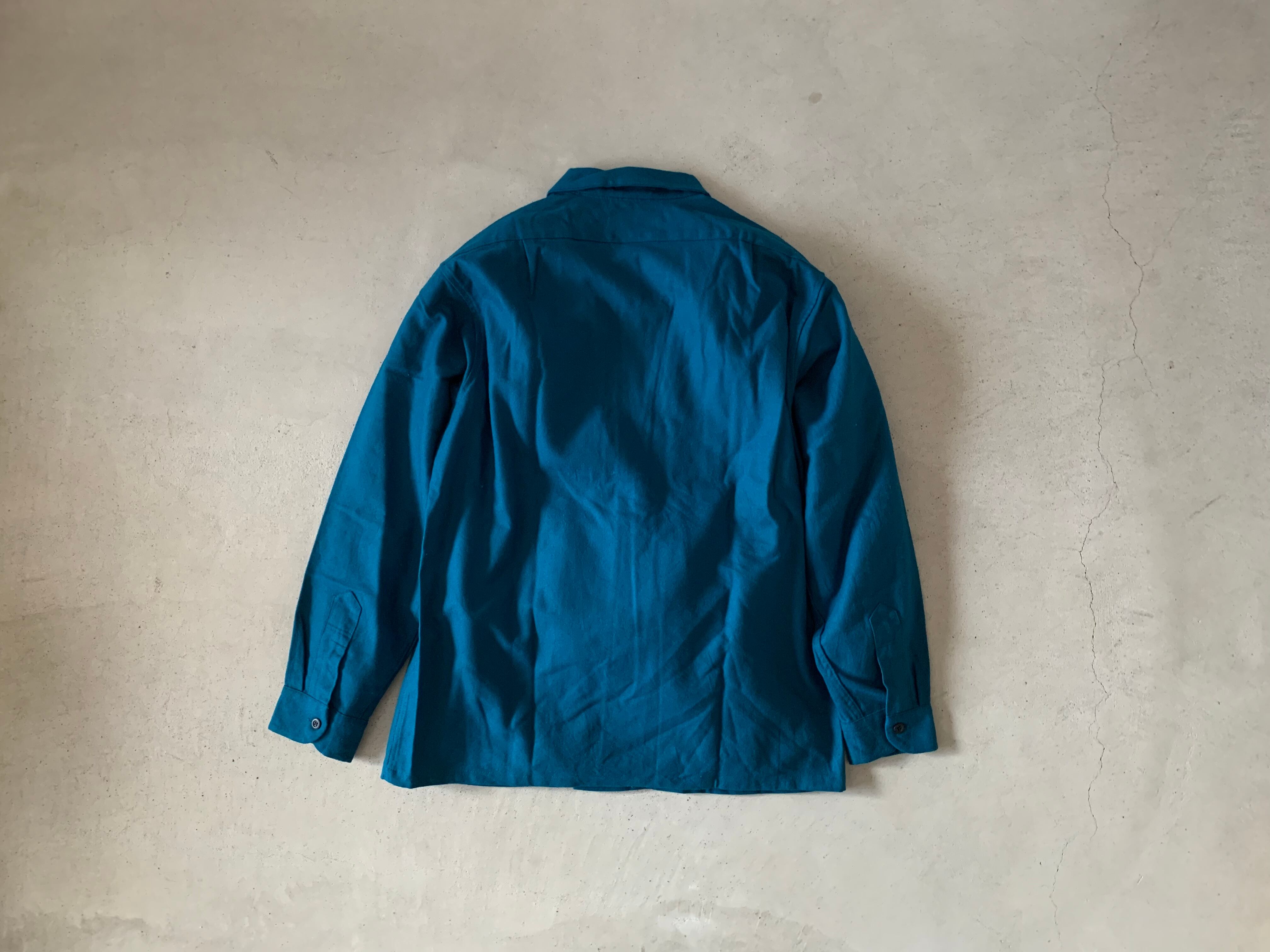 カラーは綺麗な青緑。ボックスシルエットでオープンカラー仕様。