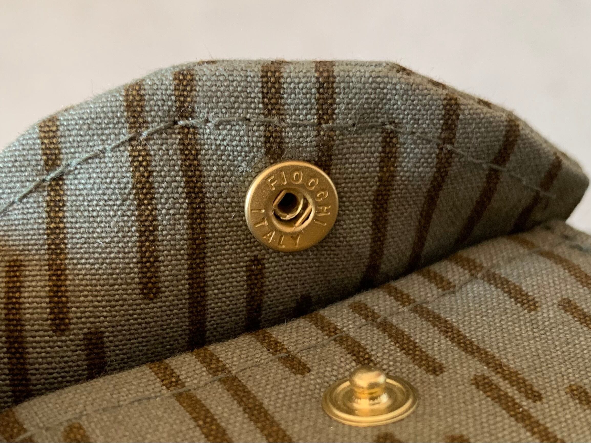 コインポケットのスナップボタンはフィオッキ。イタリア系の高級ブランドが好んで使用していたボタンですが、今は生産されておらず、貴重なデッドストックの物を使用しております。