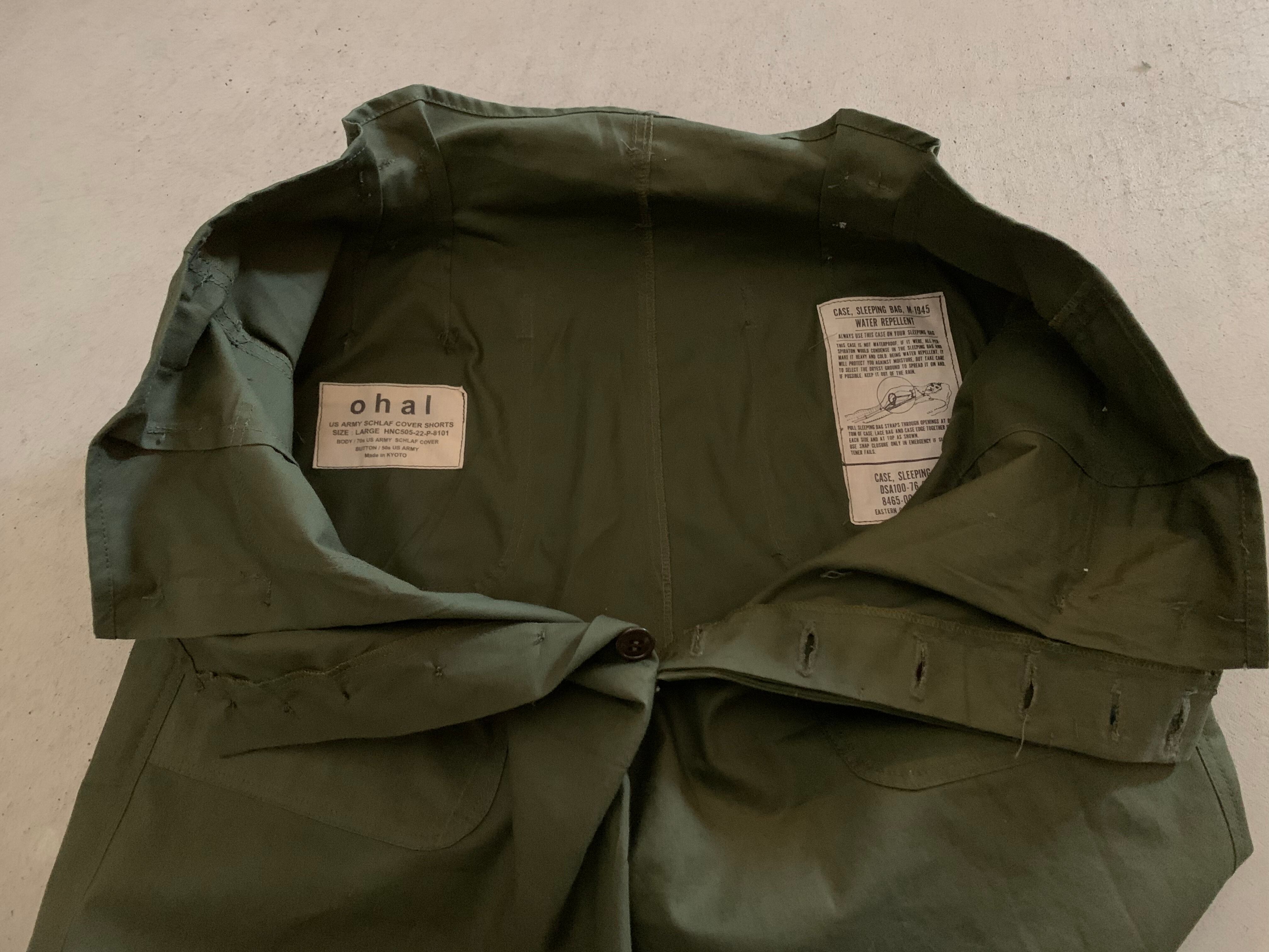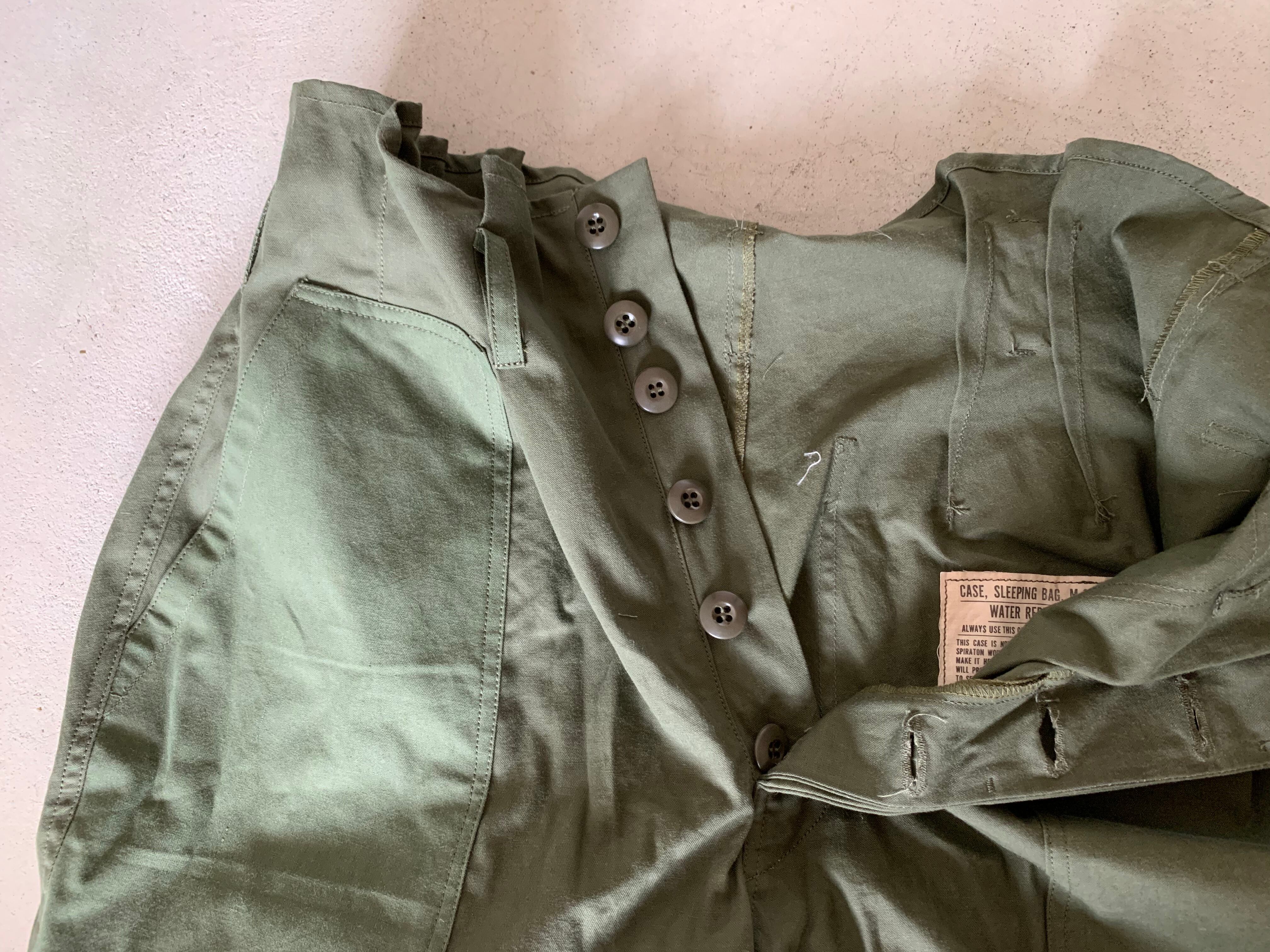 素材は米軍で1940年代〜70年代にかけて採用されていたスリーピングバッグケースを解体した物を使っております。コットン100%で撥水性があり、通気性の良い素材感。一年通して使える生地かと思います。糸はヴィンテージの雰囲気を損なわないように、30番手の綿糸で縫っております。
