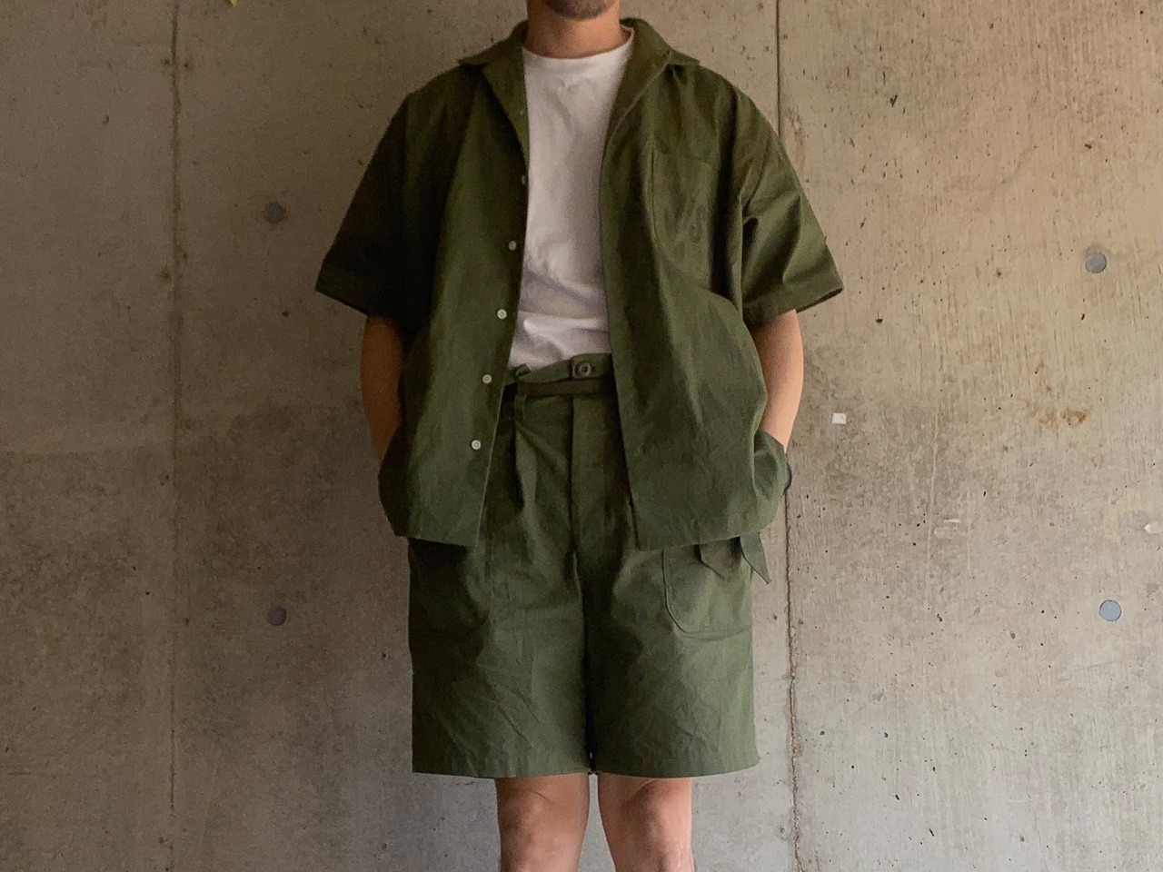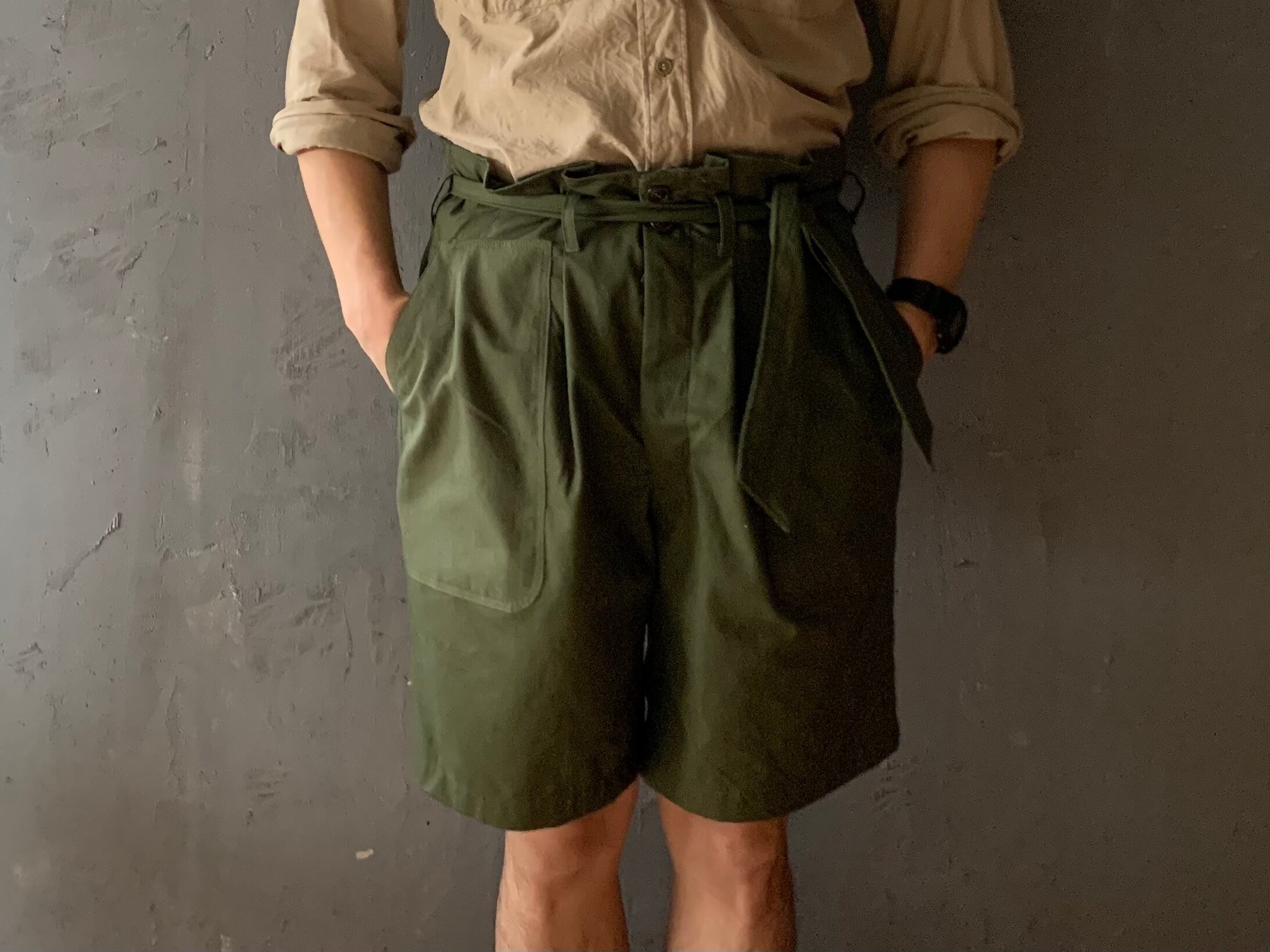 シルエットはイタリア軍のグルカショーツのサイズ感で作っており、履いた時にウエストがクシュッとギャザーができるようデザインしました。タックインをしてベルトでギュッとしめると独特な雰囲気がでます。