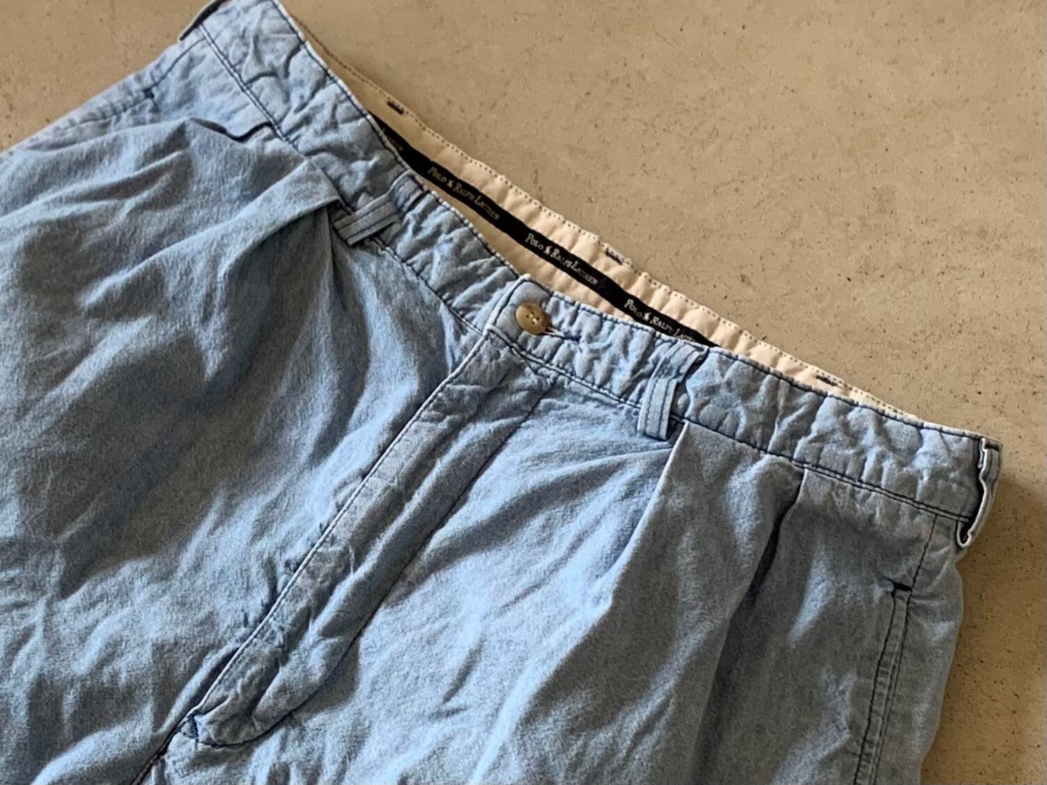 爽やかなサックスブルーのシャンブレー素材が好印象なラルフローレンのショートパンツ。ウエストにタックが入っており、履いた時のシルエットが今の気分にちょうどいいデザインです。