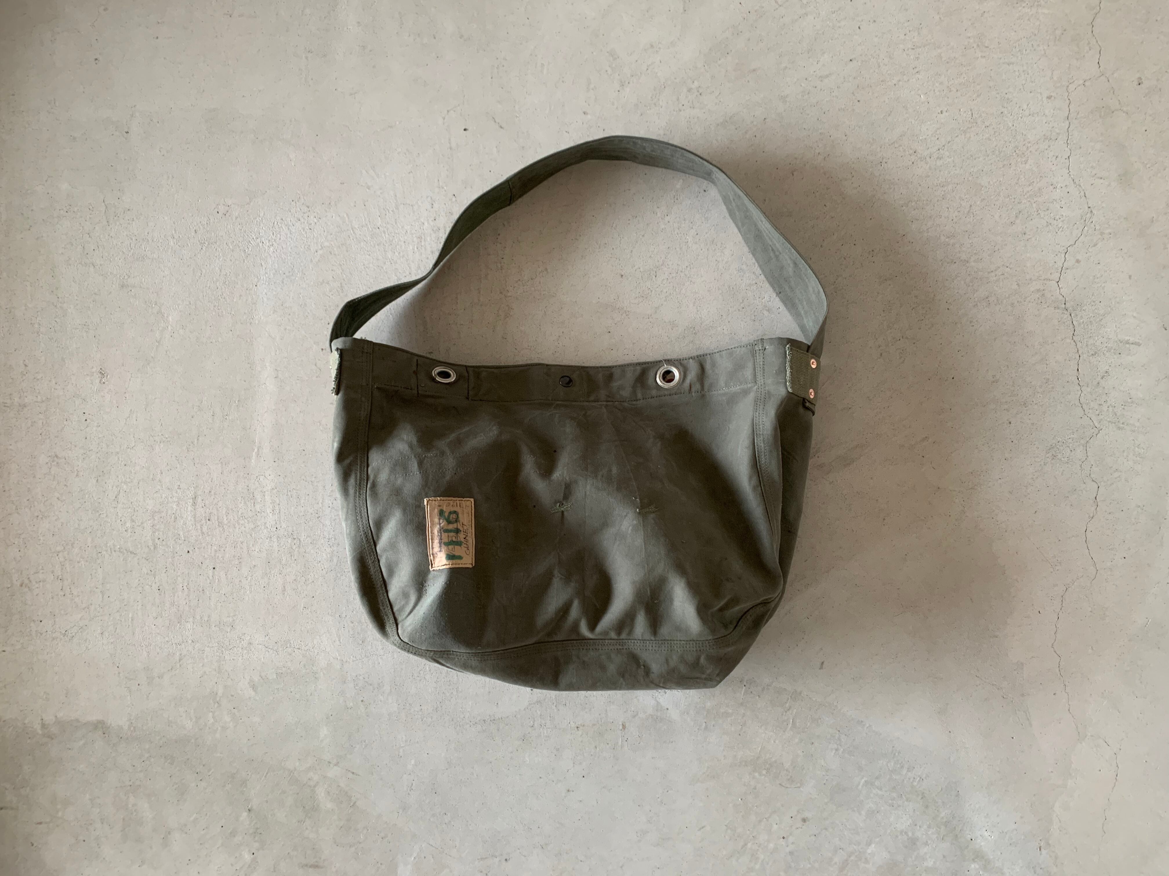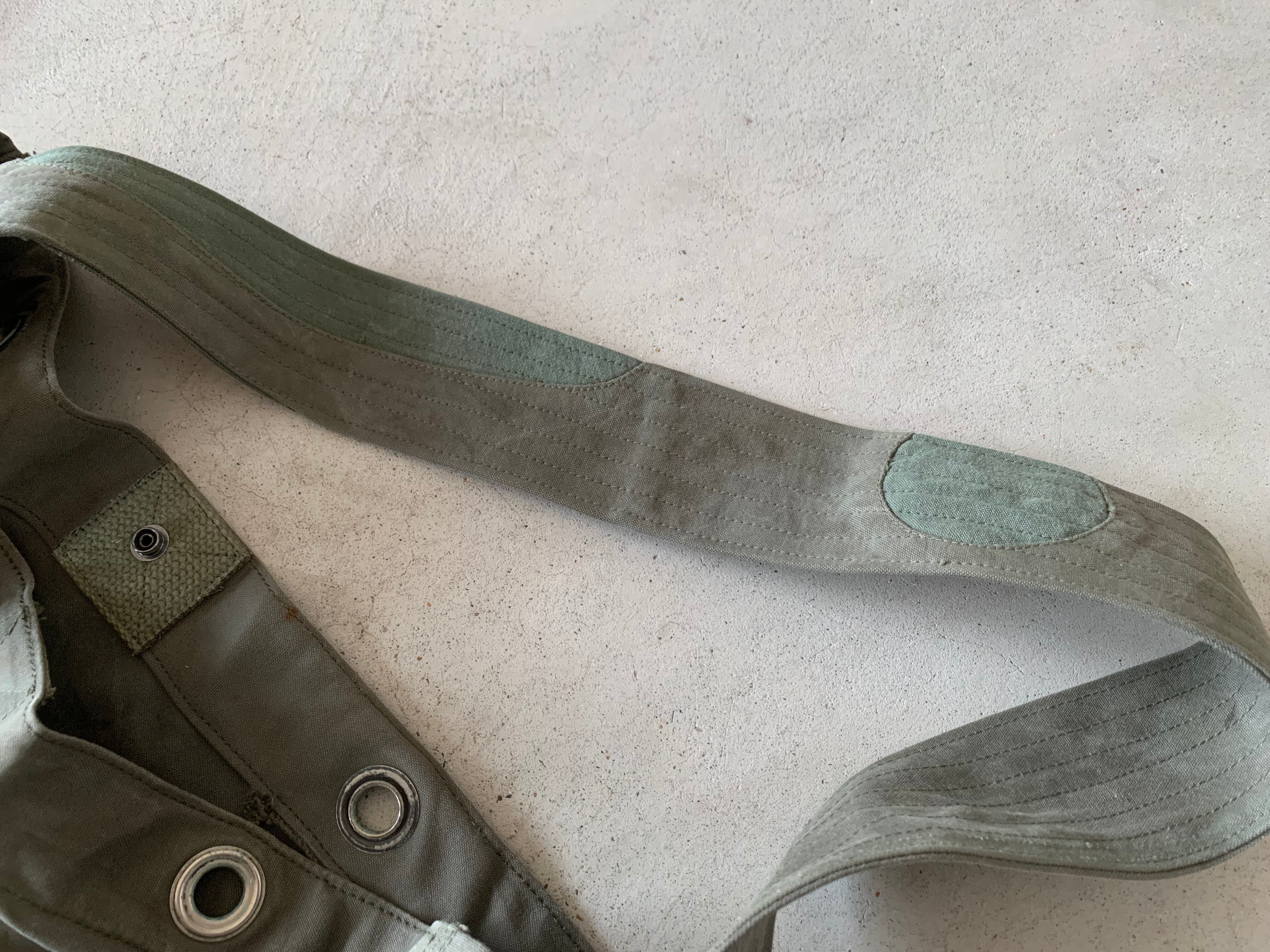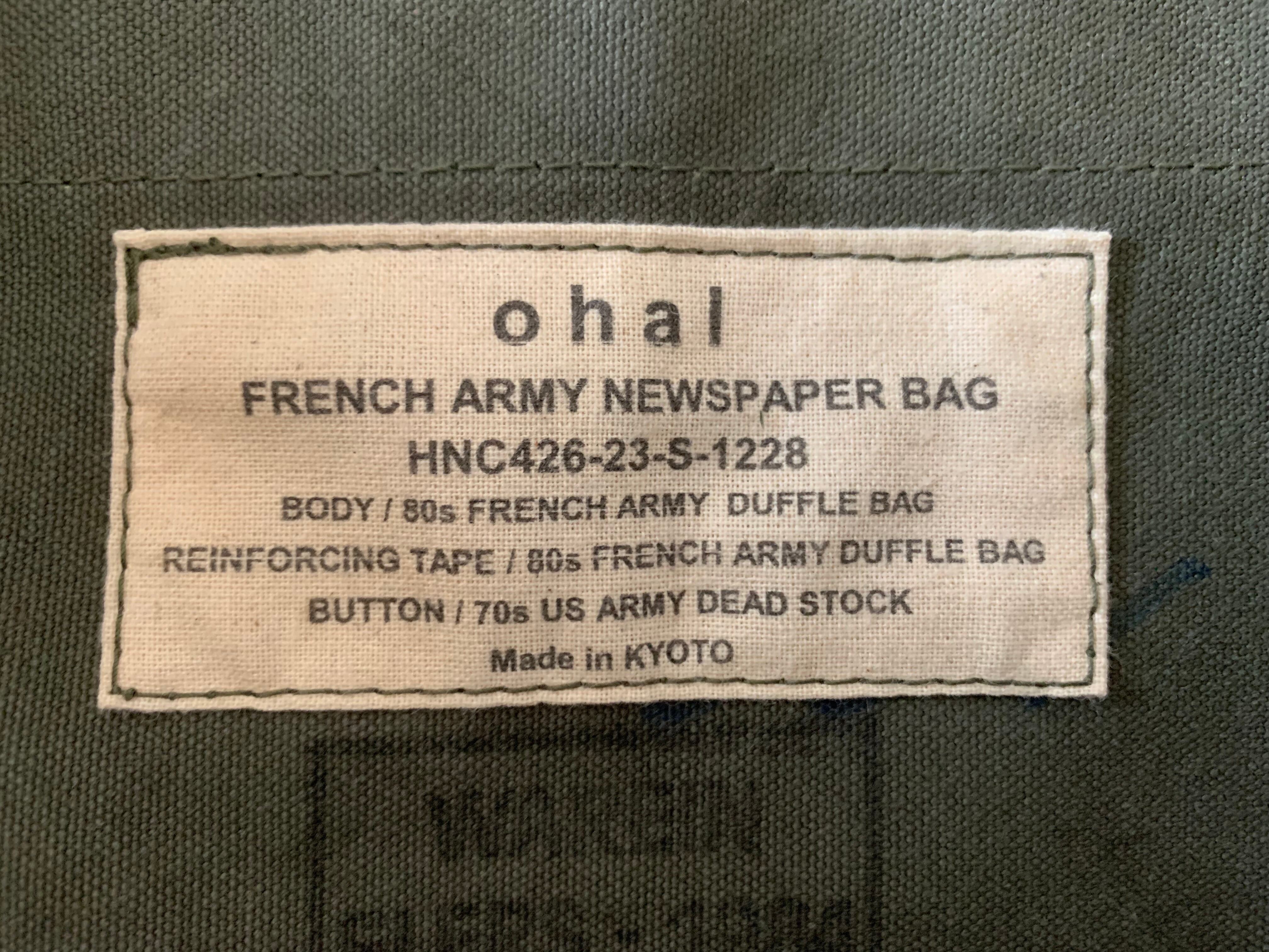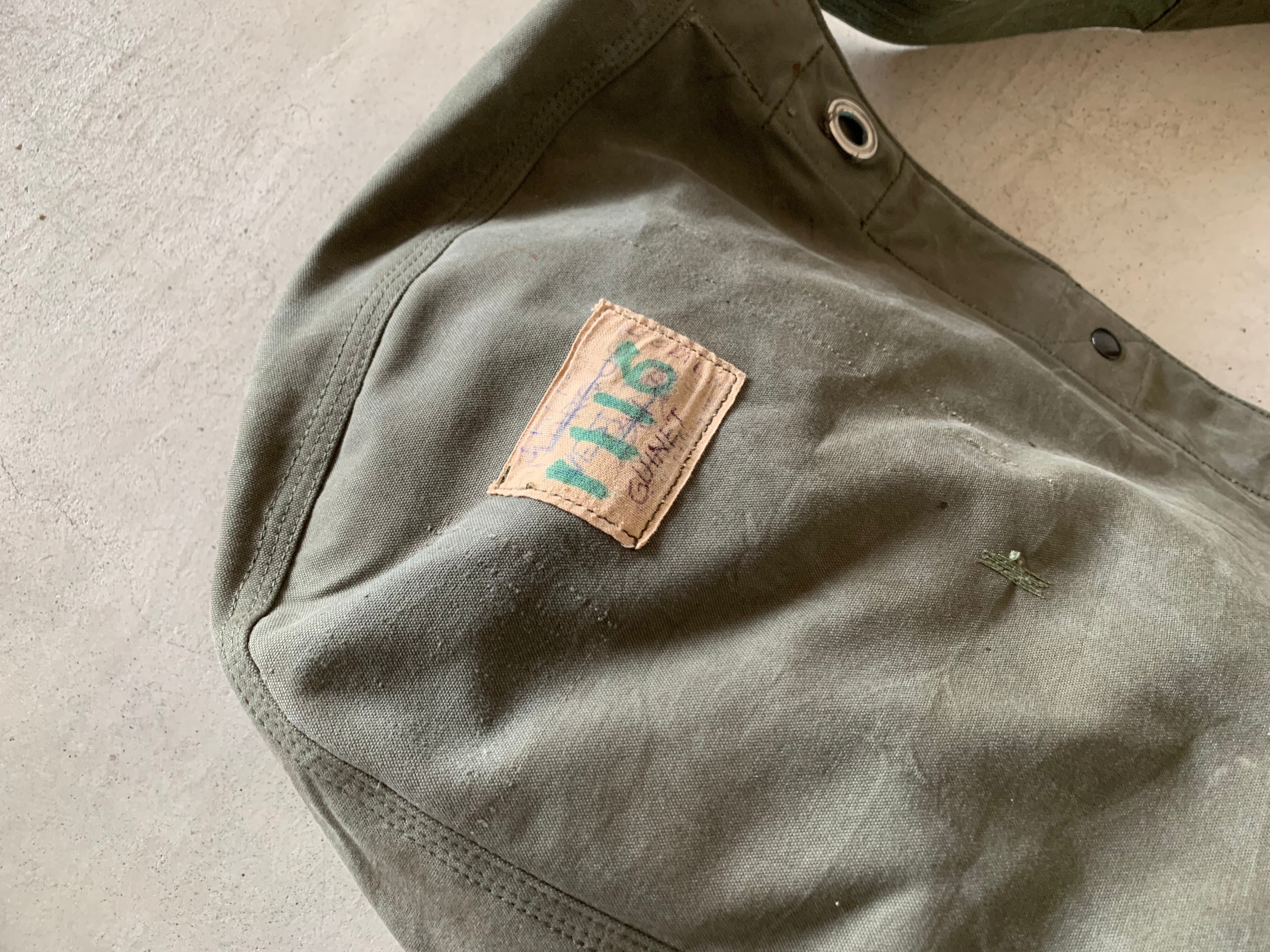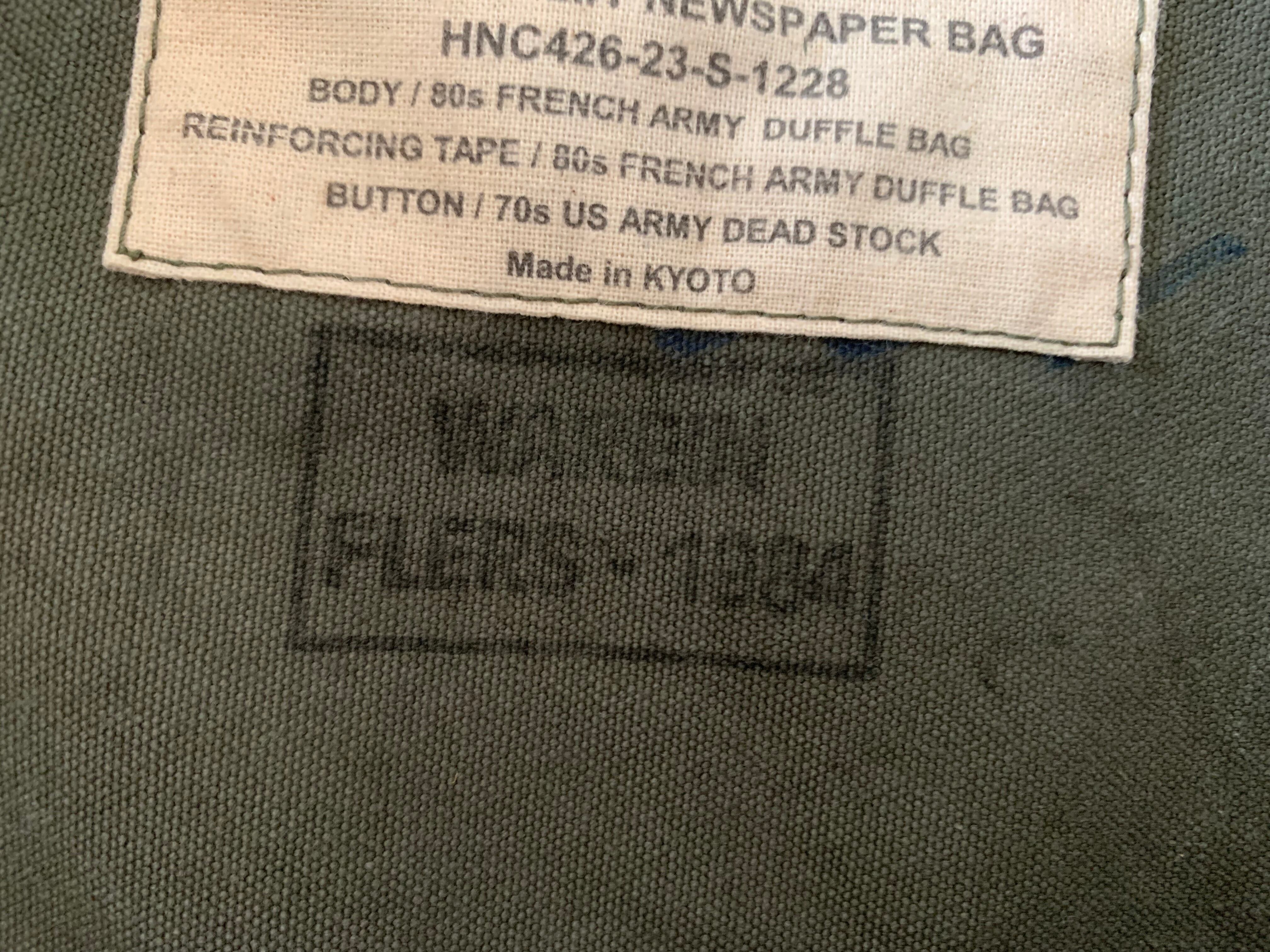 ボディーの生地は80年代、フランス軍のダッフルバッグ。素材はコットンキャンバス素材で、ヴィンテージの雰囲気満載です。前面にタグがあり、何か書かれています。左側にも手描きで書かれています。画像でご確認ください。