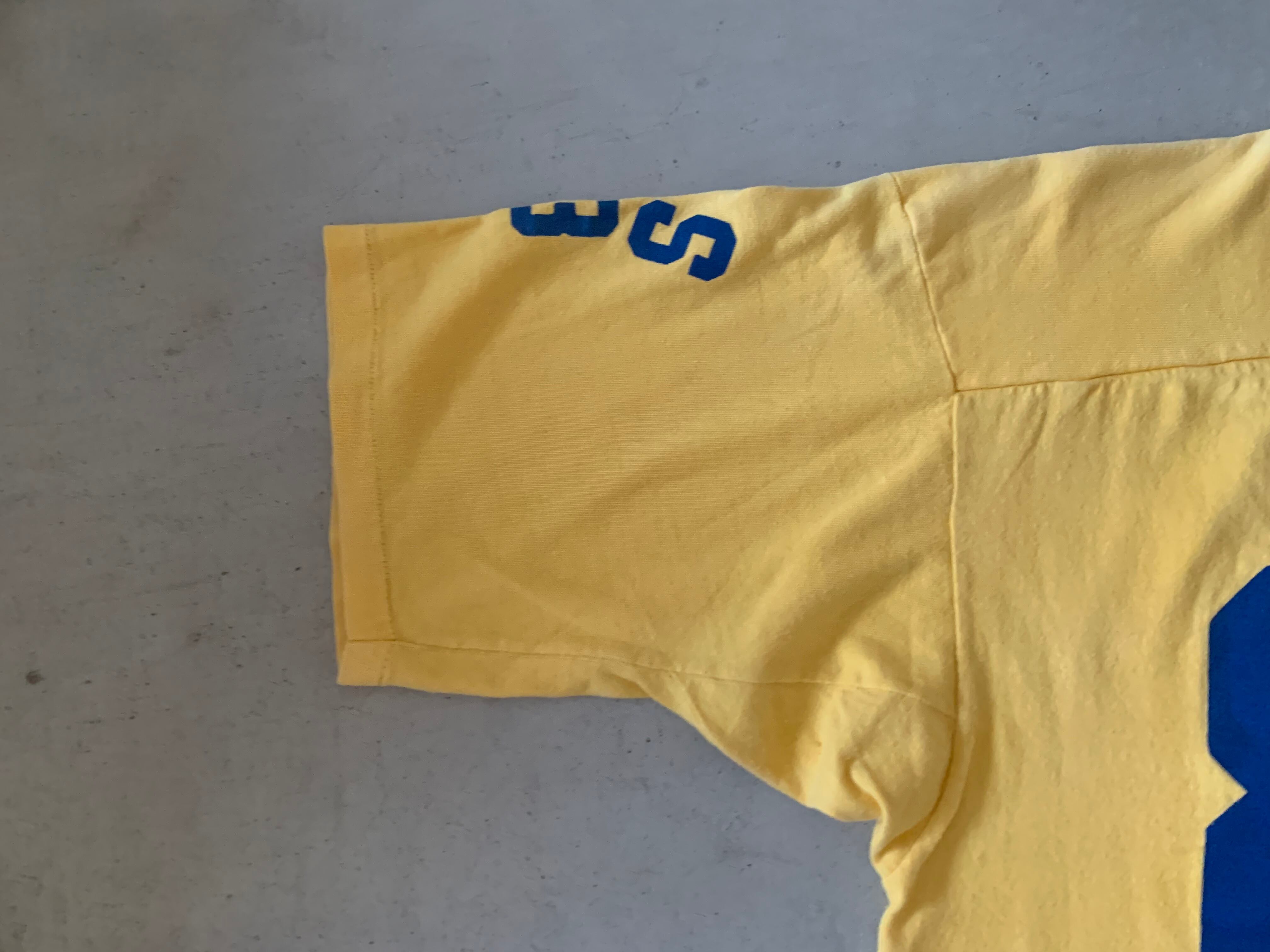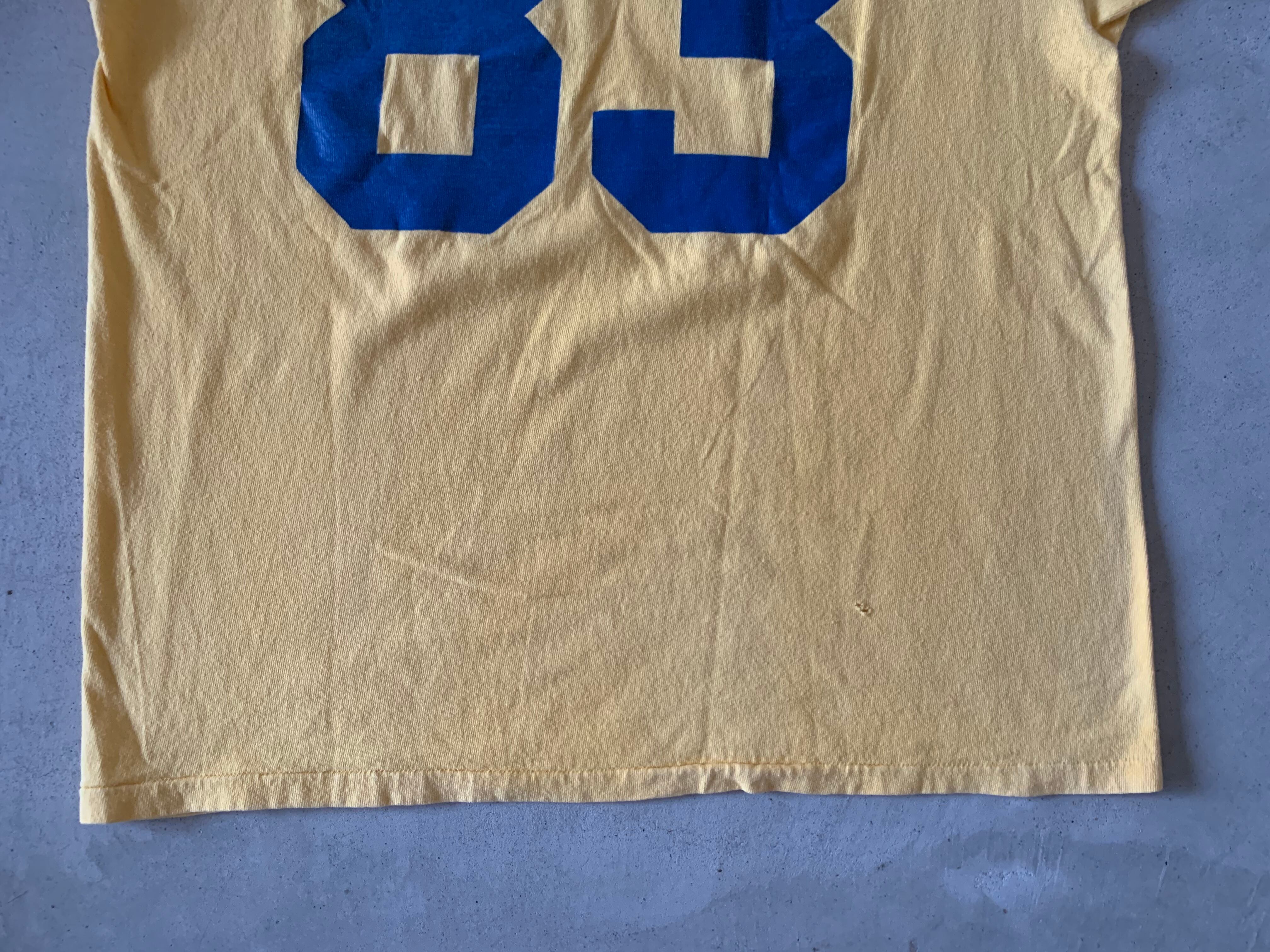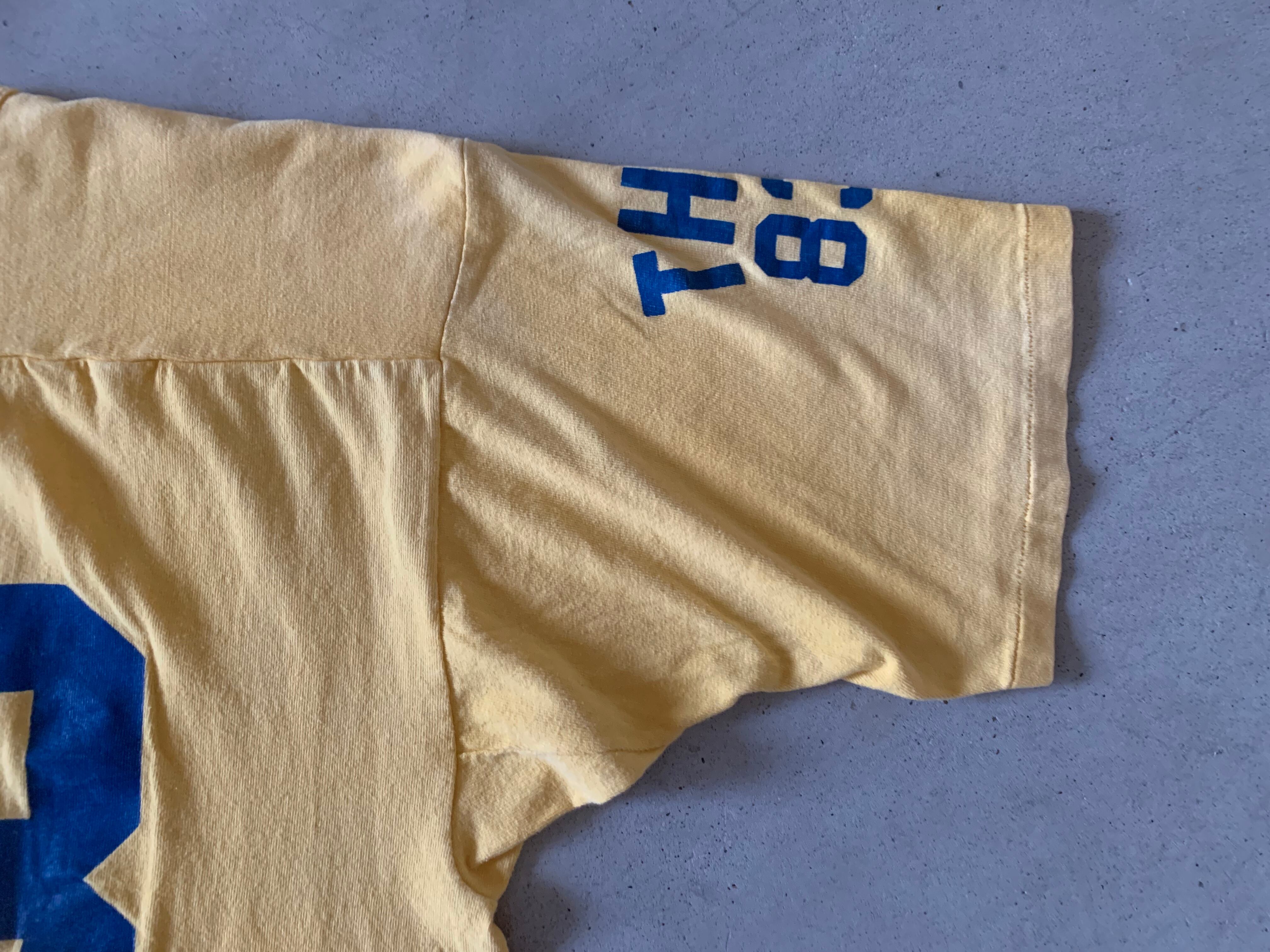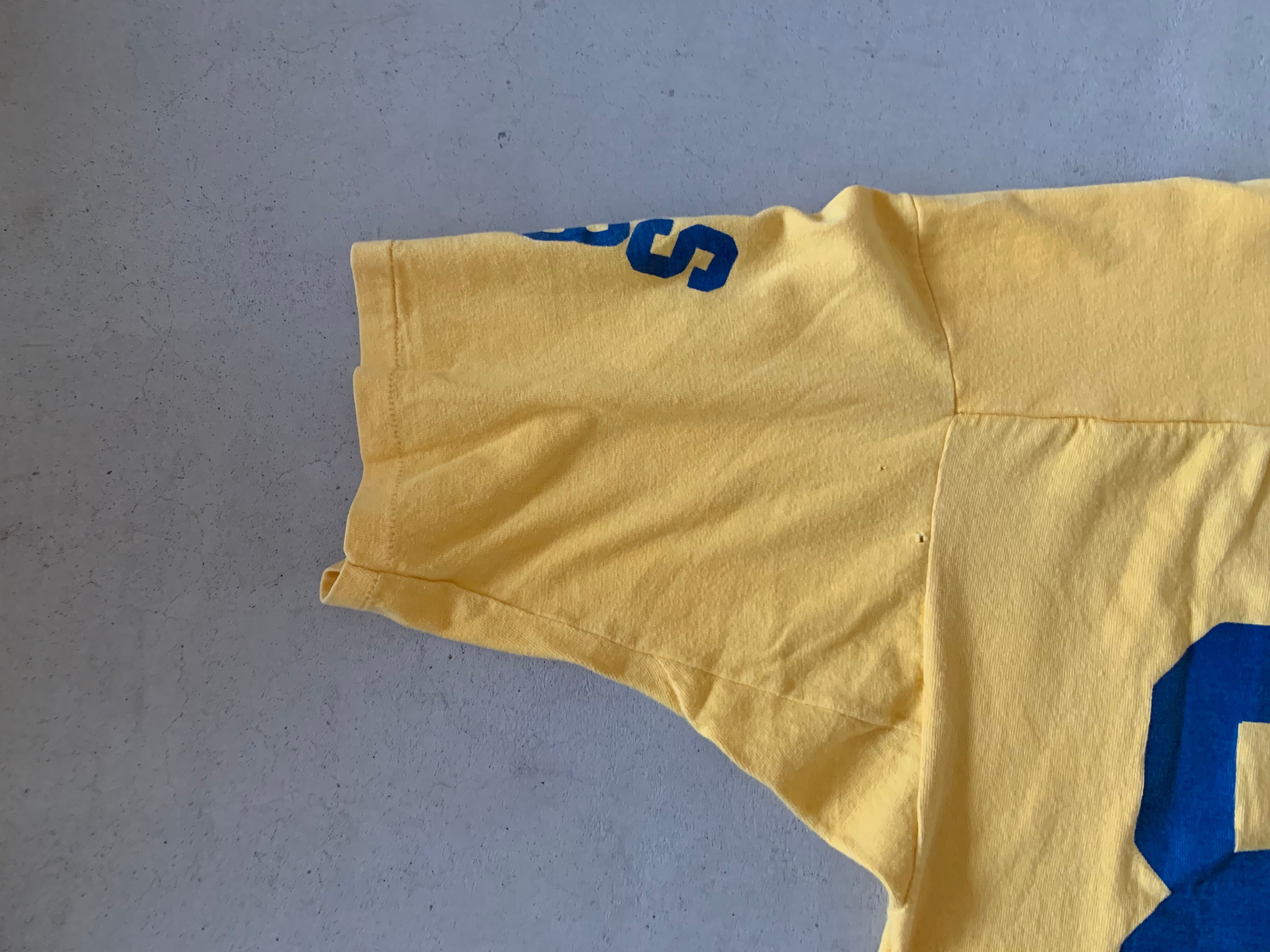 コットン物のフットボールTシャツで黄色はあまり出会ったことがありません。カーキのミリタリーパンツやブルーのデニムパンツなどとも相性が良さそうです。