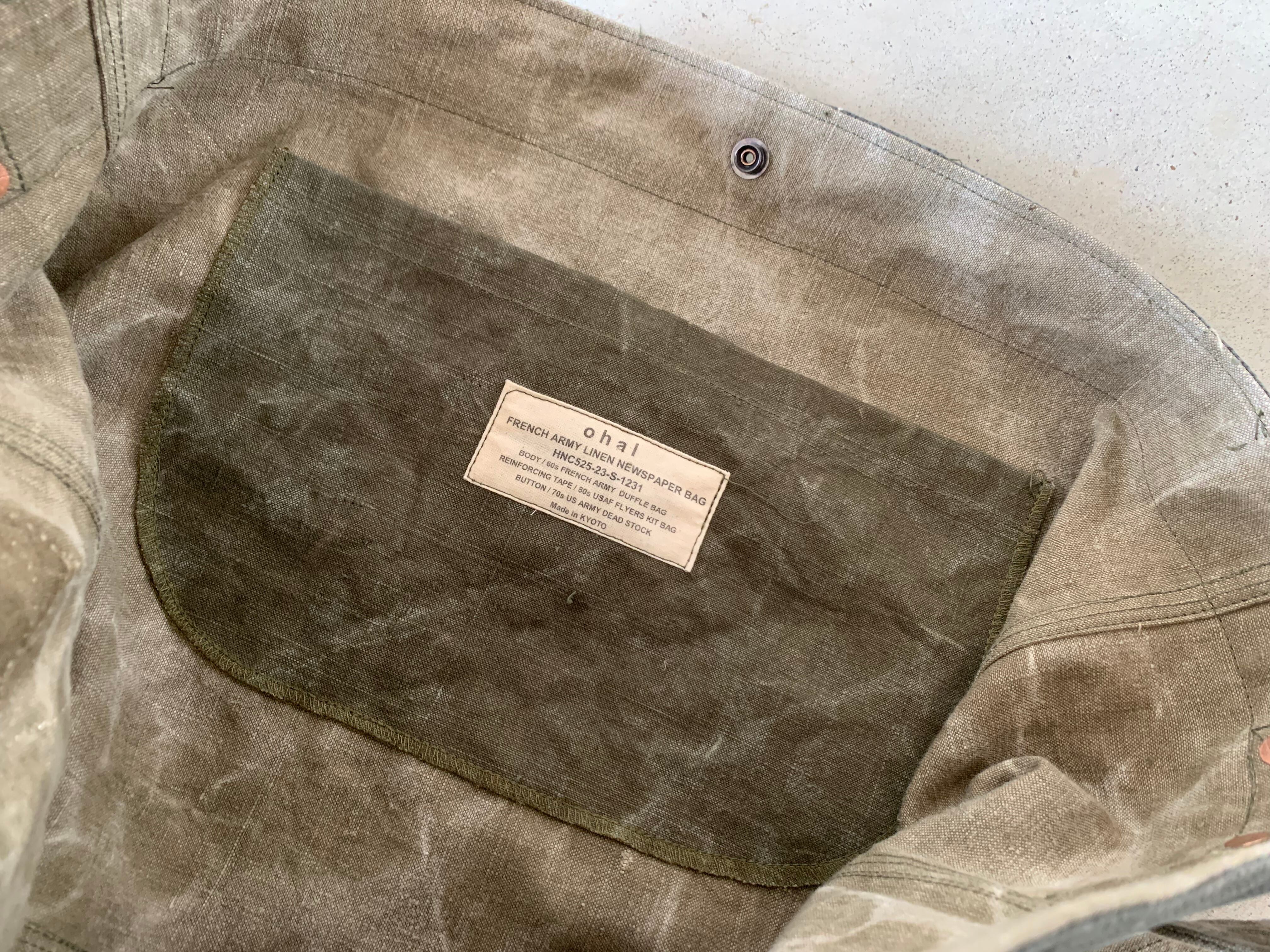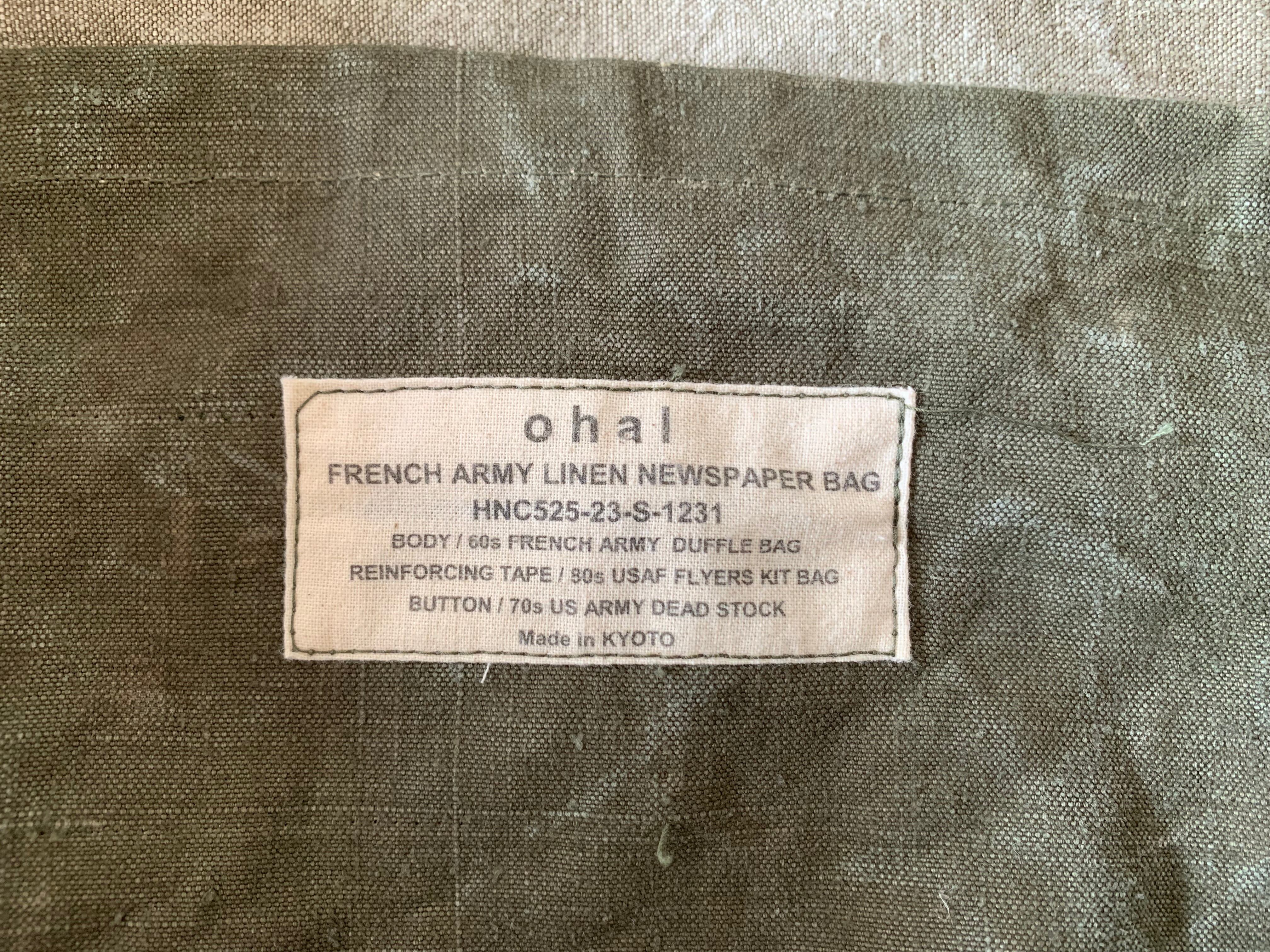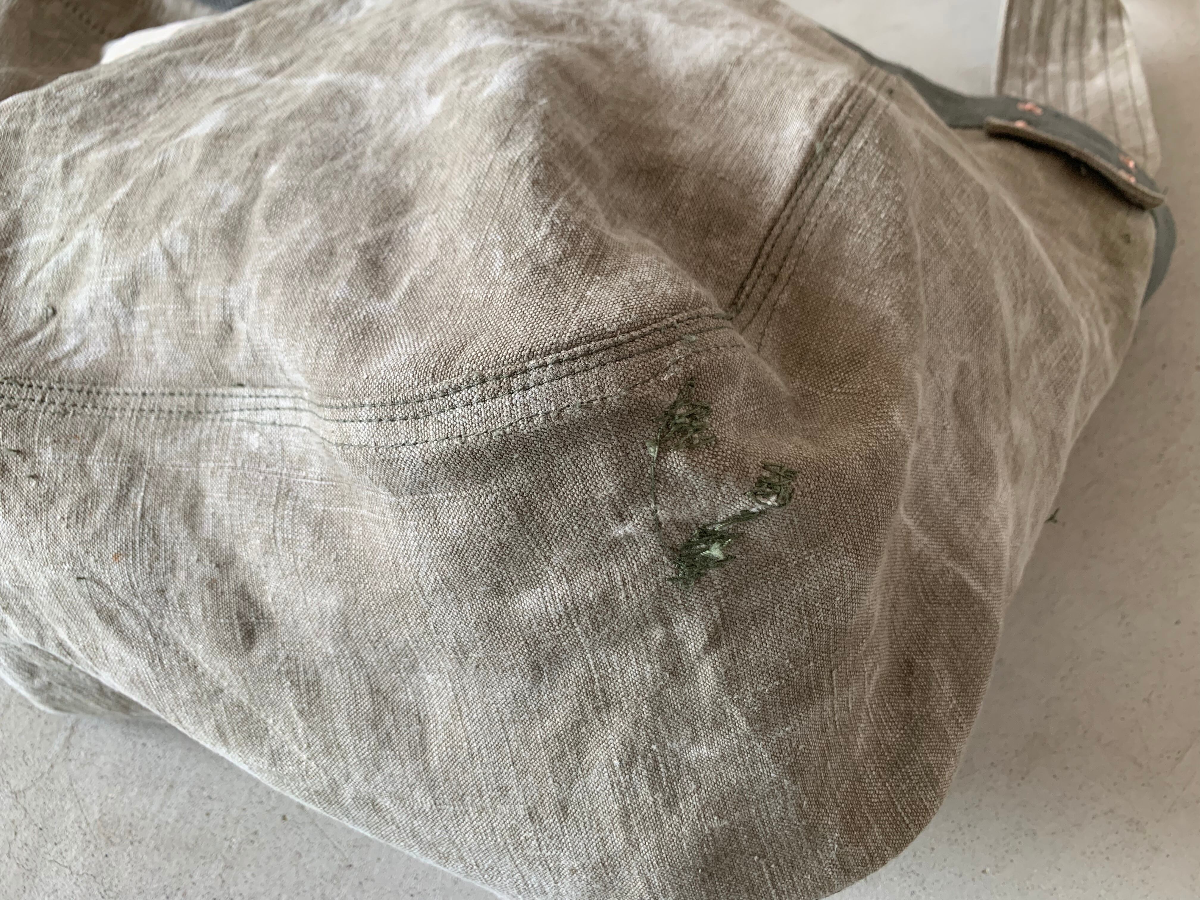 ボディーの生地は60年代、フランス軍のダッフルバッグ。リネン素材で、独特のクタッとした素材感でヴィンテージの雰囲気満載です。開口部に補強のために巻いたキャンバステープはアメリカ空軍のフライヤーズキットバッグの持ち手で使用されていたキャンバステープを巻いています。