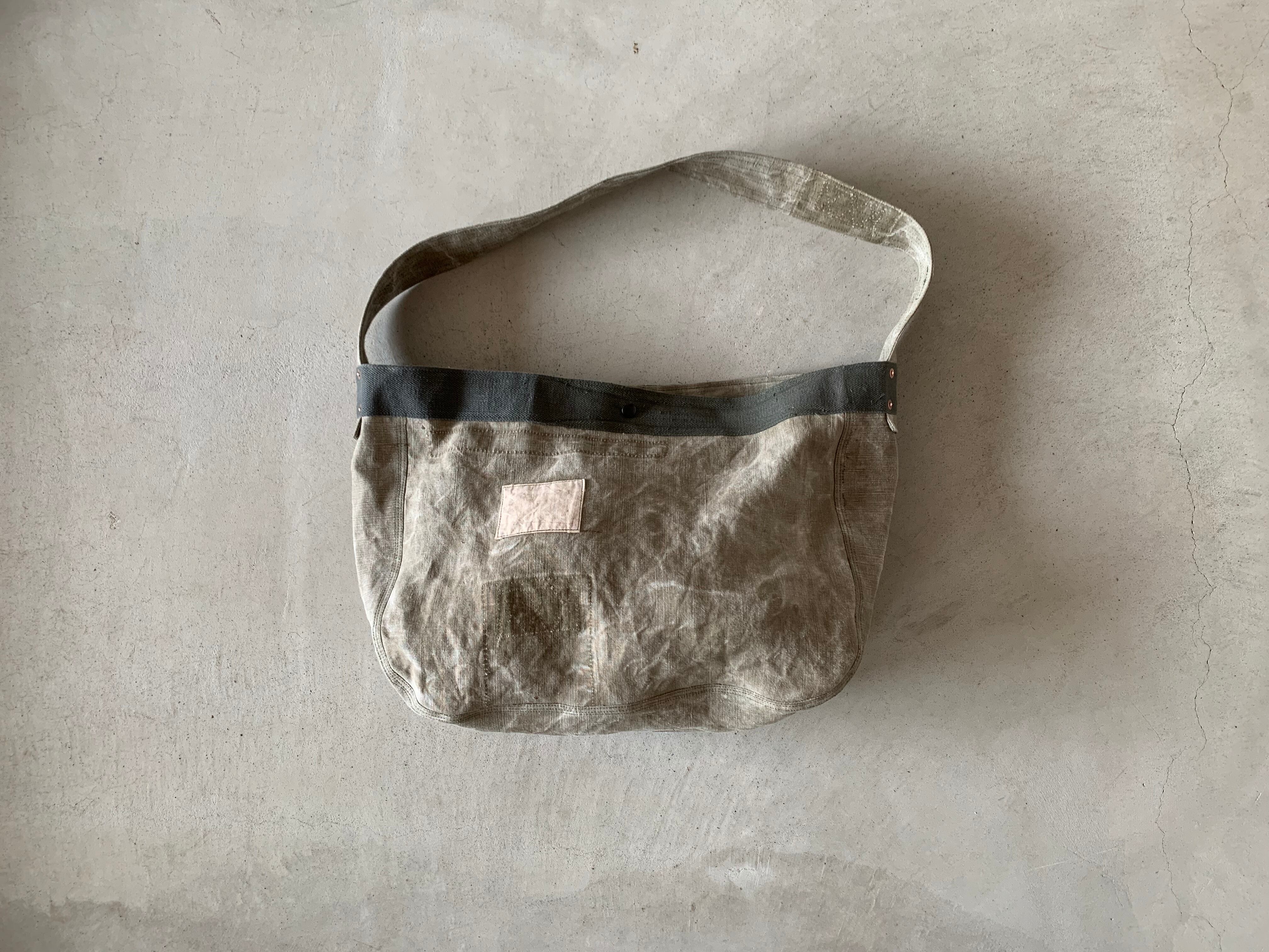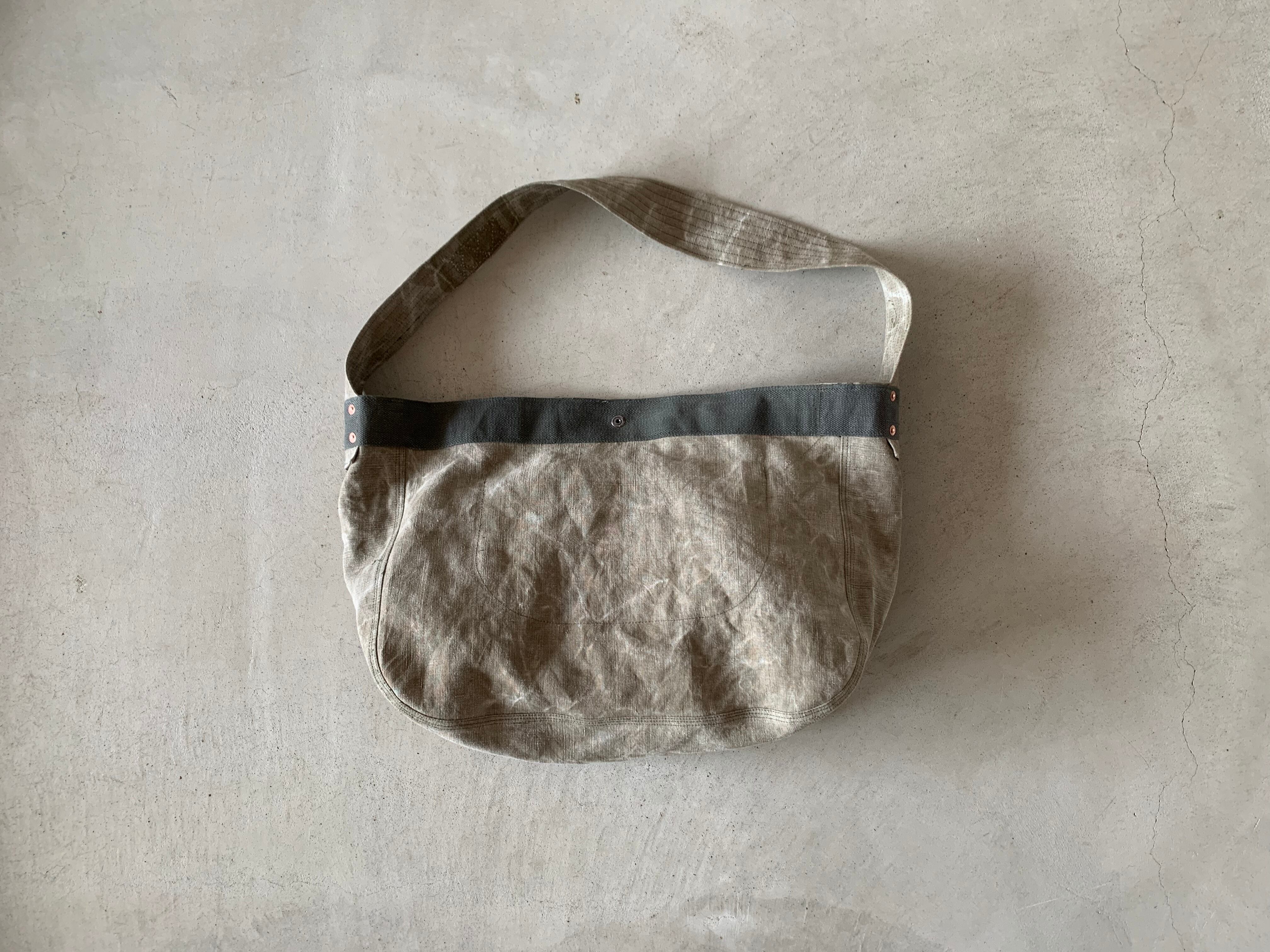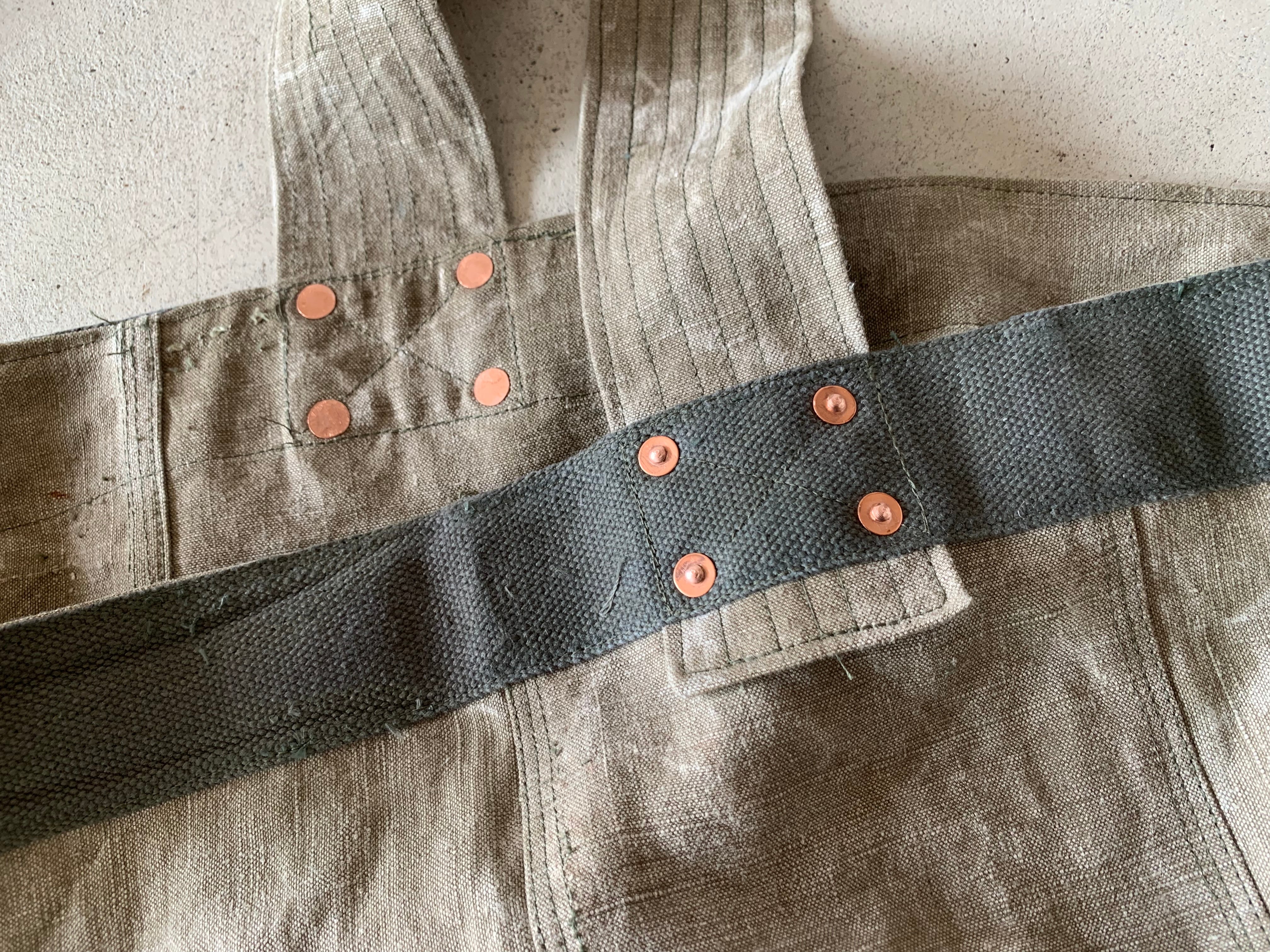ボディーの生地は60年代、フランス軍のダッフルバッグ。リネン素材で、独特のクタッとした素材感でヴィンテージの雰囲気満載です。開口部に補強のために巻いたキャンバステープはアメリカ空軍のフライヤーズキットバッグの持ち手で使用されていたキャンバステープを巻いています。