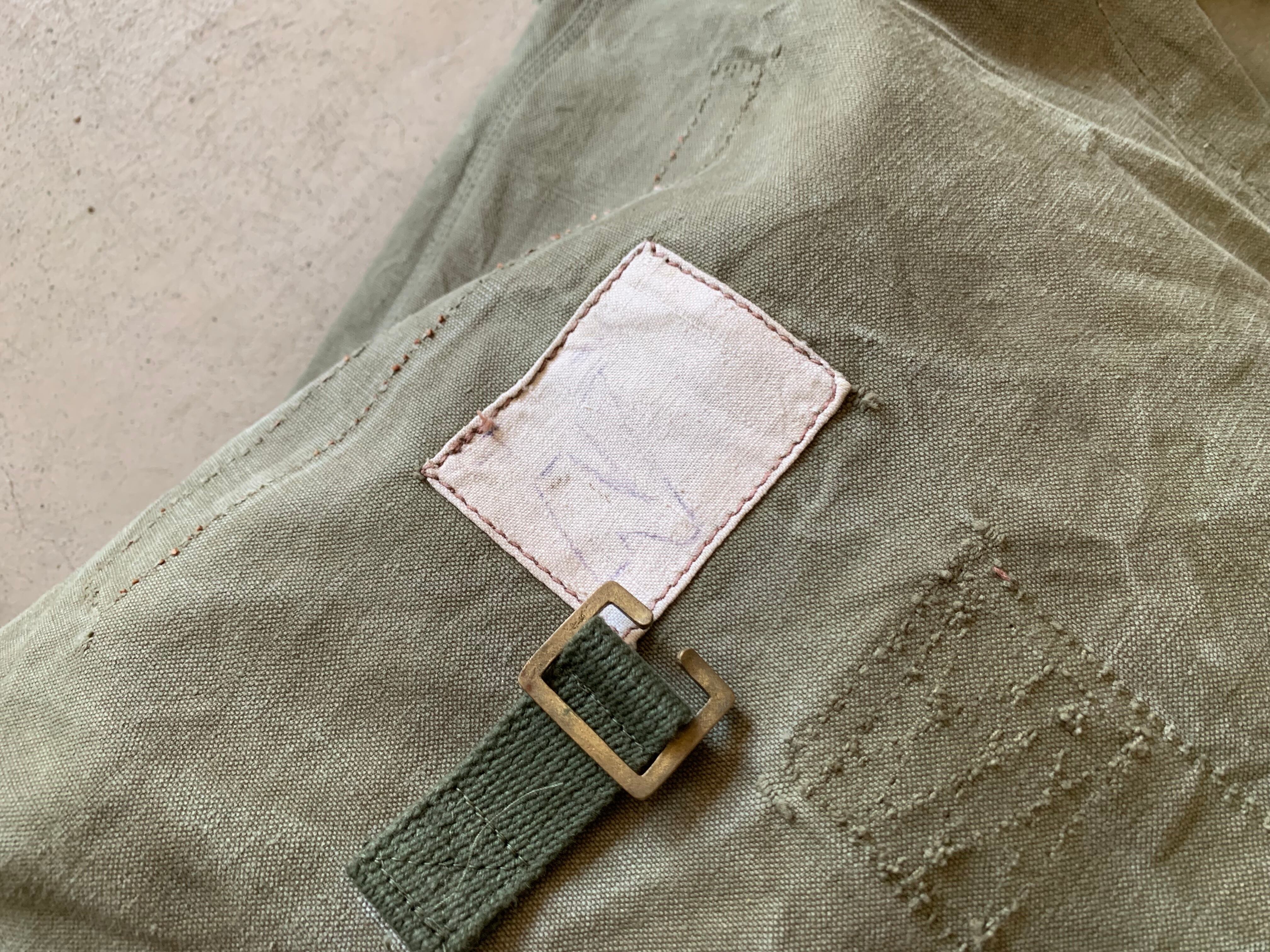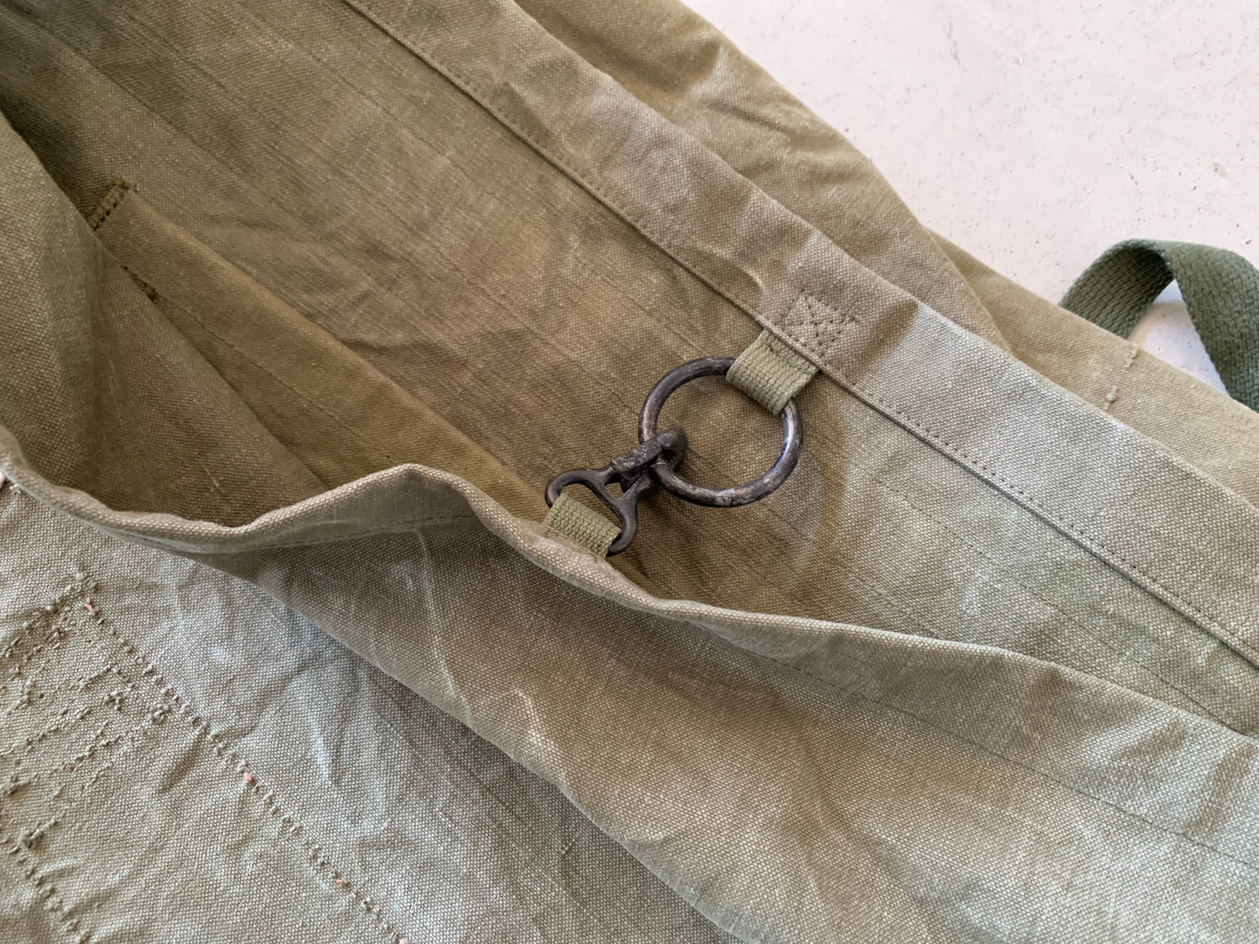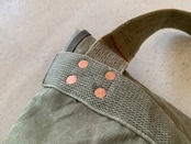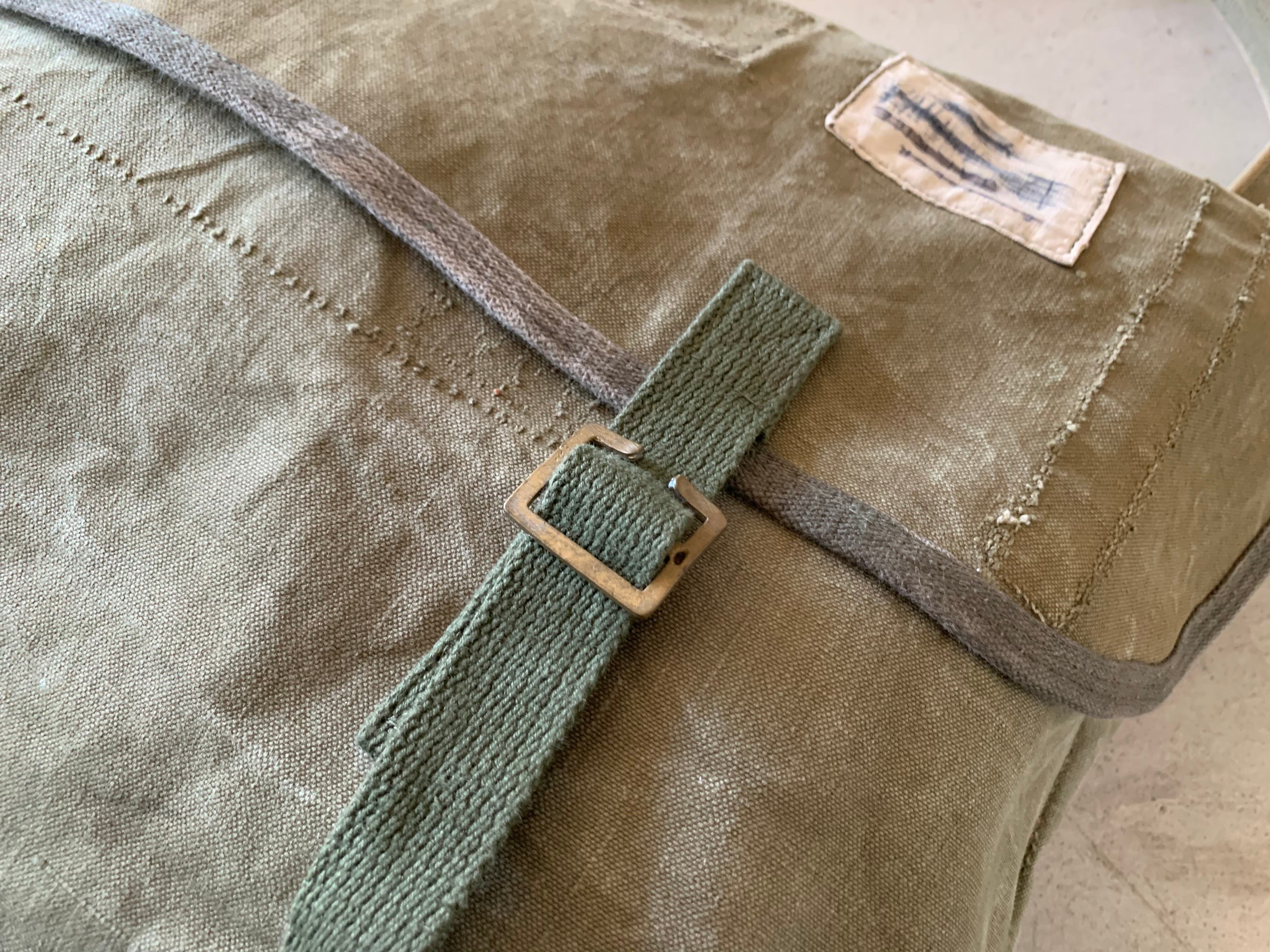 ボディーはフランス軍のダッフルバッグです。年代は50年代頃でおそらく麻(ヘンプ)が混合された、ガッシリとしたコットンキャンバス素材です。
