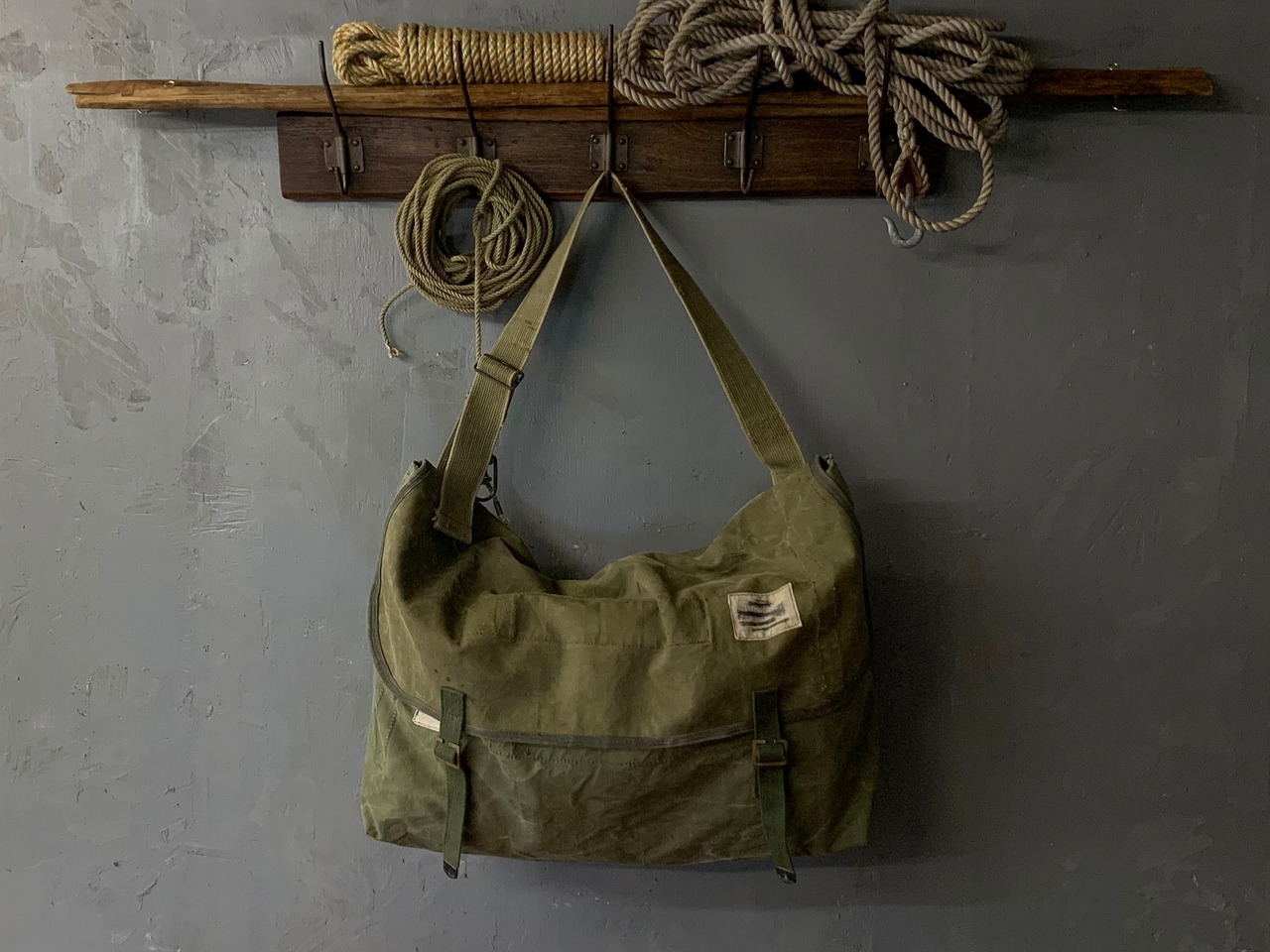 ヴィンテージのミリタリー素材を組み合わせて、かなり大きめのメッセンジャーバッグを作りました。