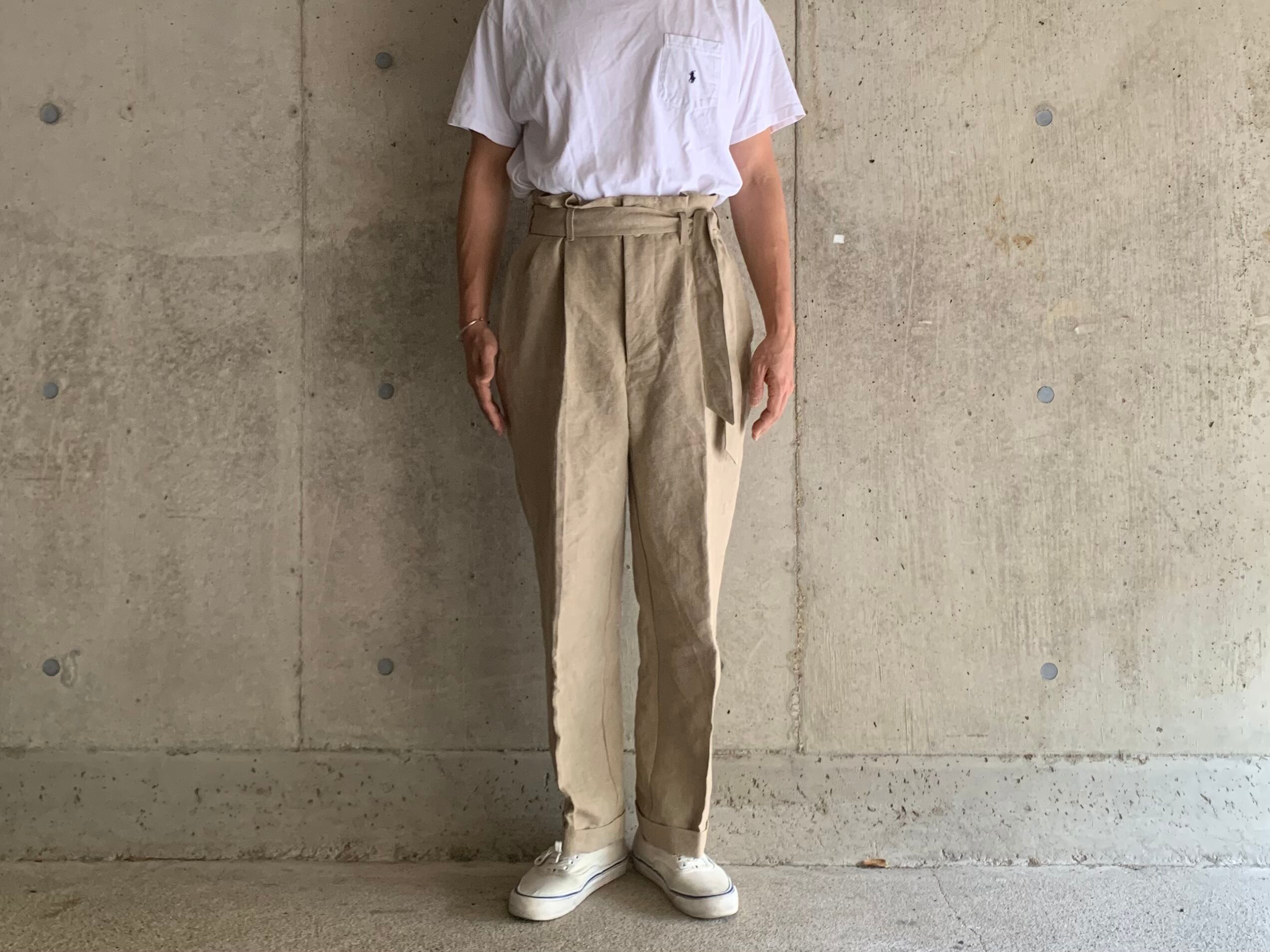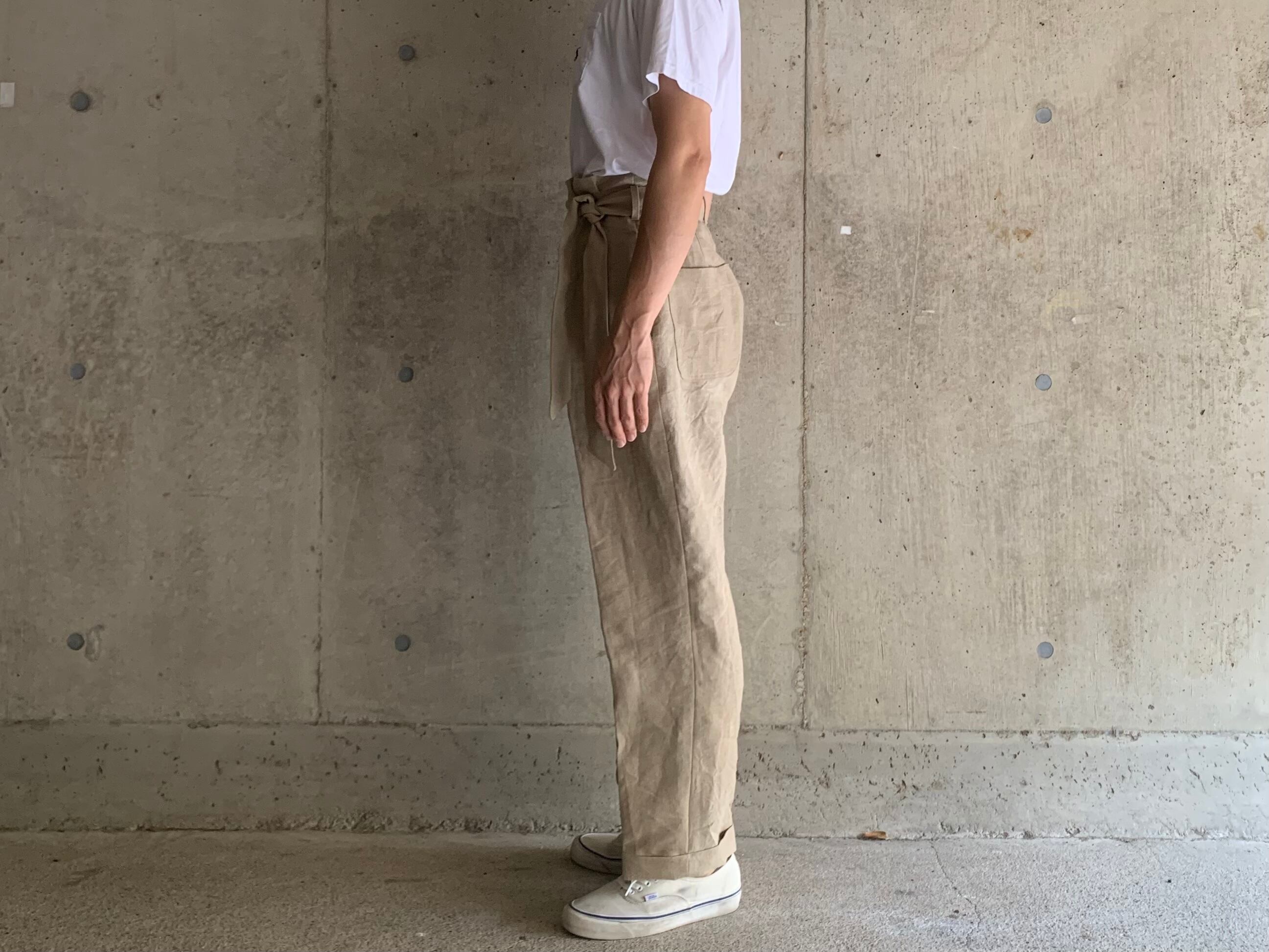 シルエットはセンタープレスが入ったキレイなシルエットです。履いた時にウエストがクシュッとギャザーができるようデザインしております。タックインをしてベルトでギュッとしめると独特な雰囲気が出ます。