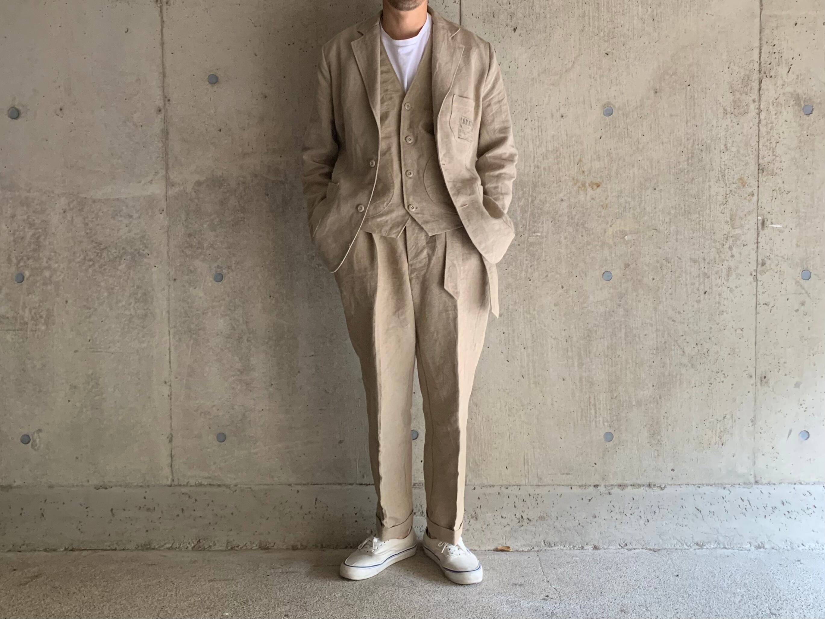 当店で販売している同じ生地で作ったジャケットとセットアップで着用してもグッドです。(全て違う個体で作成しているため、微妙に色が違います。完璧なセットアップをお求めの方は推奨いたしません。)