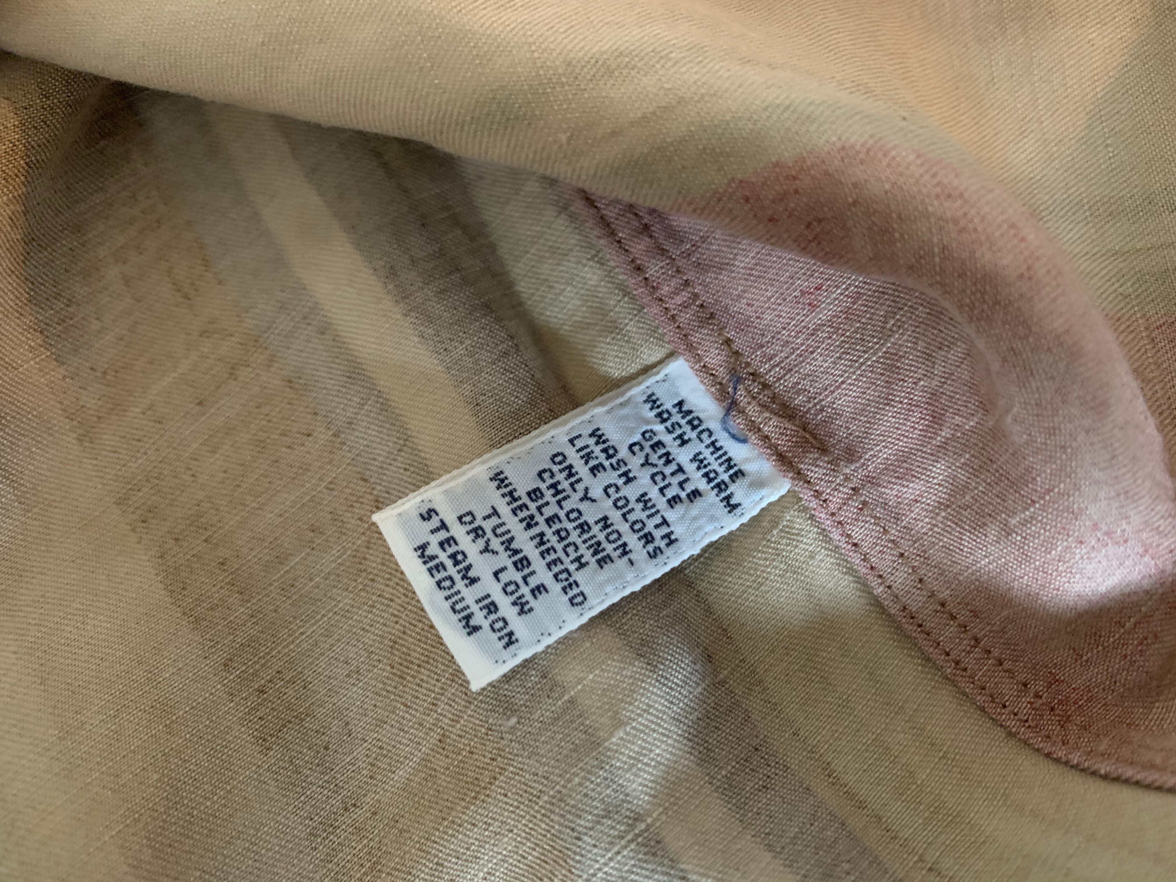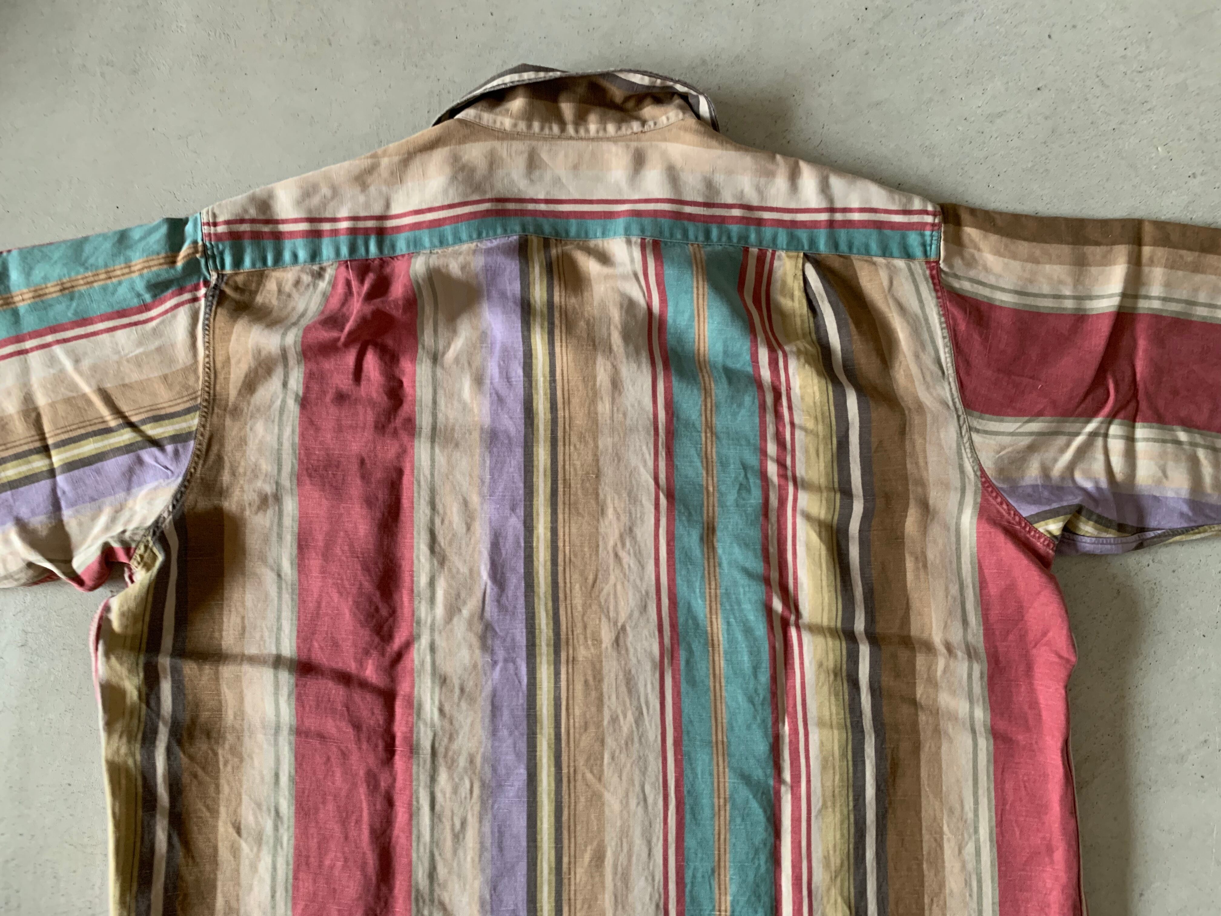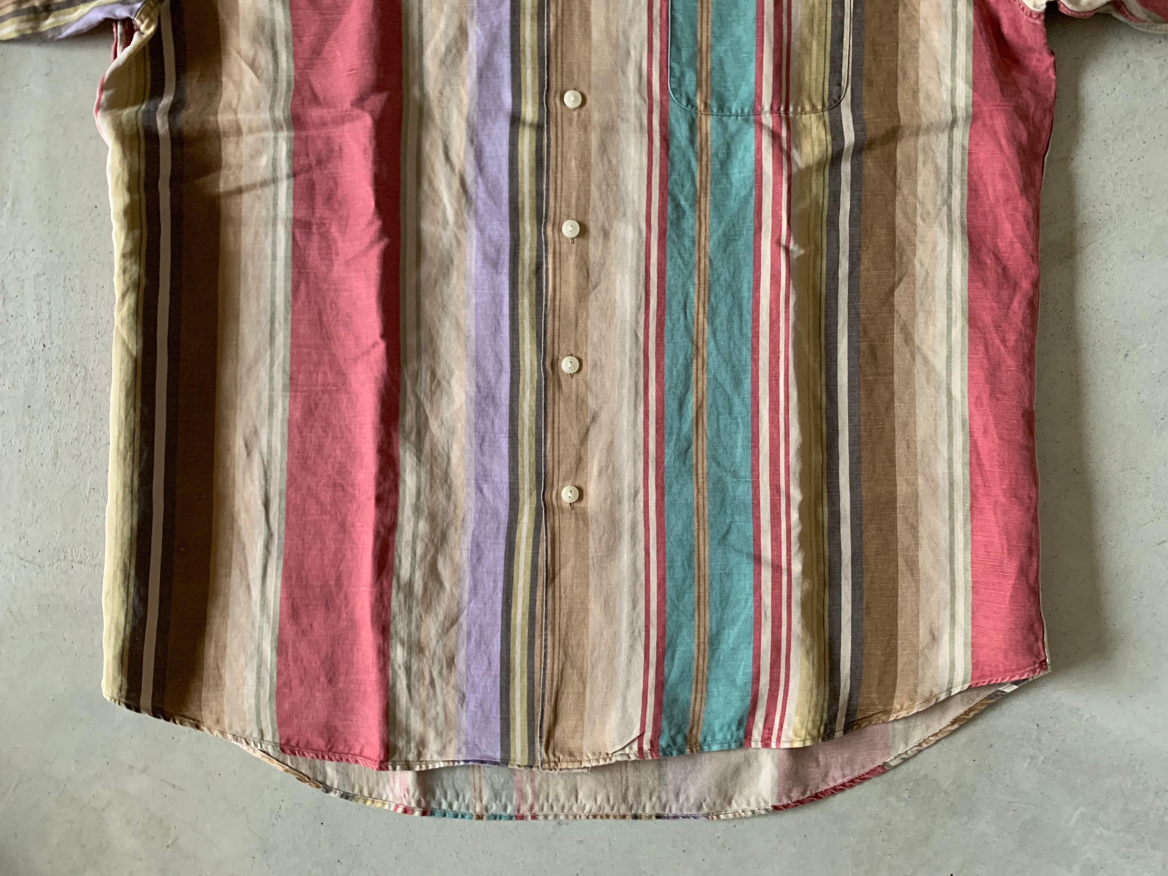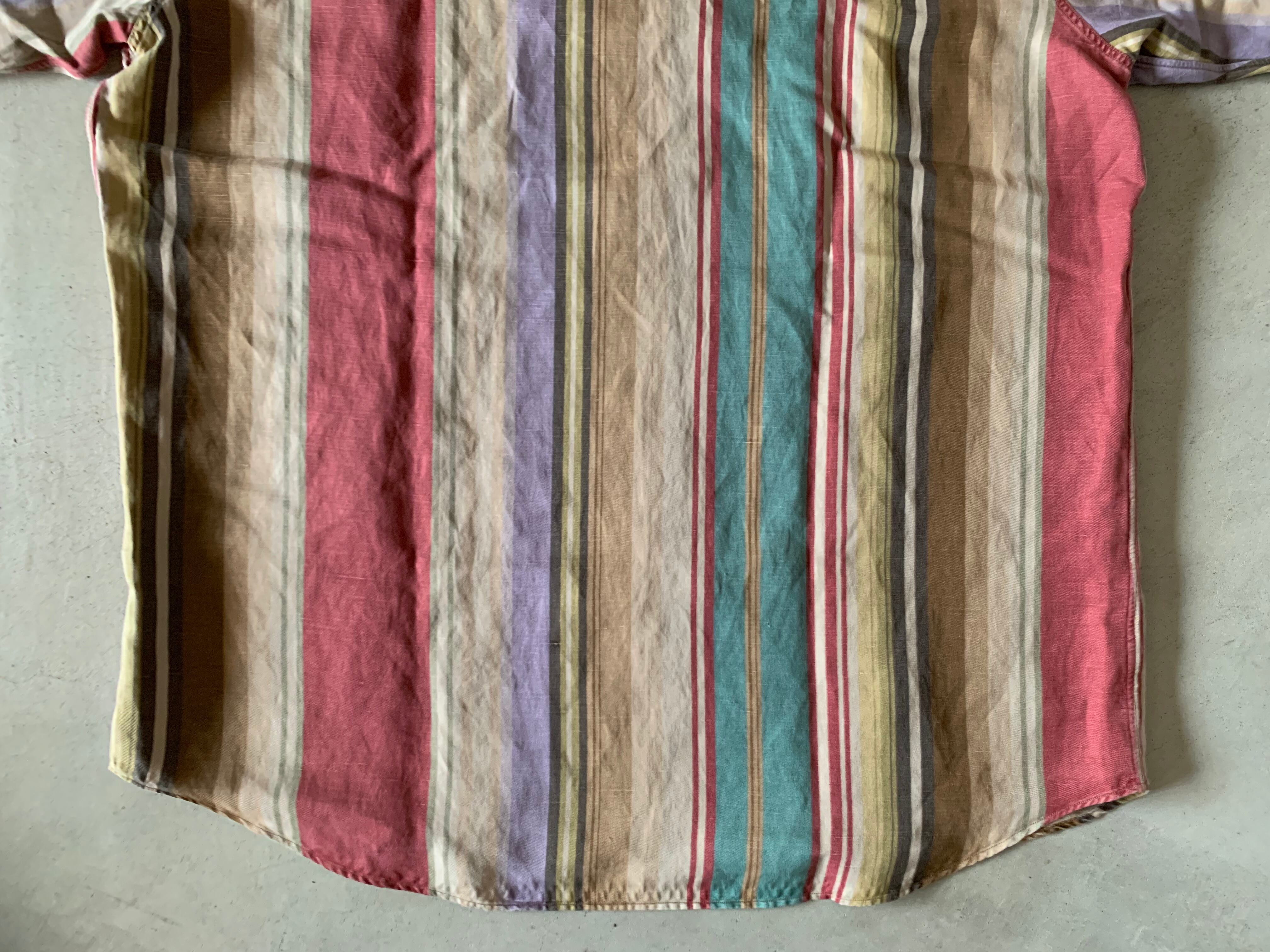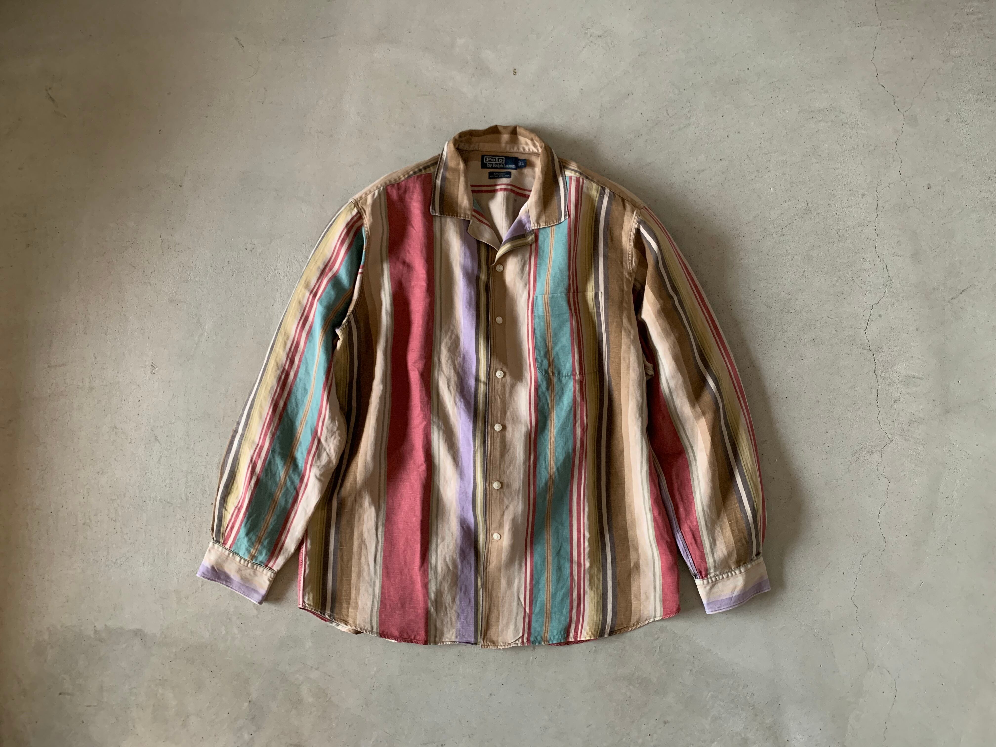 ラルフローレンのシルク53%リネン47%のリゾート感漂う着心地の良いストライプシャツ。オープンカラー仕様の首周り。