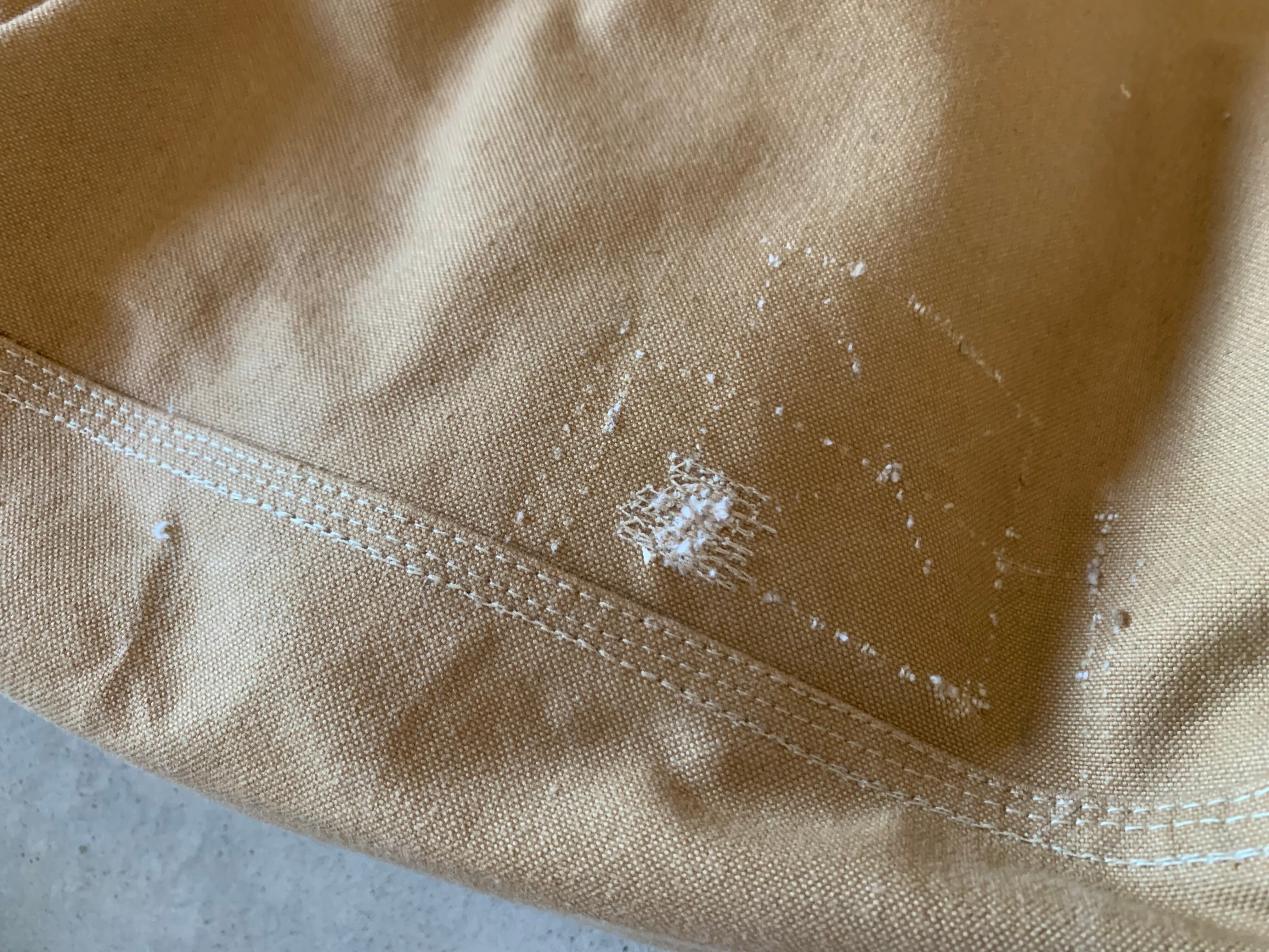 穴があいた、破れた、糸がほつれた、などのトラブルは、ヴィンテージ生地でのパッチワークや、ミシンでたたいて補修をします。ボタンやスナップボタンなどの付属品が取れてしまった、カバンのストラップがちぎれたなどの場合は、似寄りの物で対応させていただきます。