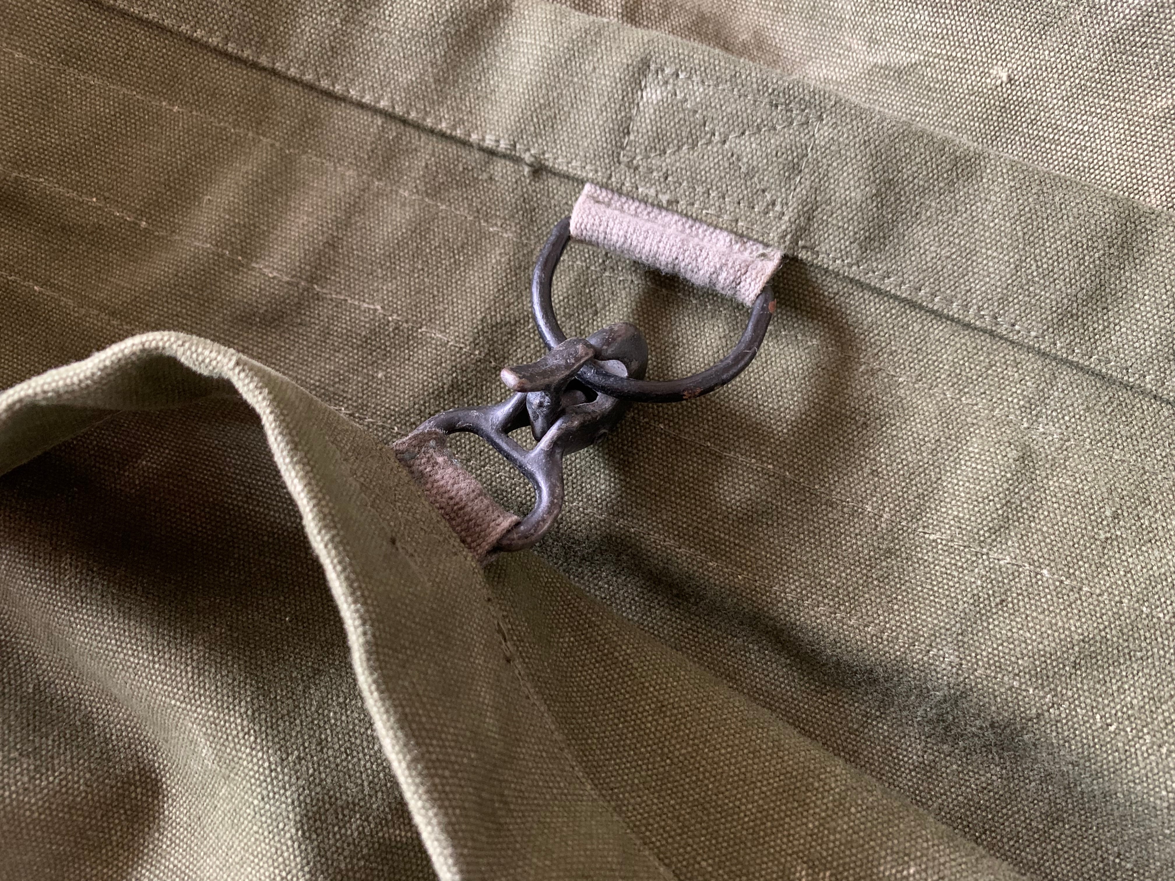 開口部をとめる、武骨なフックとD環は40年代アメリカ軍で使われていた物。