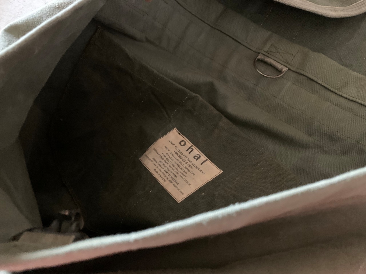 ショルダーベルトは取り外し可能で、両端についているナスカンは50年代アメリカ軍のダッフルバッグに使われていた物です。ボディーとショルダーベルトをつなぐD環の色がバラバラです。ご了承ください。