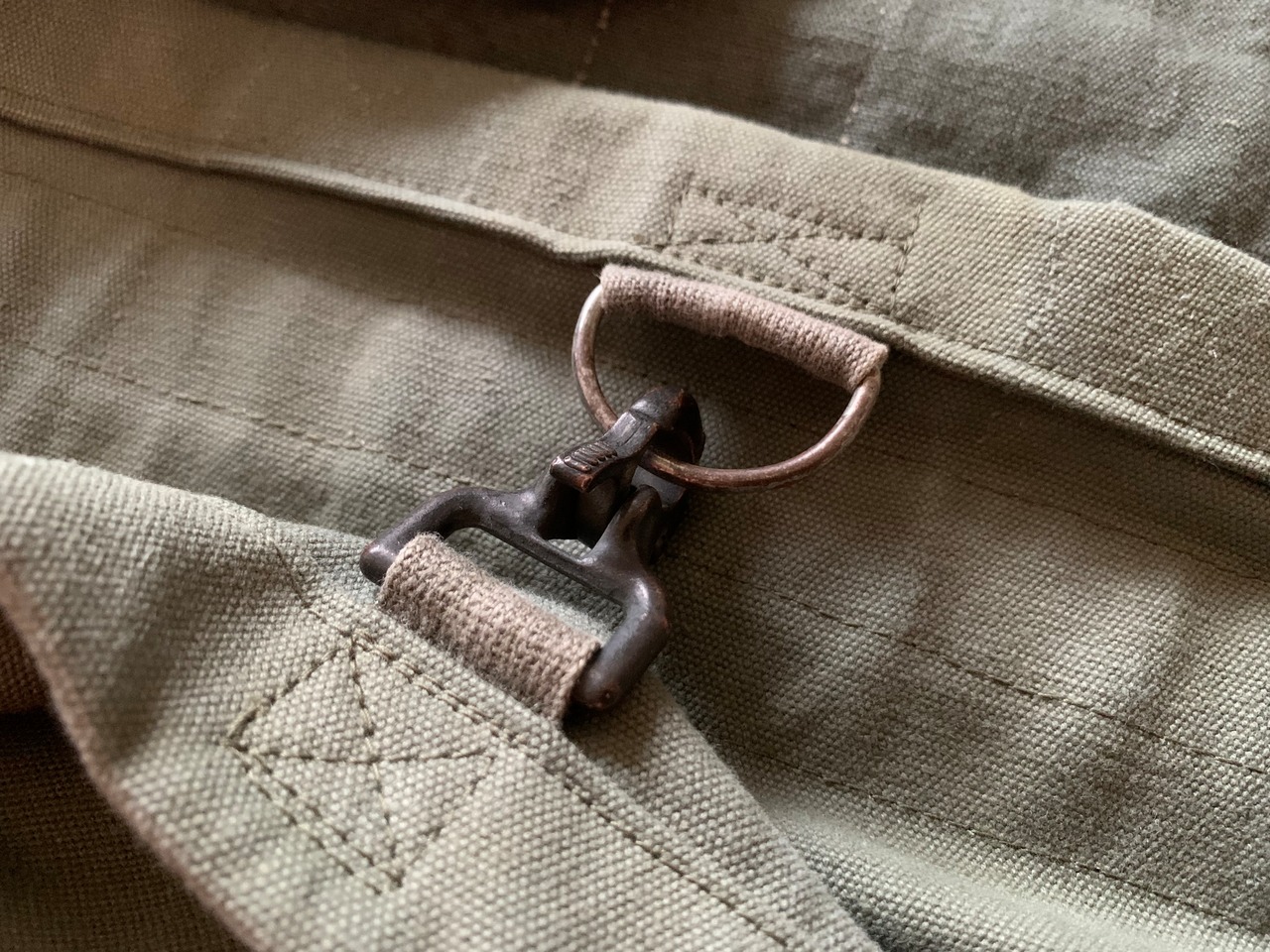 開口部をとめる、武骨なフックとD環は40年代アメリカ軍で使われていた物。