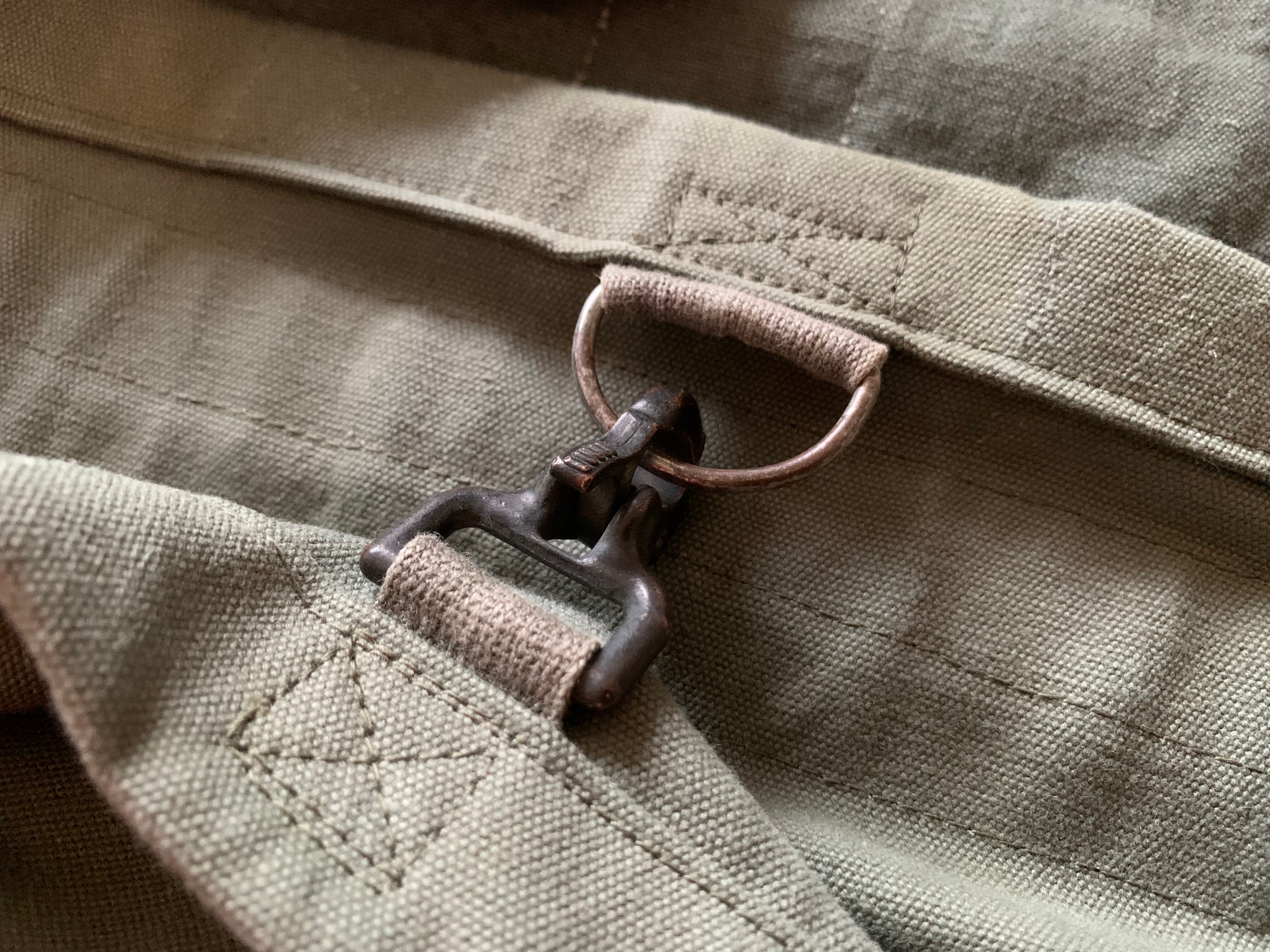 ショルダーベルトのアジャスターの金具だけ50年代のフランス軍のダッフルバッグに使われていた金具を使用しております。