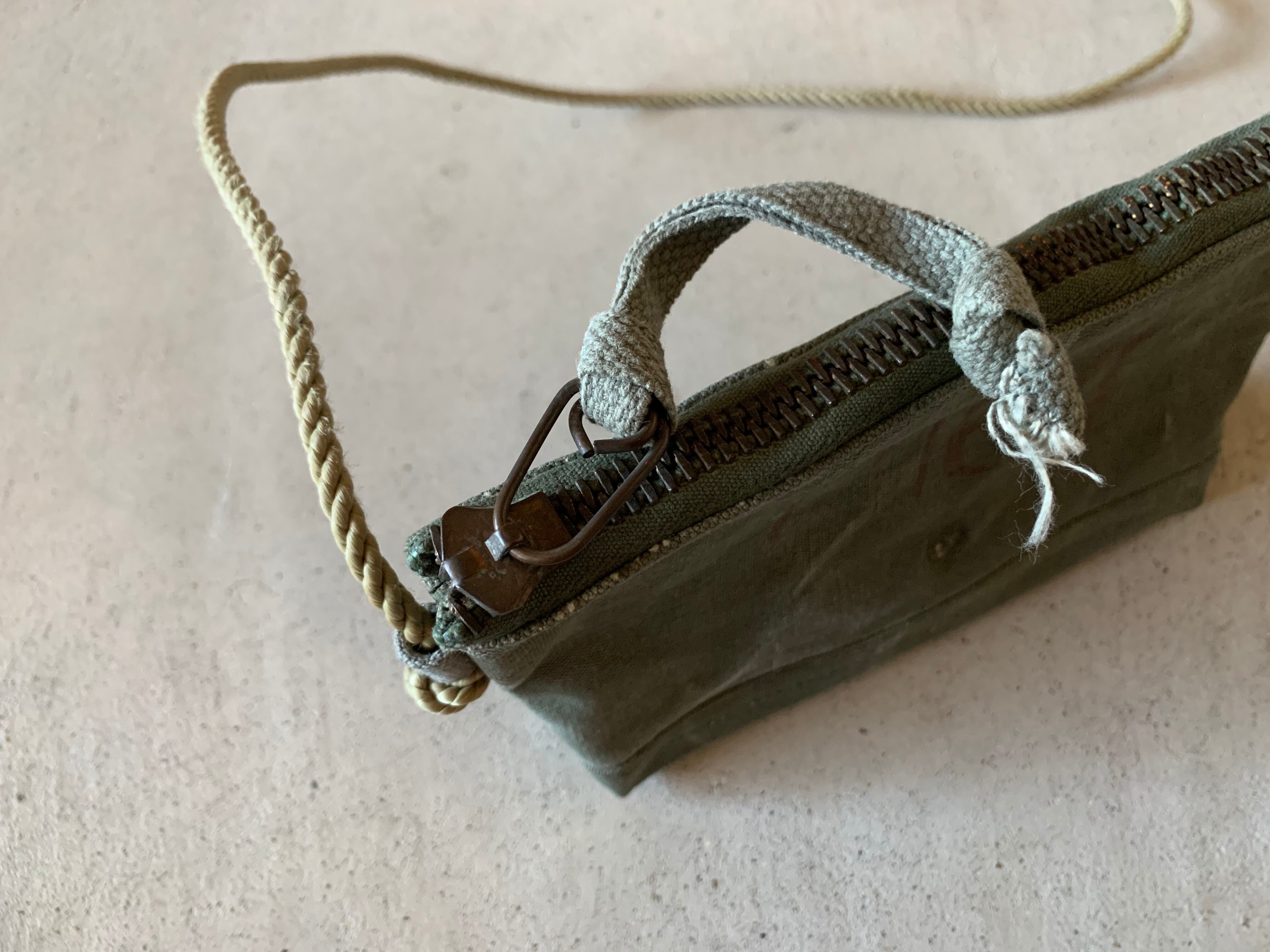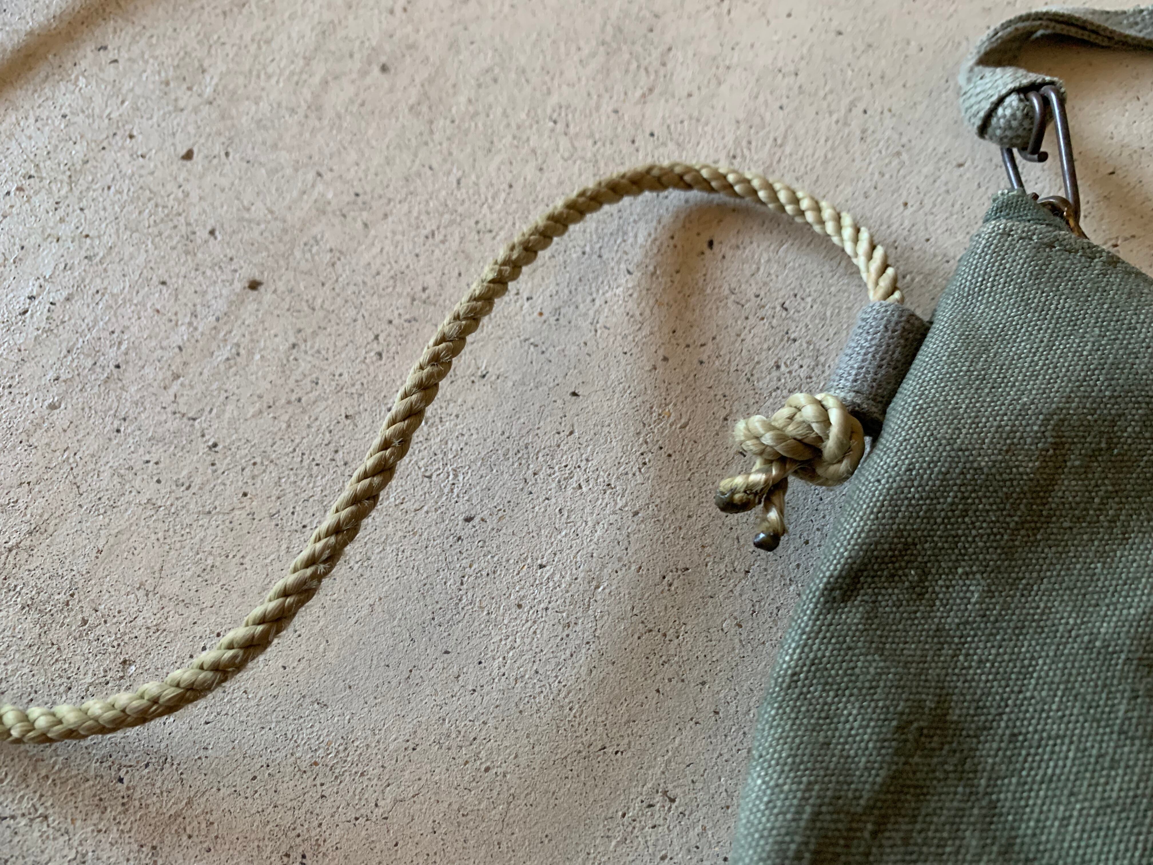 ショルダーの紐は50年代頃の旗を上げる時に使用される非常に丈夫な細いロープです。結び目をつくることでショルダーの長さを調節できます。