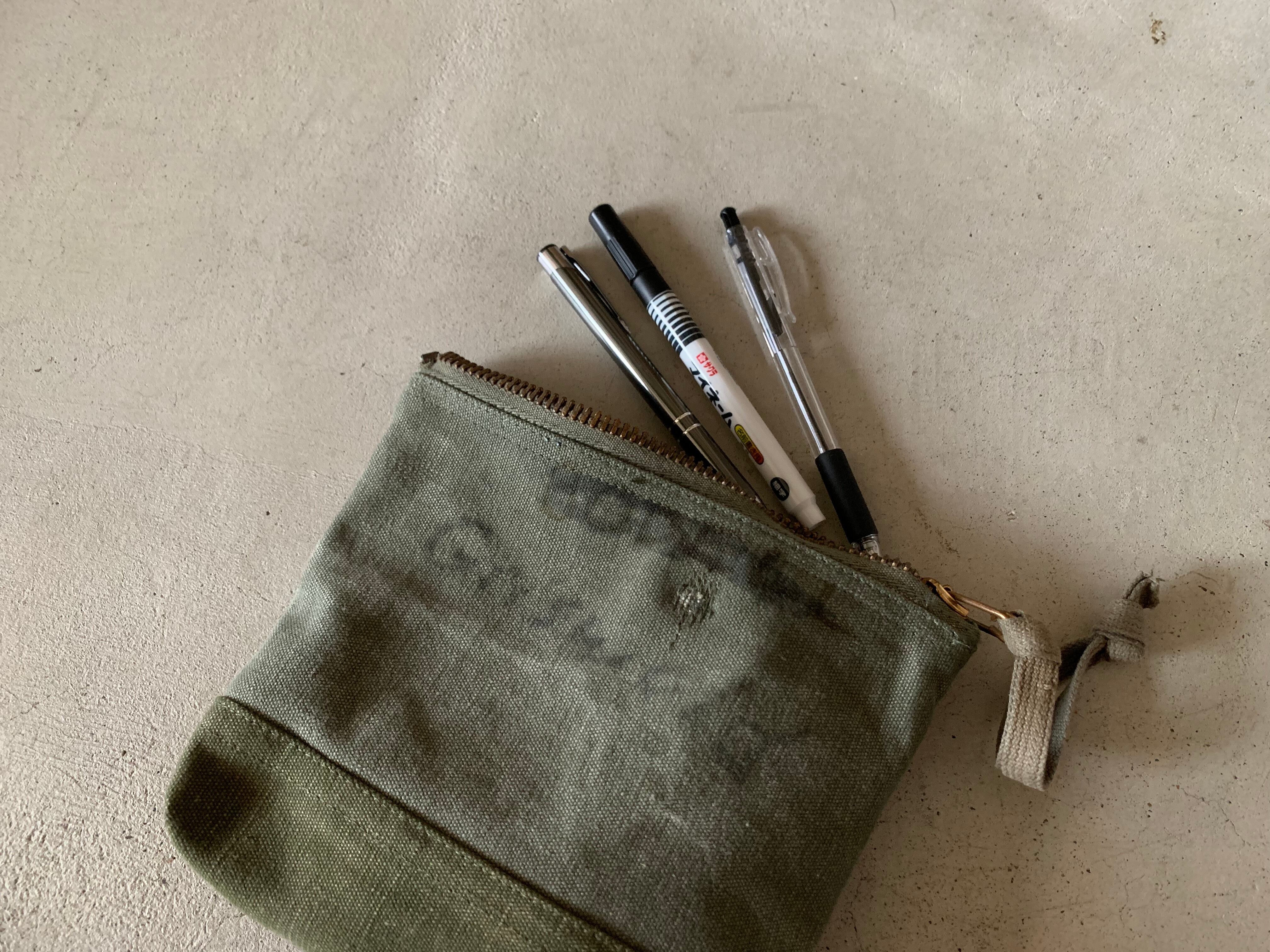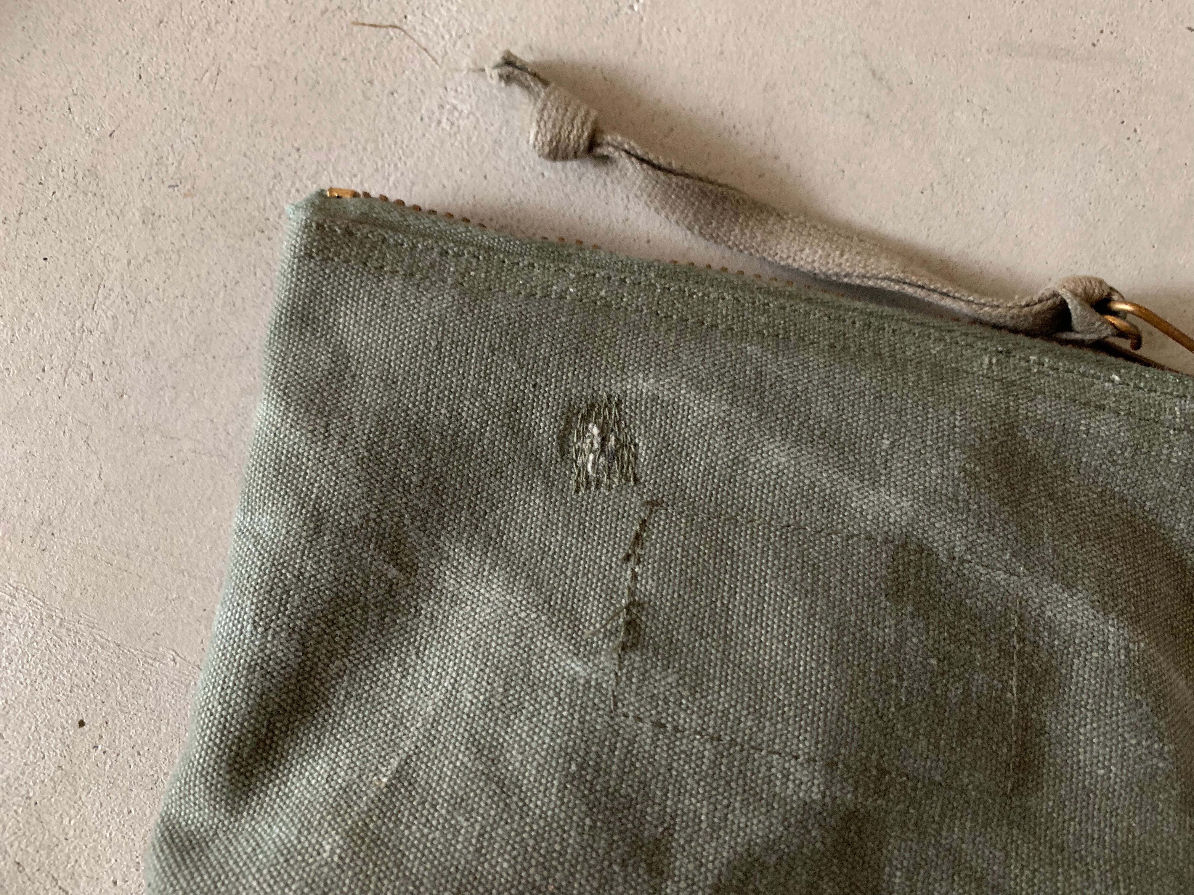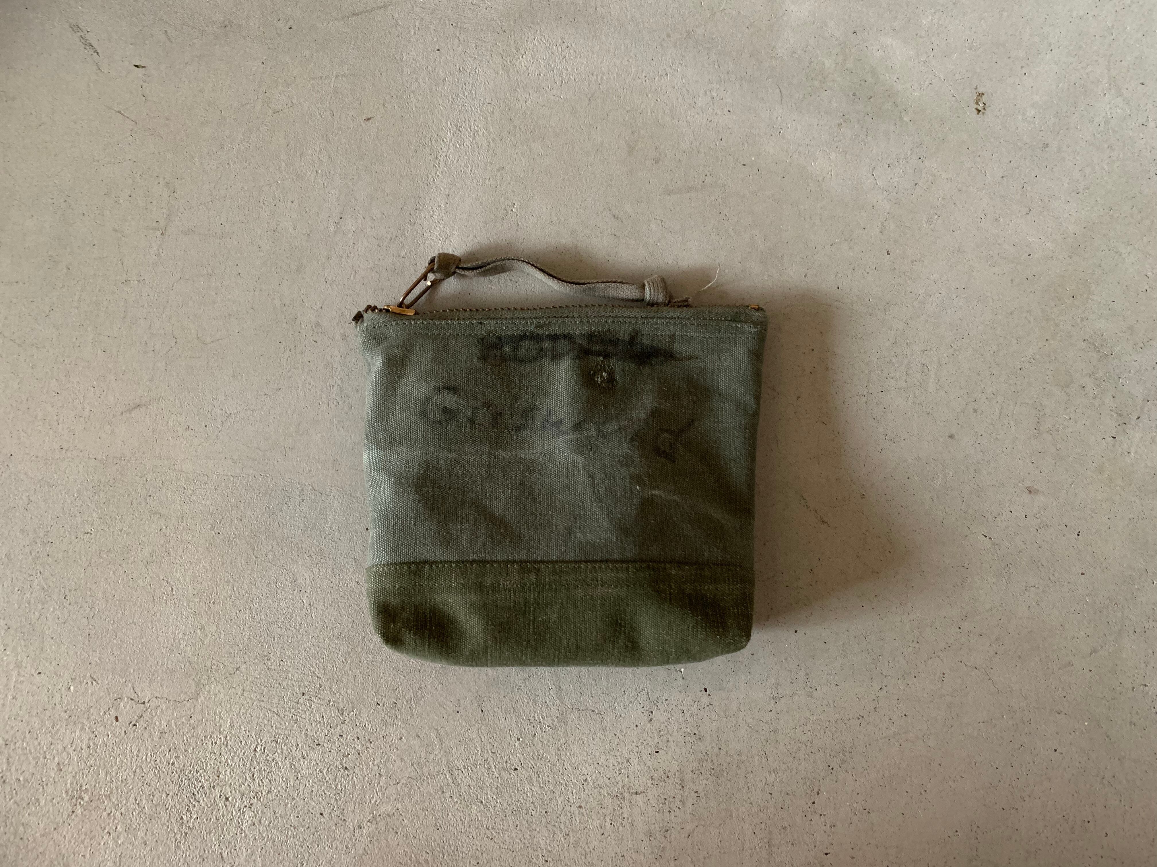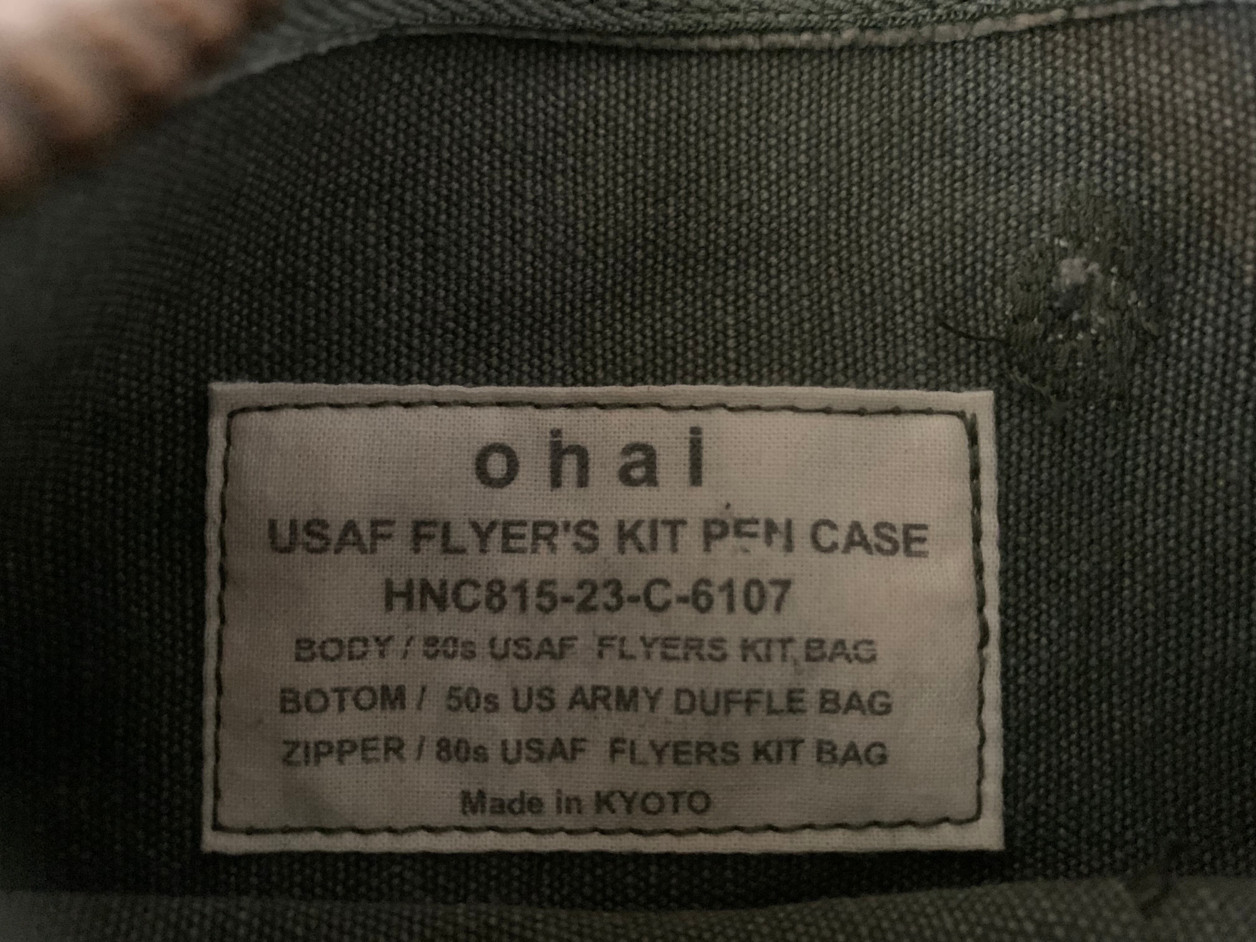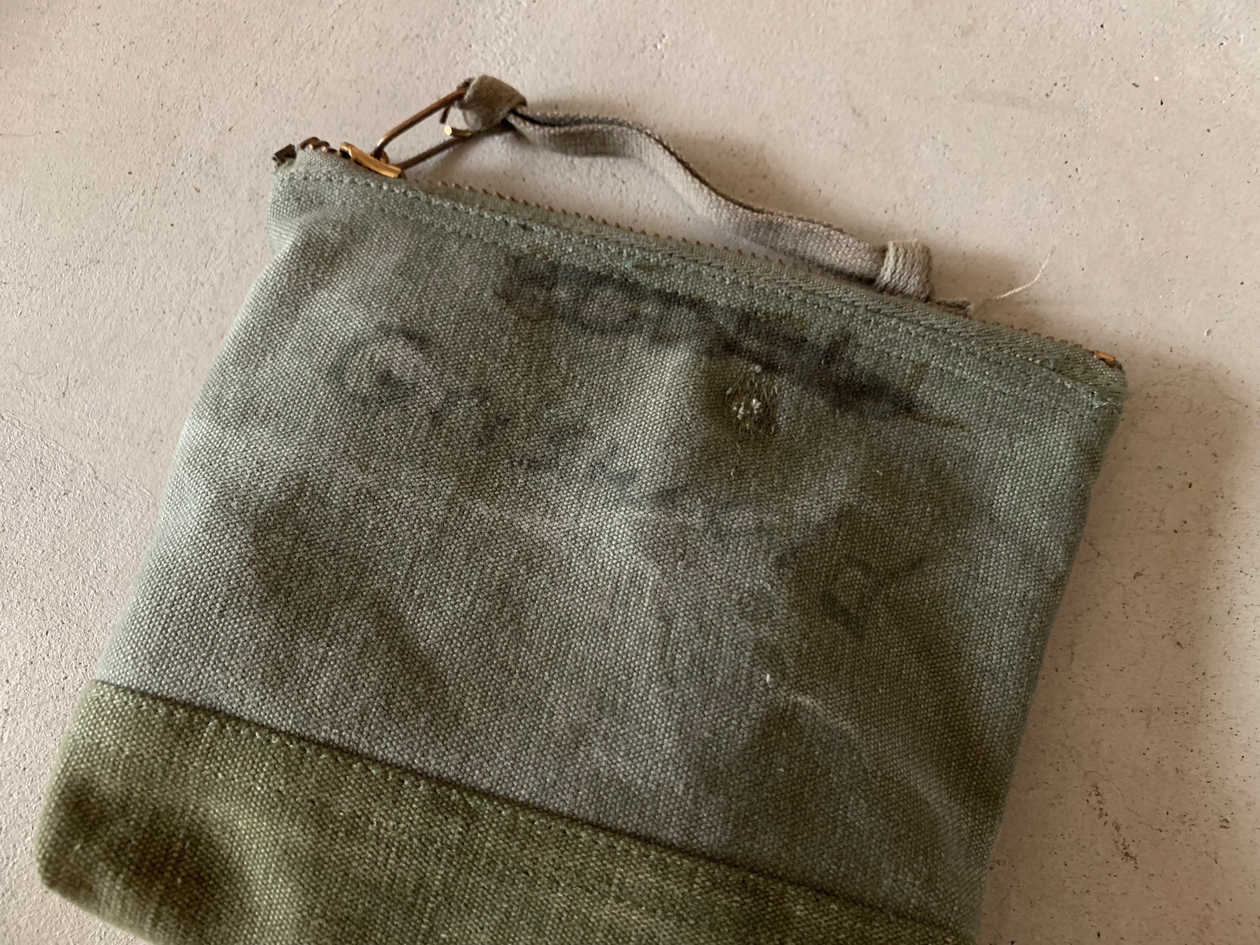 ボディーは80年代のアメリカ軍のフライヤーズキットバッグを解体した生地です。前面にマジックで落書きされた跡があり、ヴィンテージらしい雰囲気を漂わせています。