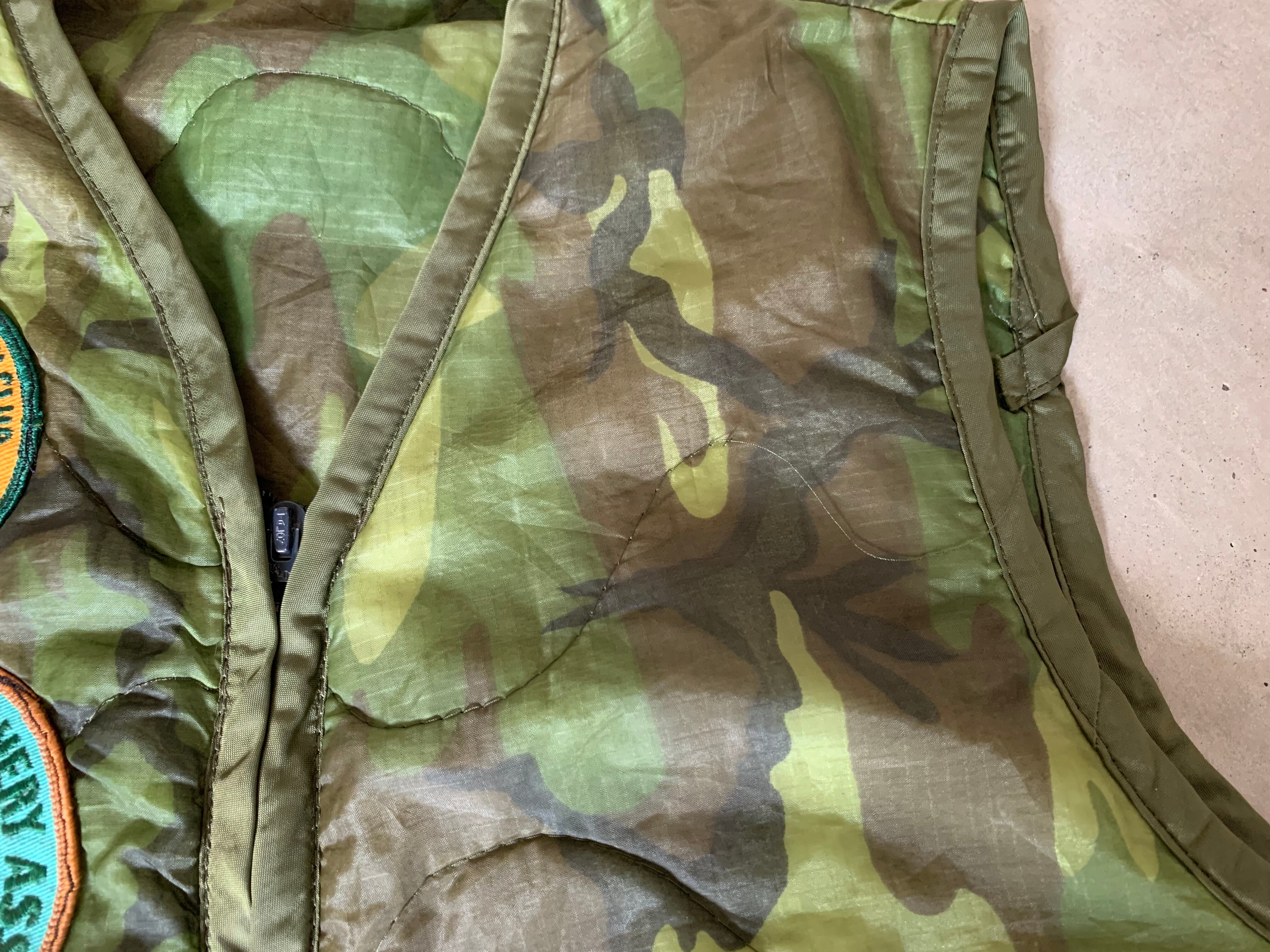 70年代頃のウッドランドカモ柄キルティング素材のハンティングベスト。中綿はかなり薄めで防寒はそこまで期待できません。。。が、右前についたヴィンテージワッペンや、ロケットタロンジップなどでヴィンテージな雰囲気が満載の一枚です。