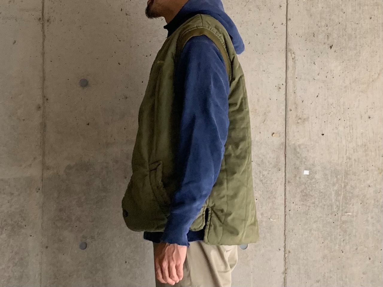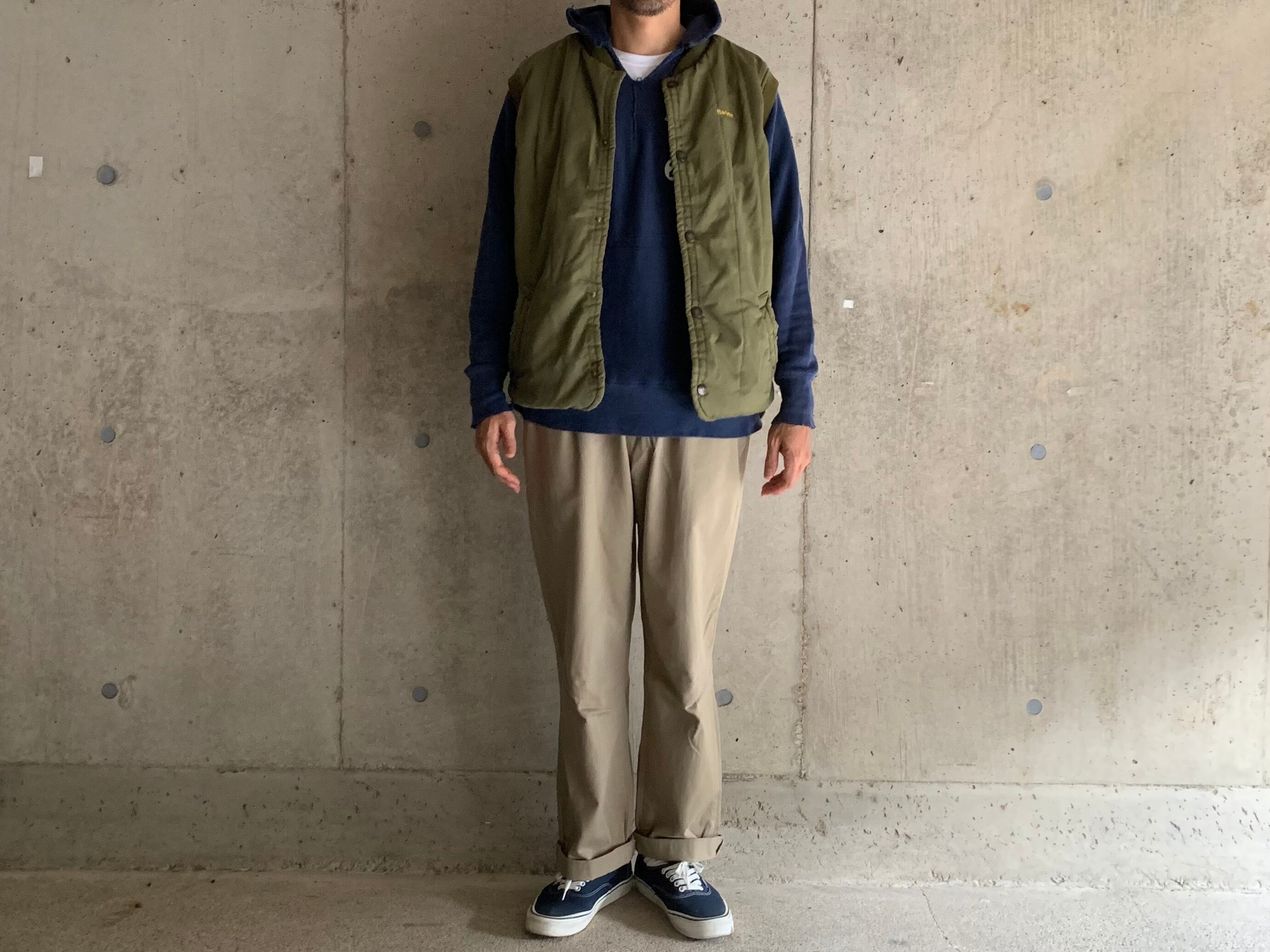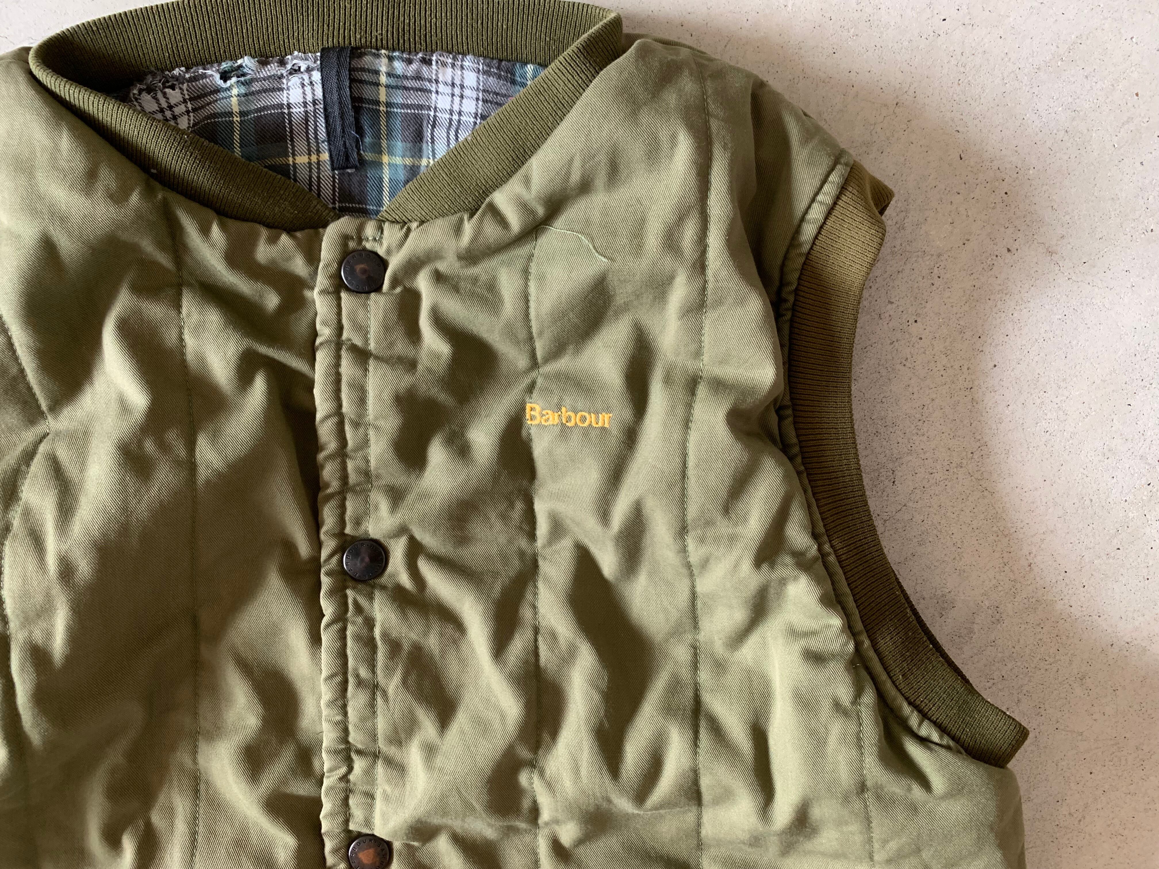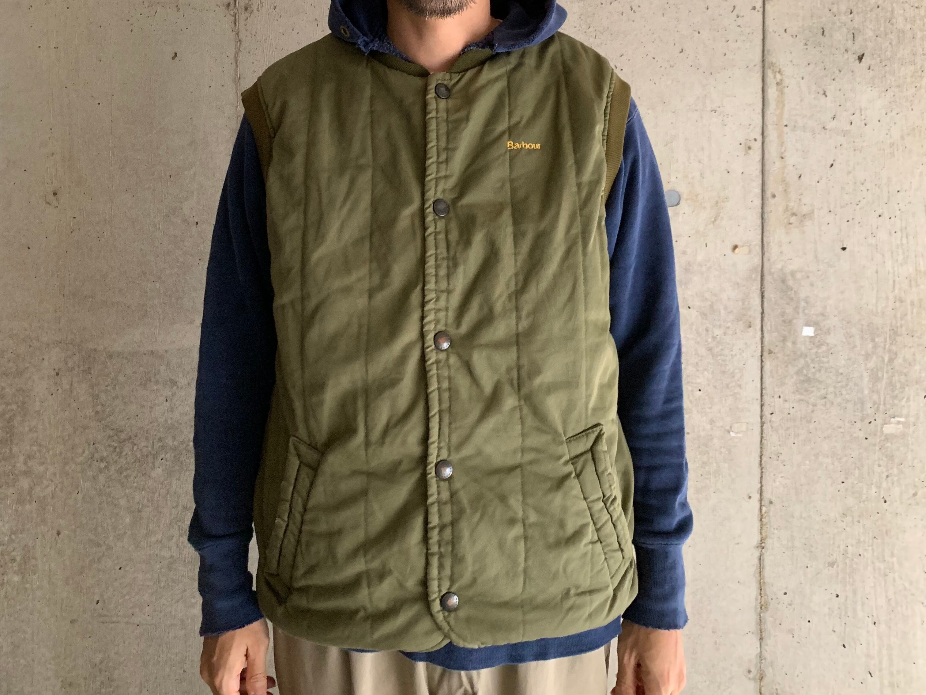 90年代、3ワラントのタグがつくバブアーの中綿ベスト。表面はオイルは塗られていないコットンです。