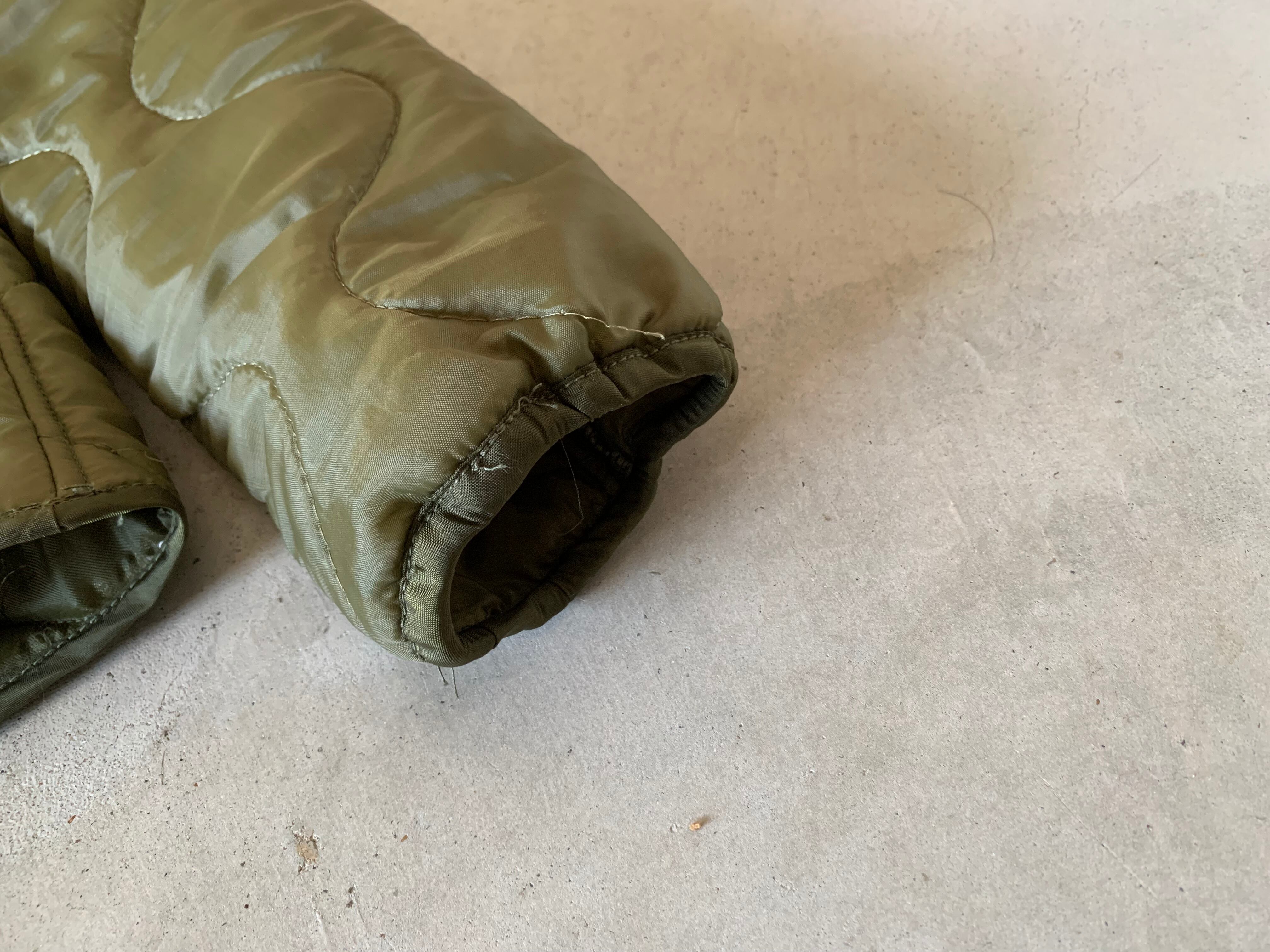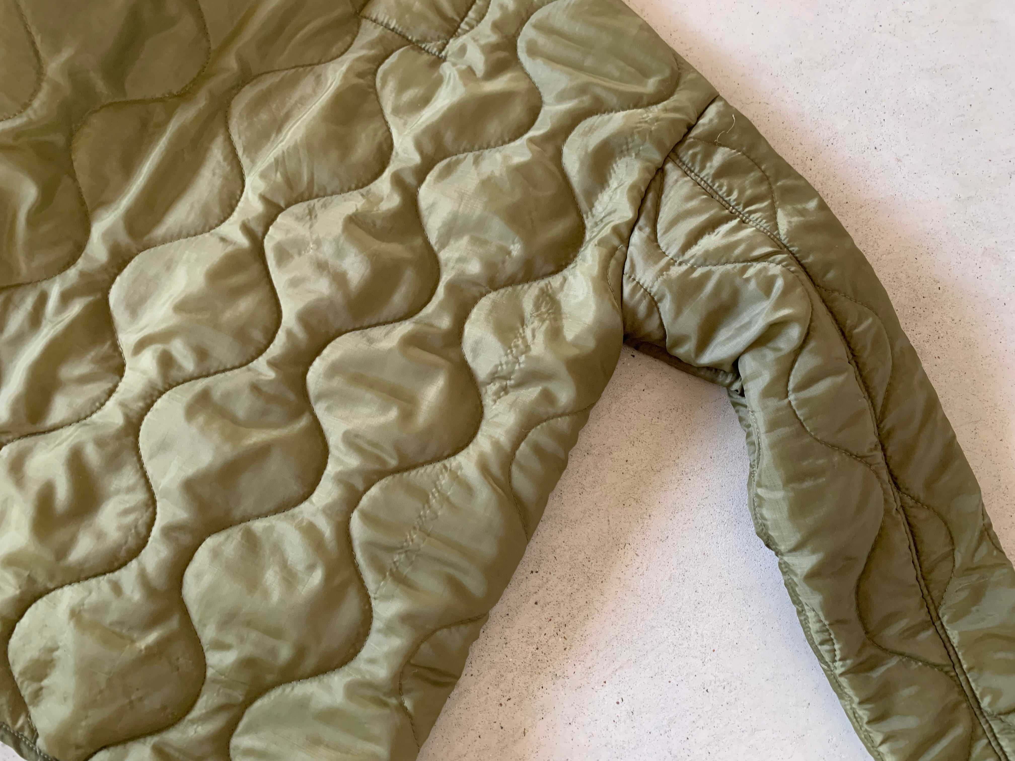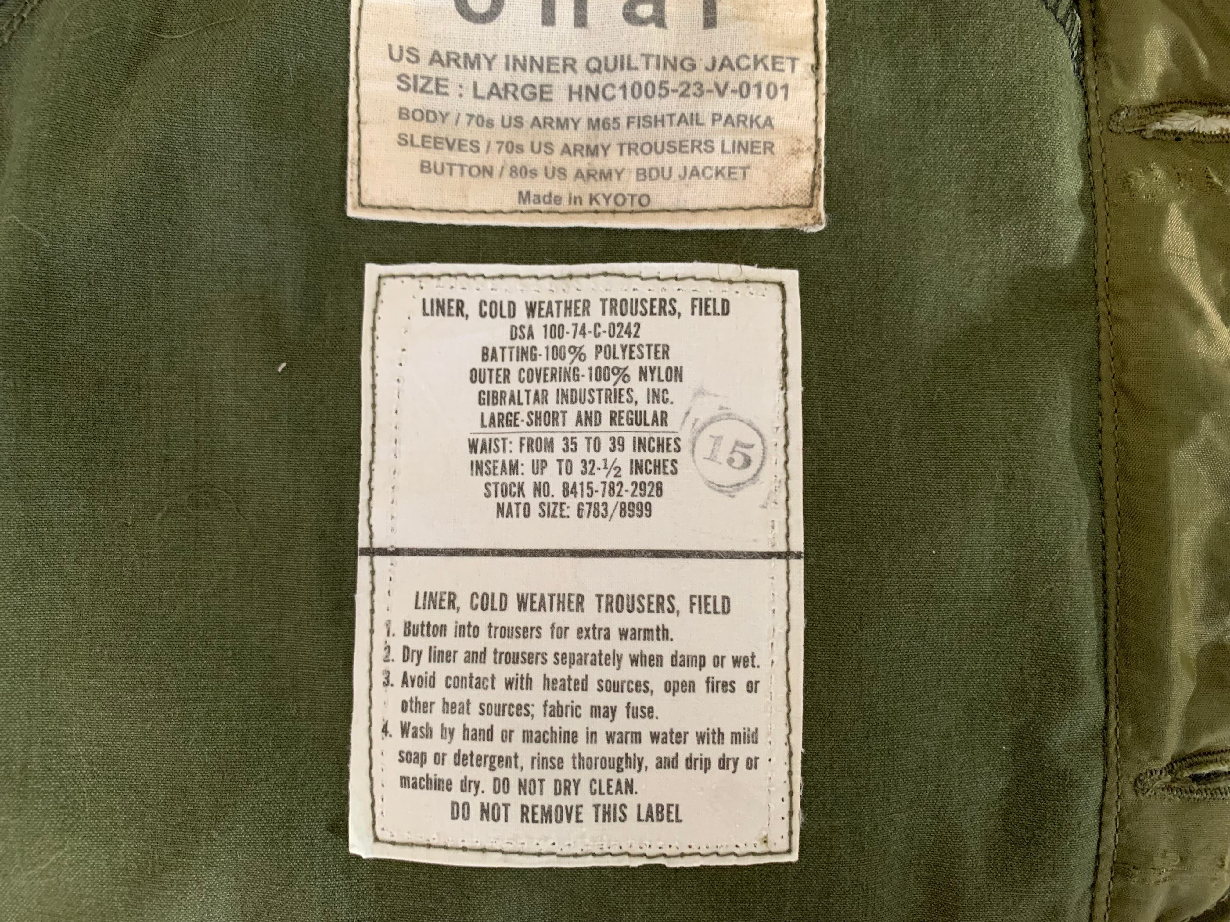 ボディーは米軍の、70年代頃に納入された、M-65 Field Parkaの中に取り付ける、キルティングライナー。