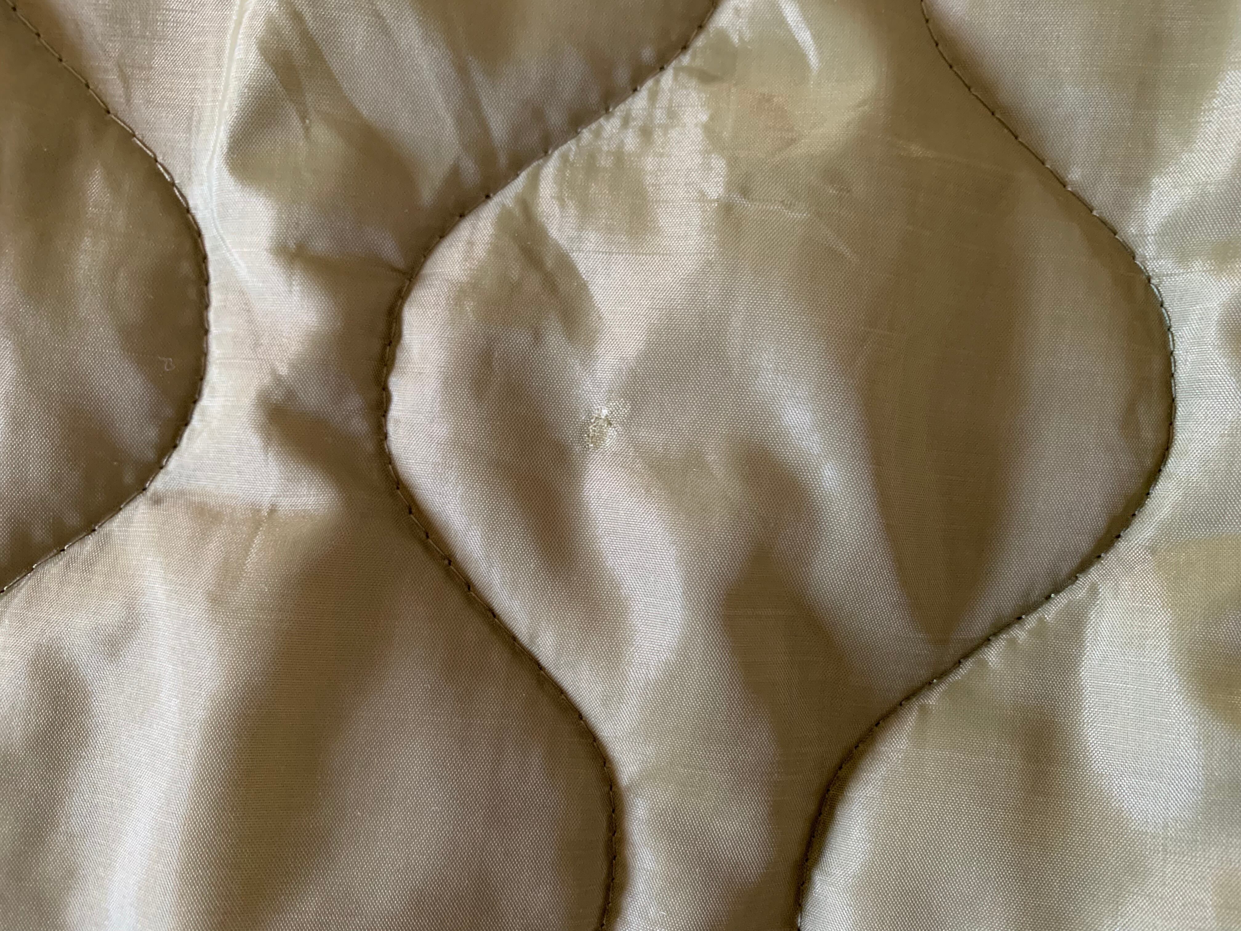 背面右腕の肩口あたりにキルティングのほつれ箇所がございます。14枚目の画像をご確認ください。