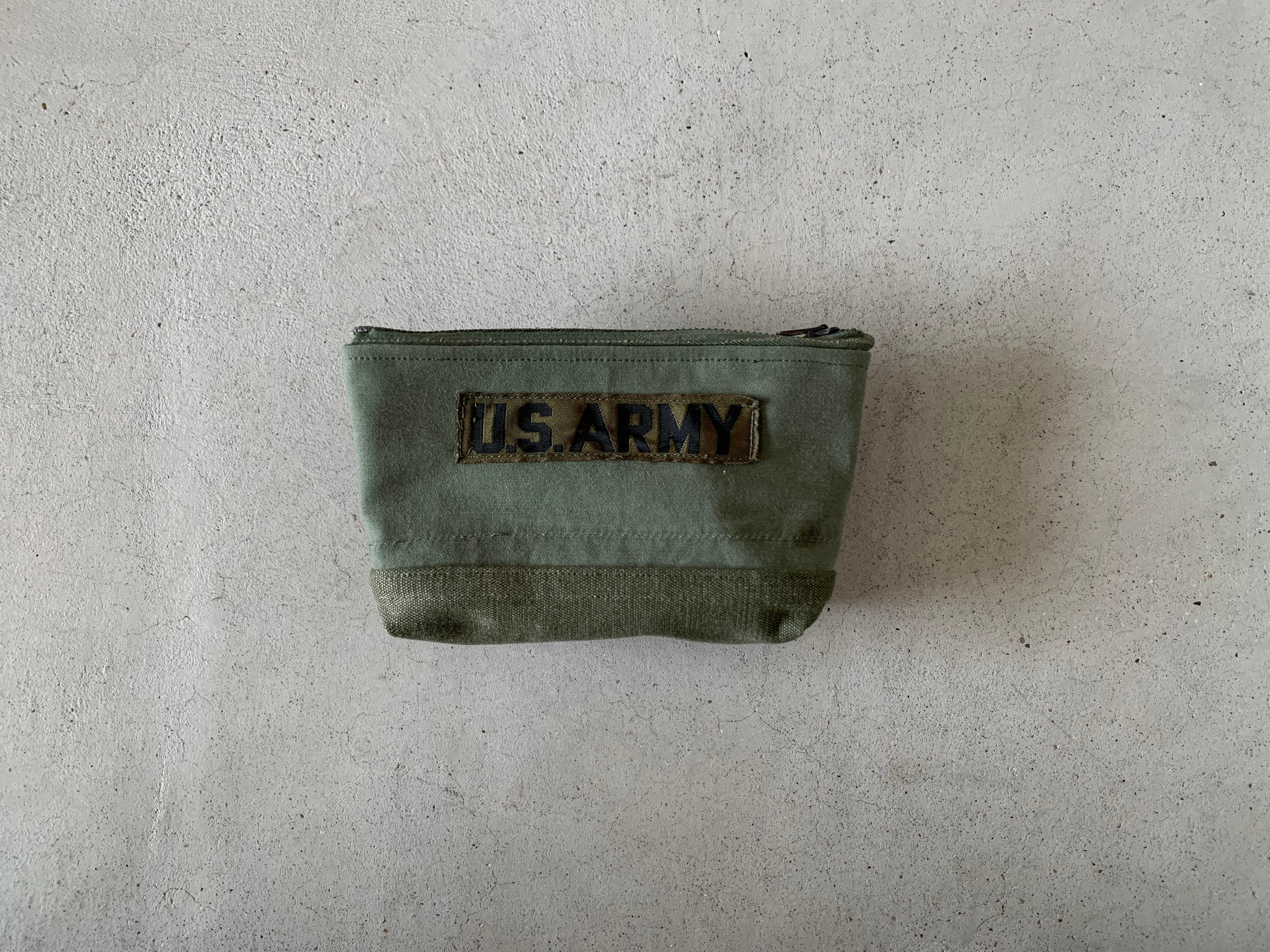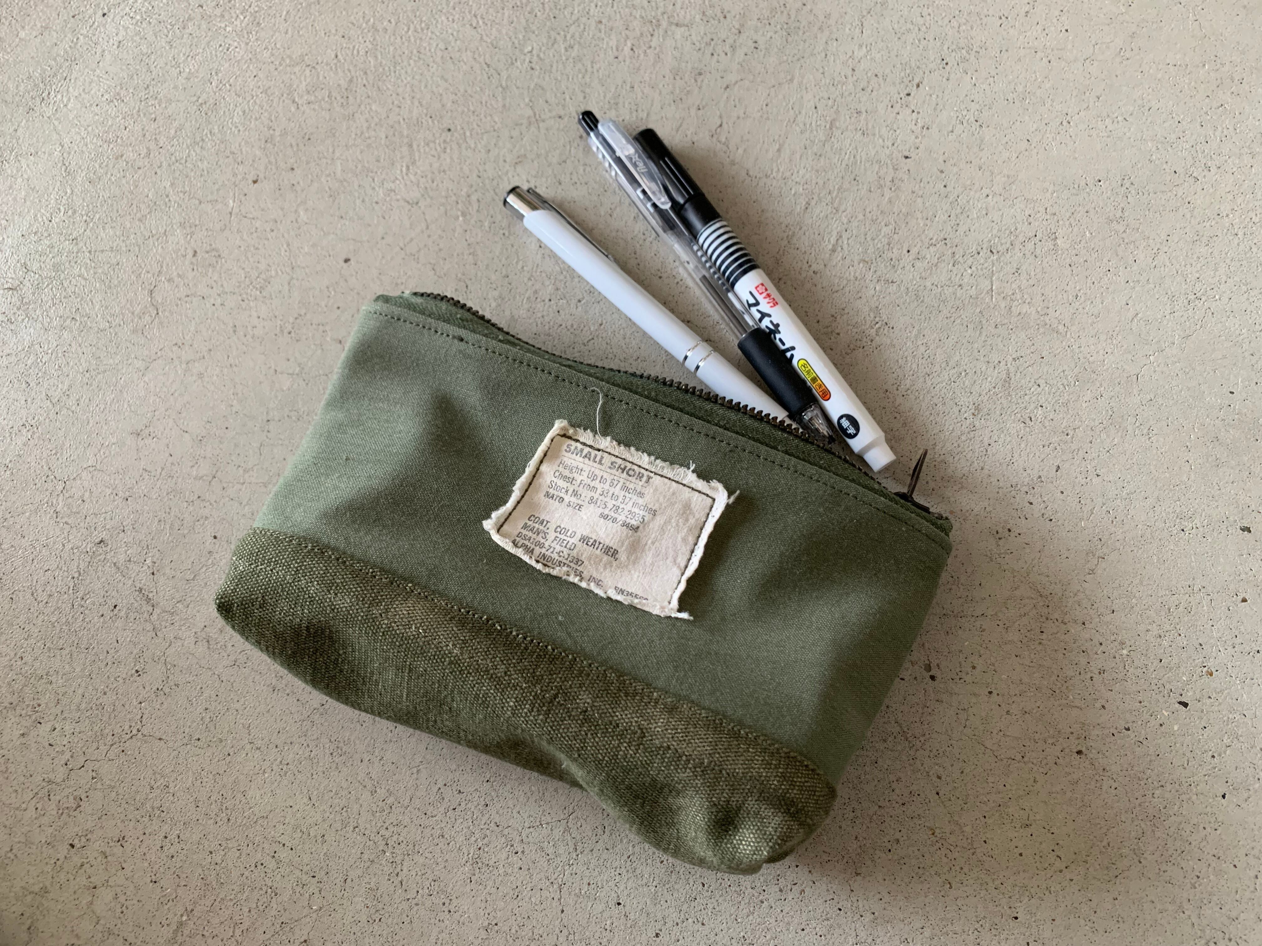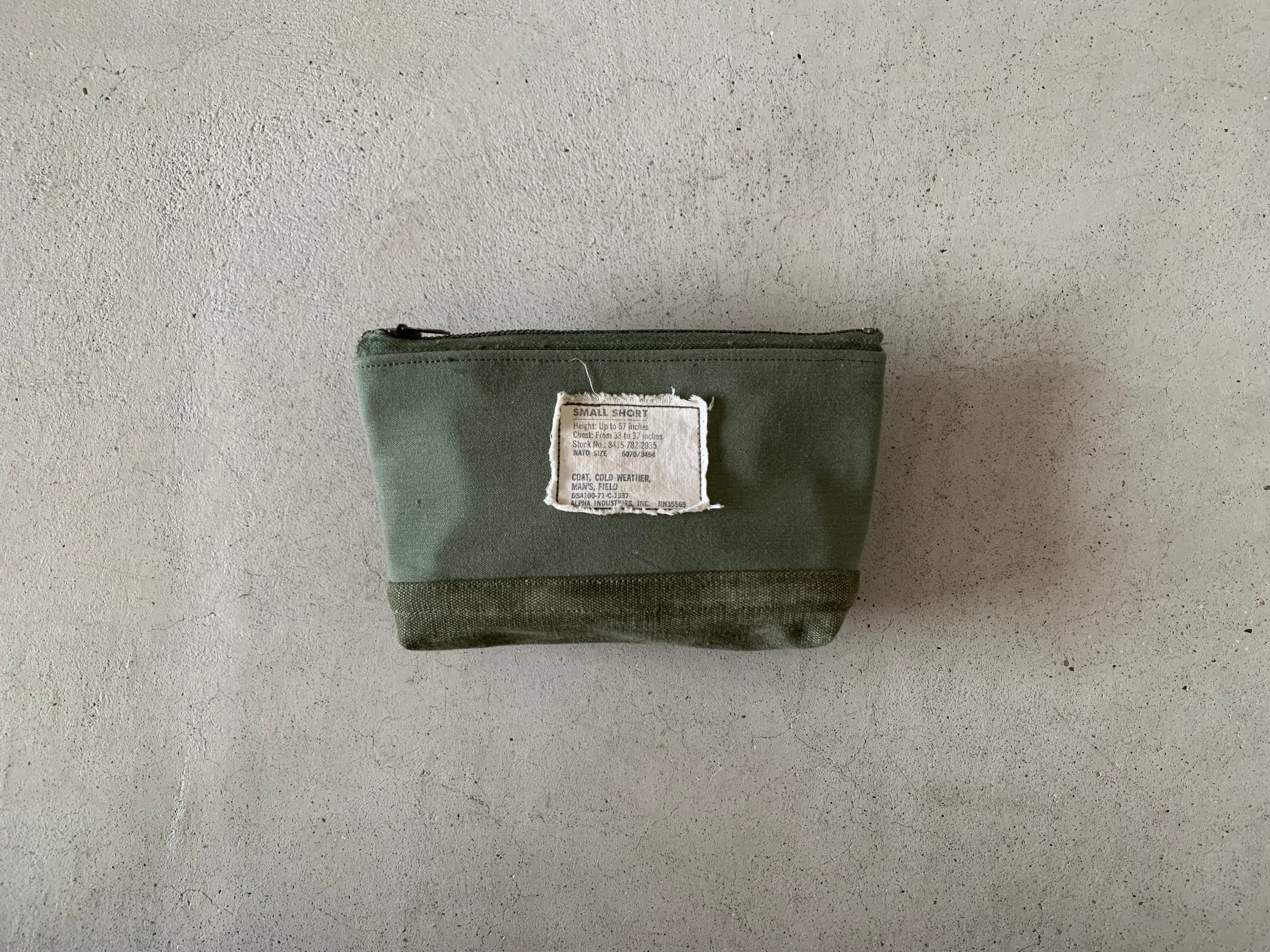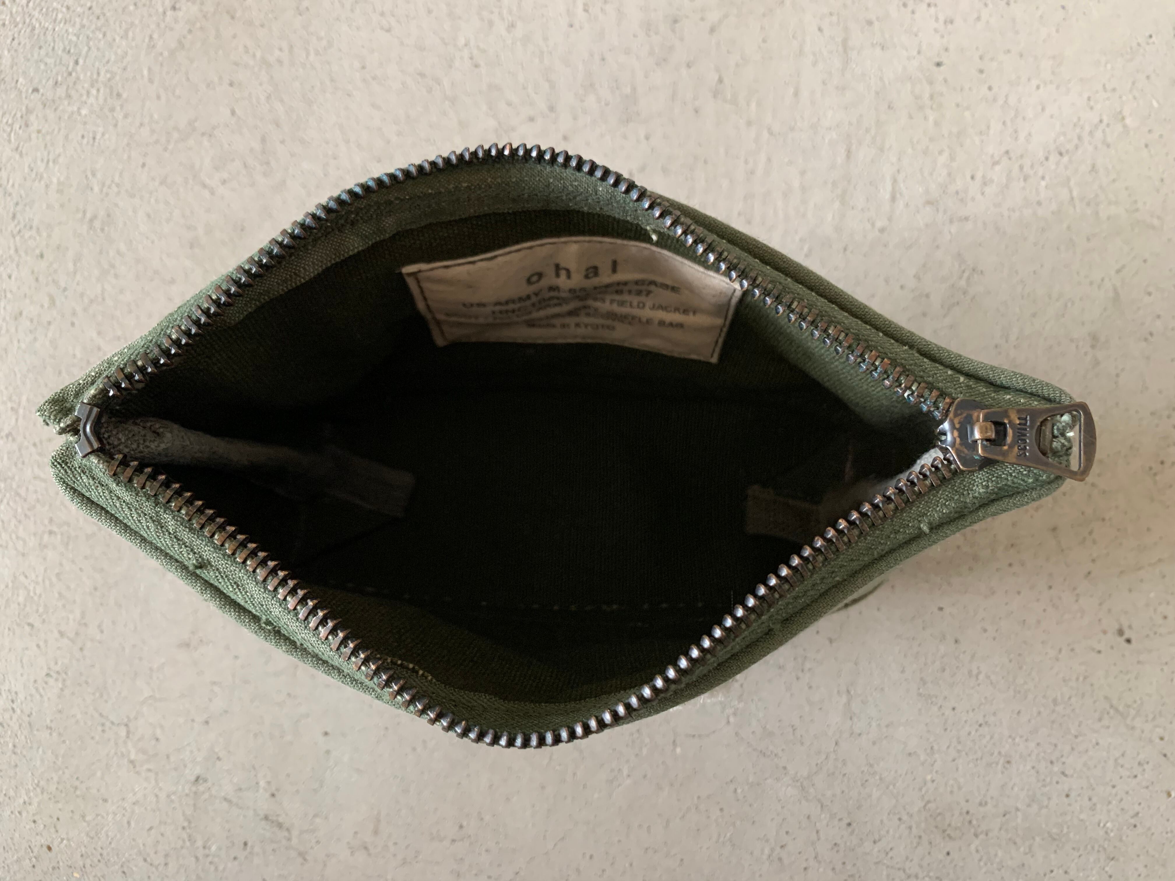 ボディーは71年にアメリカ軍に納入されたM-65 フィールドジャケットの生地です。前面にはジャケットについていたミルスペックのタグを縫いつけ、コントラクトナンバーなどが読み取れるので、玄人好みの仕様となっております。さらに裏にはジャケットの胸についていたUS ARMYのワッペンをつけました。