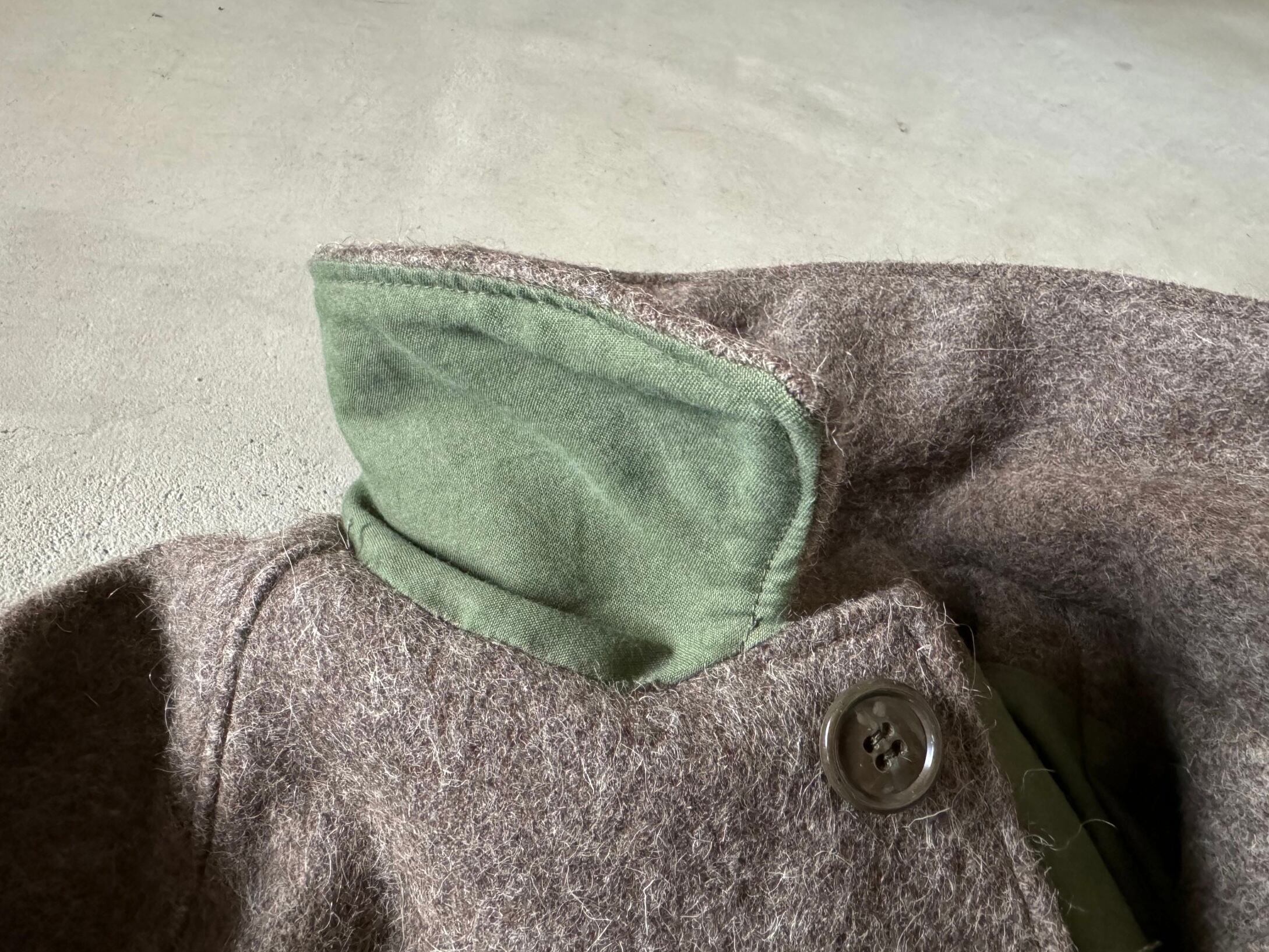 表地は50年代のフランス軍のブランケットです。カラーはブラウン、素材はウール。内側には、おそらく製造年と思われるナンバリングが刺繍された箇所を切り出して、内ポケットにしています。