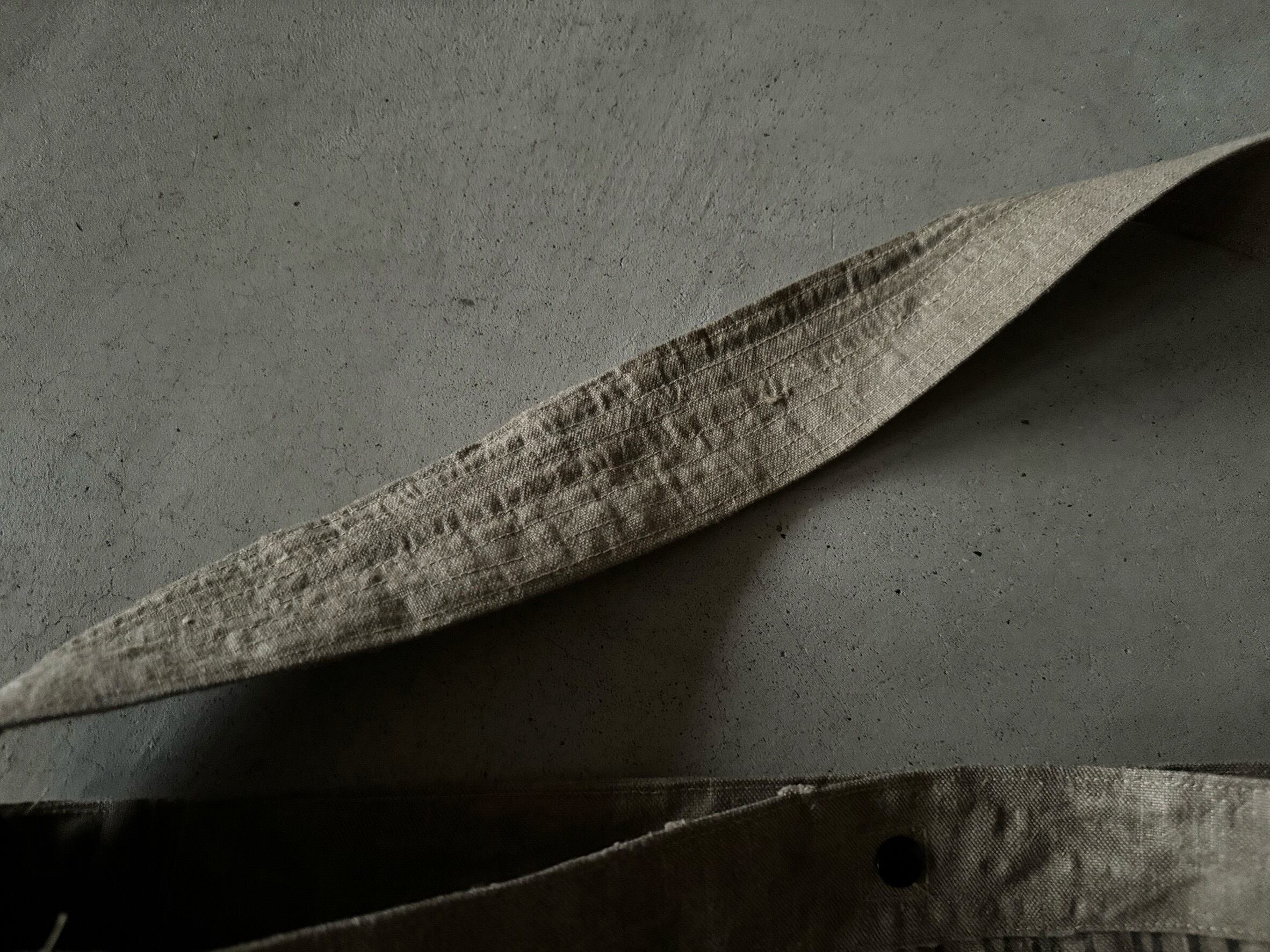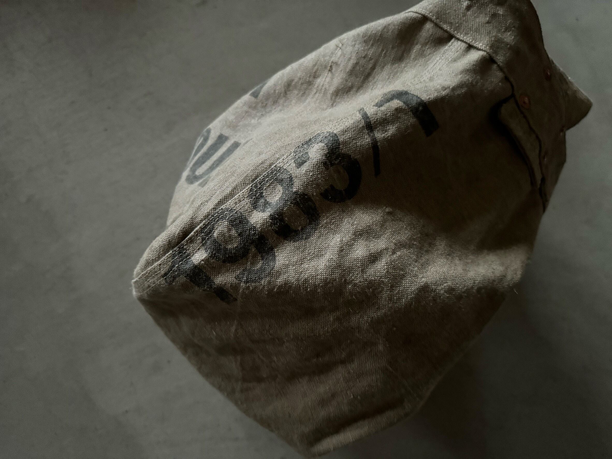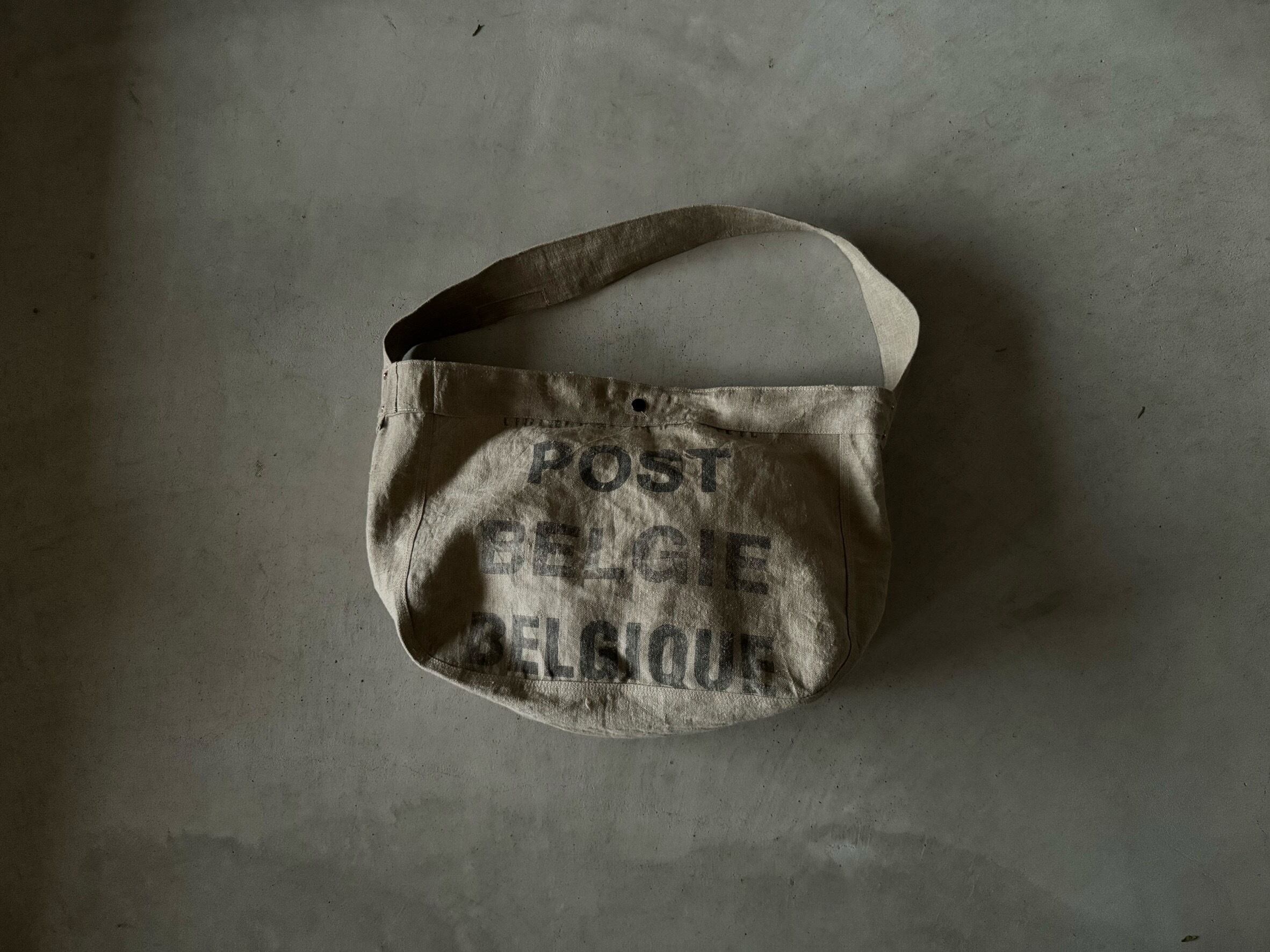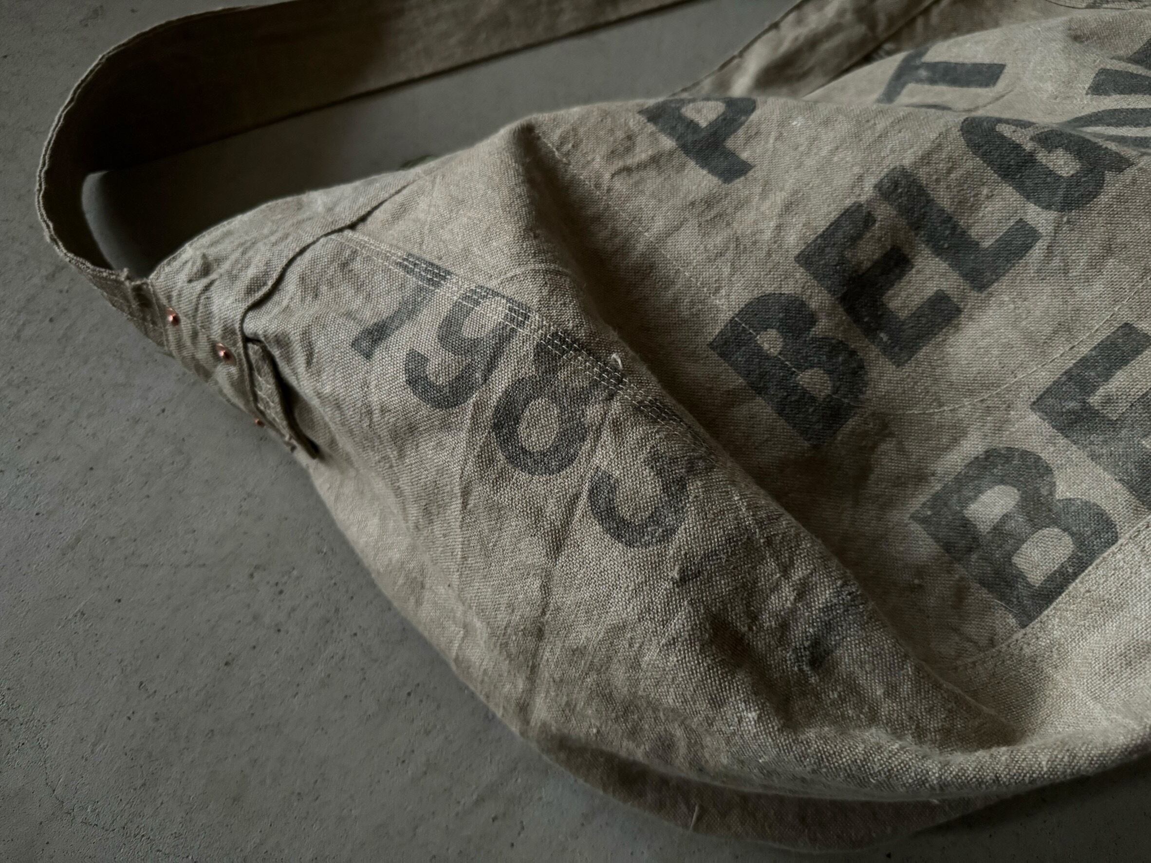 ボディーの生地は80年代、ベルギー郵便局のハガキを集めるための麻素材の袋。麻素材で、独特のクタッとした素材感。全面にインパクト大のステンシル。ヴィンテージの雰囲気満載です。