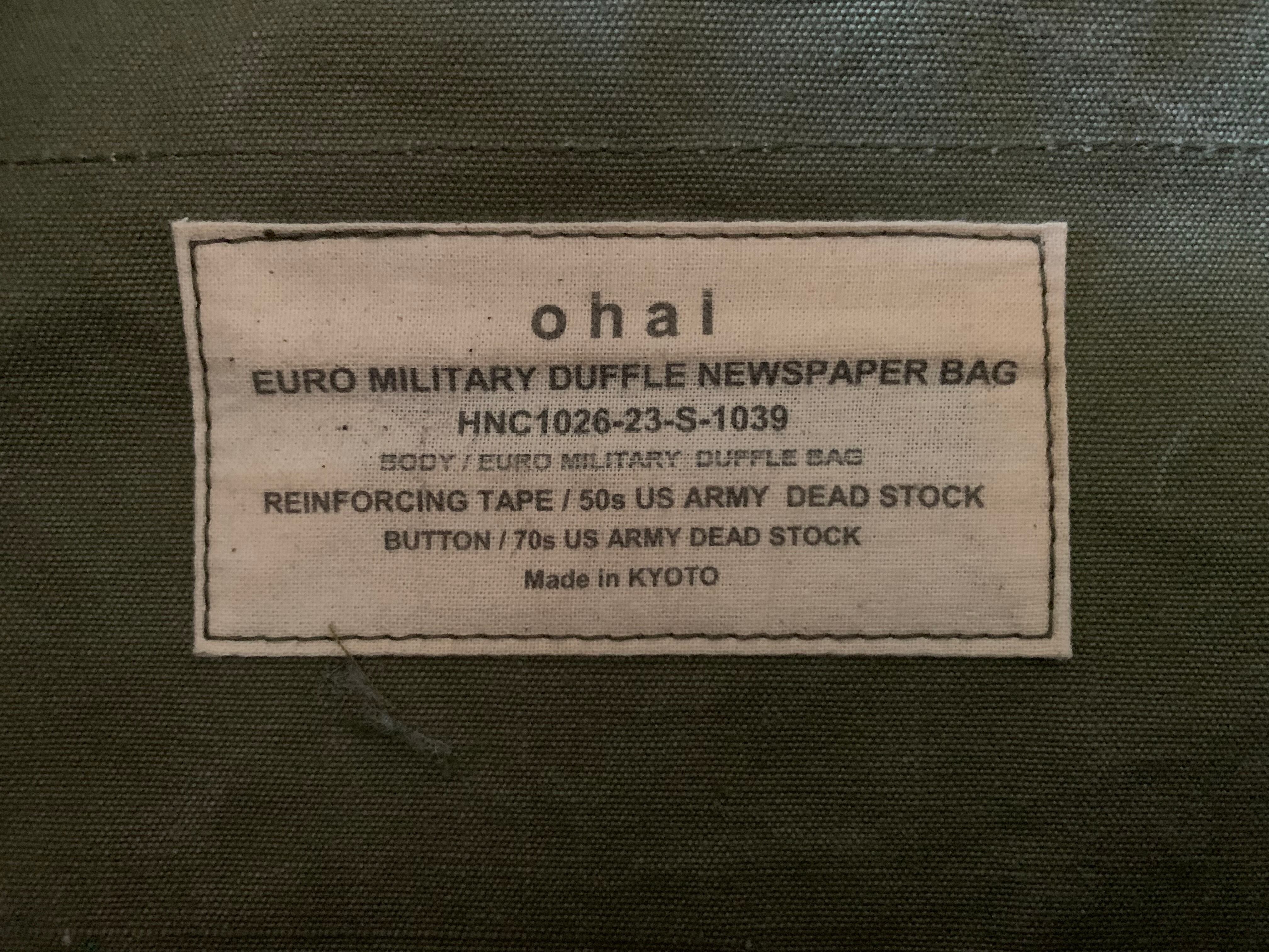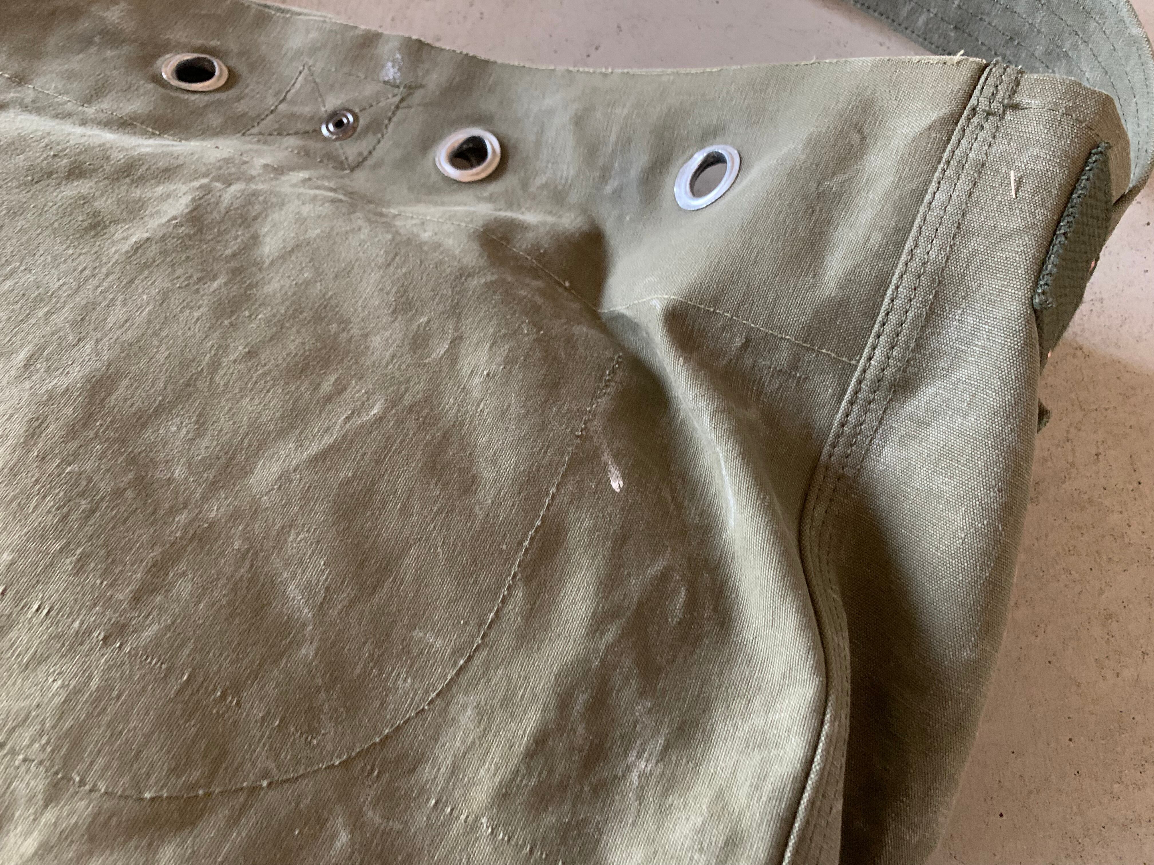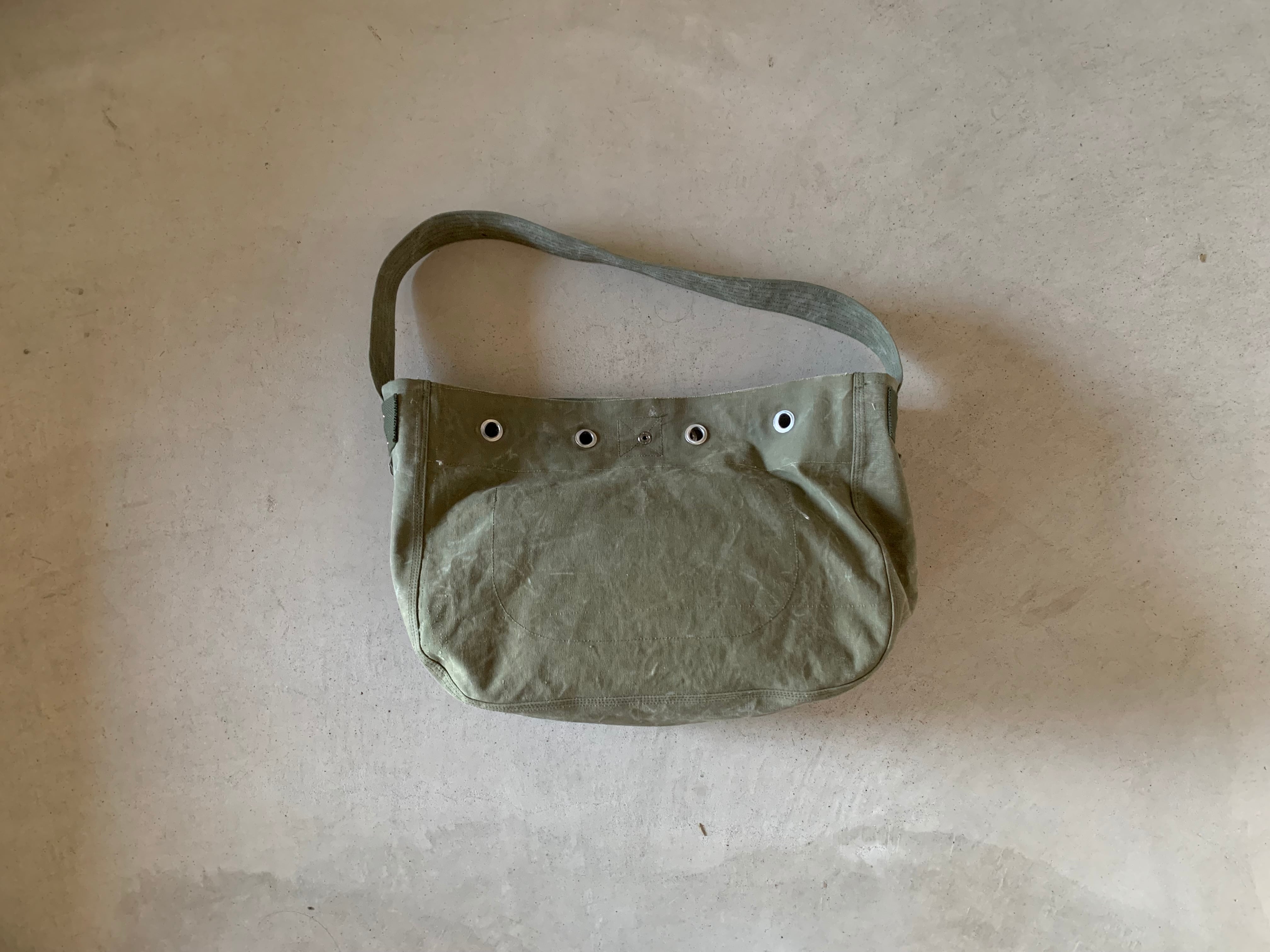 ボディーの生地は詳細不明のユーロミリタリーのダッフルバッグ。素材はガシッと丈夫なコットンキャンバス素材で、ヴィンテージの雰囲気満載です。開口部にはアルミ素材のハトメ。ヴィンテージ感溢れる仕様です。