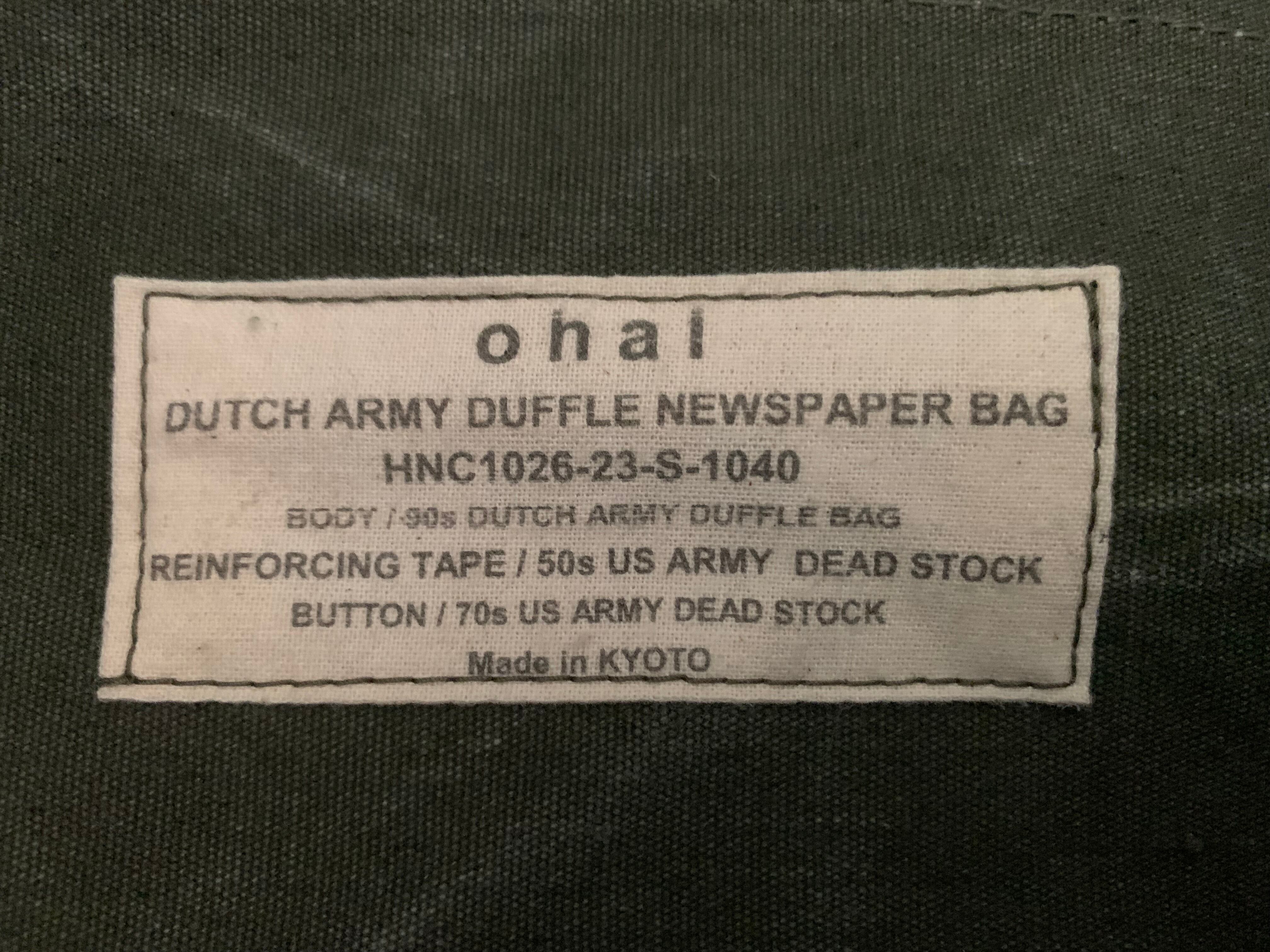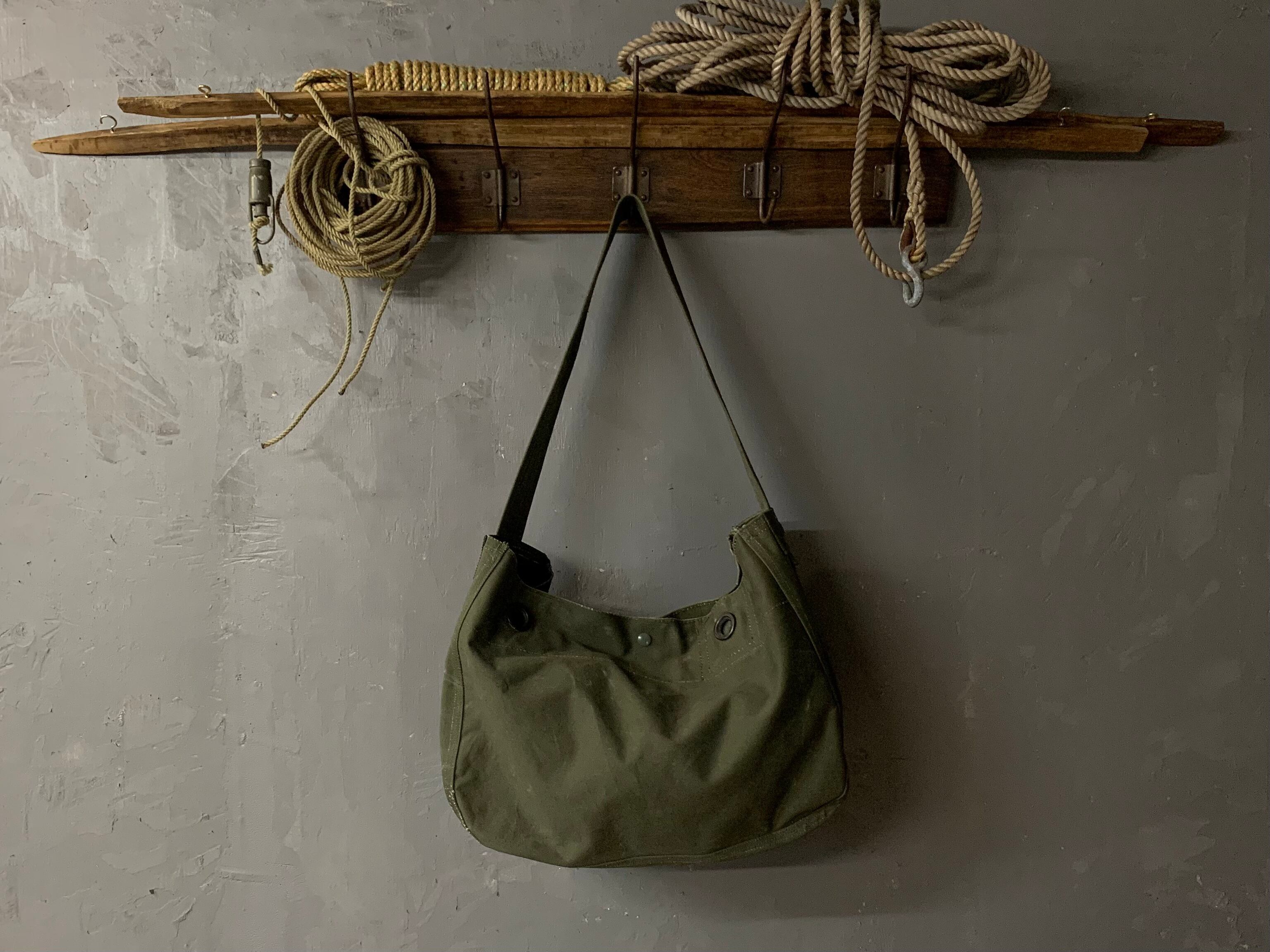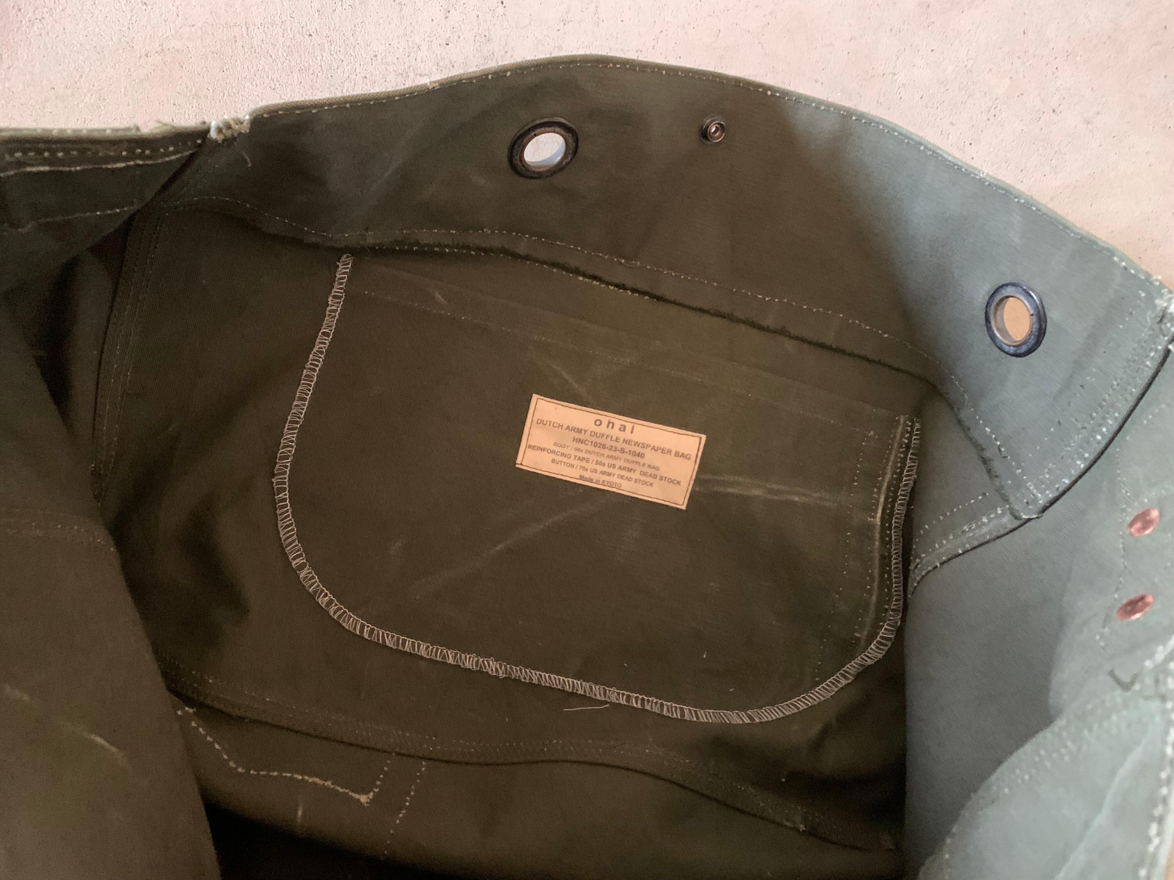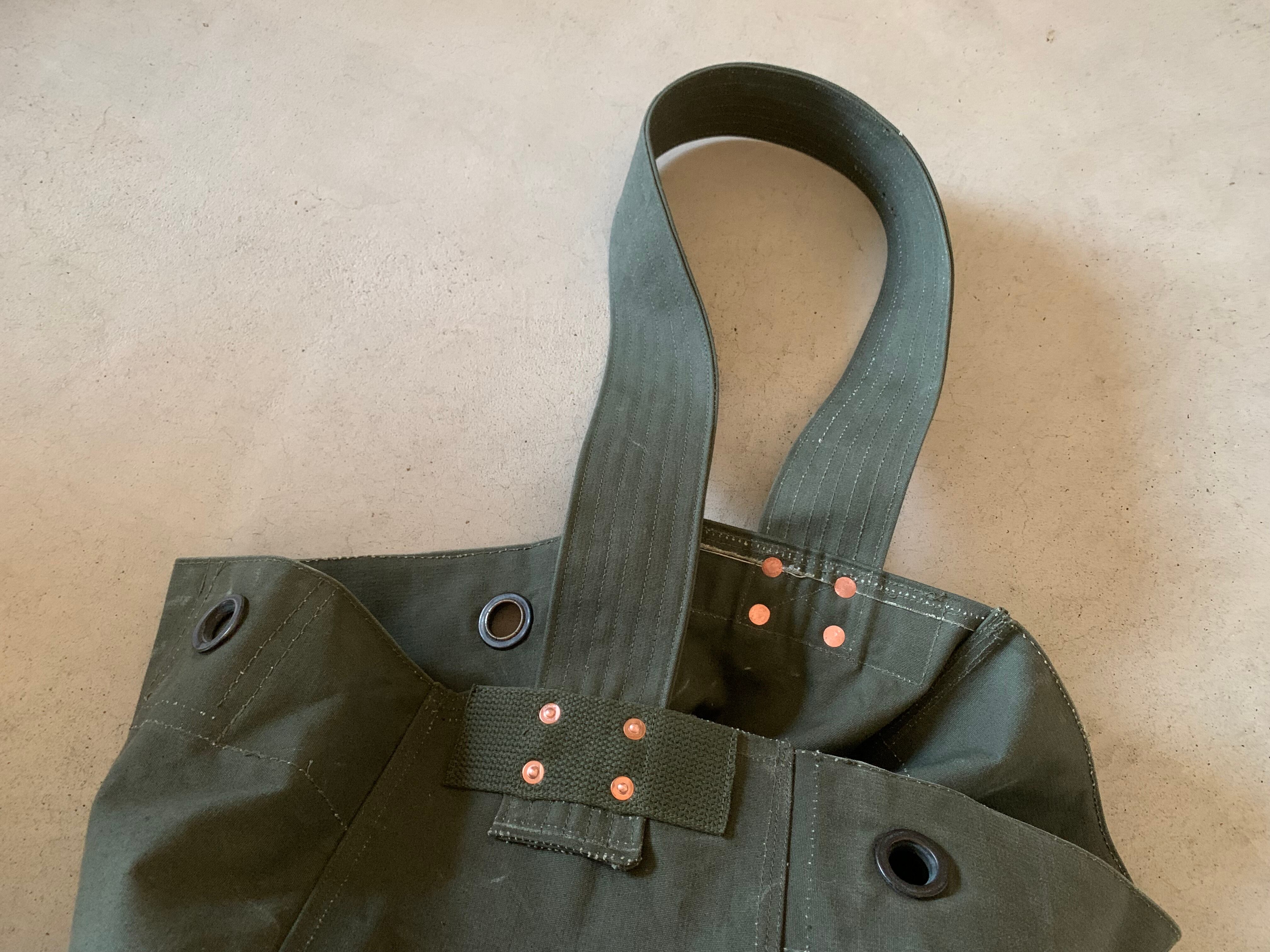ボディーの生地はおそらく90年代、オランダ軍のダッフルバッグ。素材はガシッと丈夫なコットンキャンバス素材で、ヴィンテージの雰囲気満載です。開口部には迫力のある黒いハトメ。ヴィンテージ感溢れる仕様です。