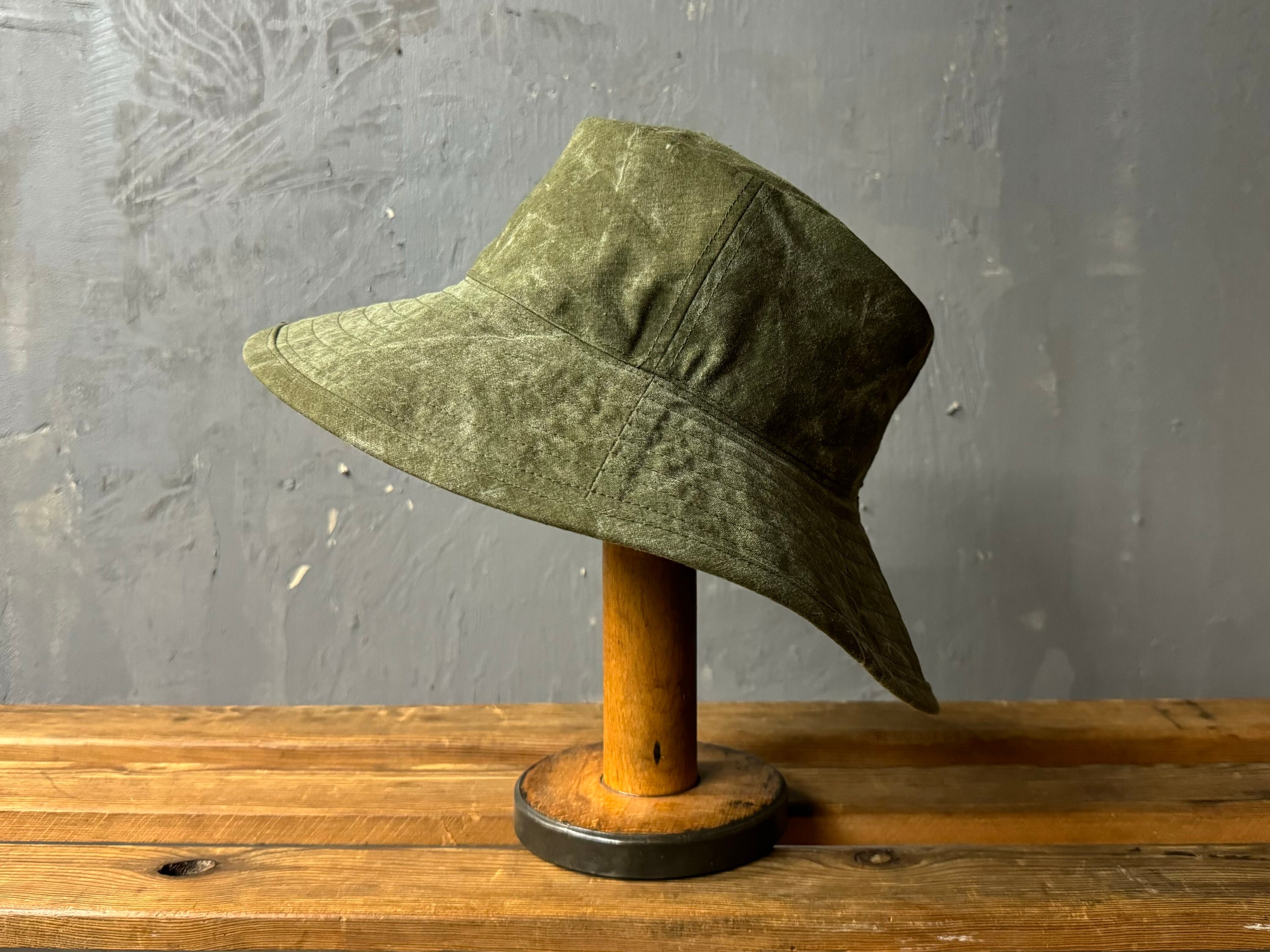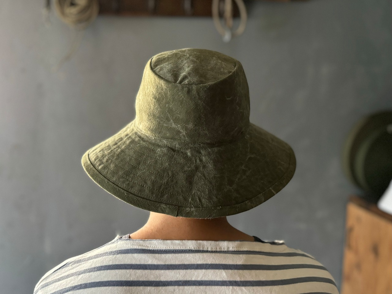 デザインは広めのブリム(ツバ)が垂直ではなく下方向へ角度をつけてついております。そしてトップクラウンが楕円形で、バケットハットや、サファリハットとは違ったクラシカルな雰囲気のあるハットです。