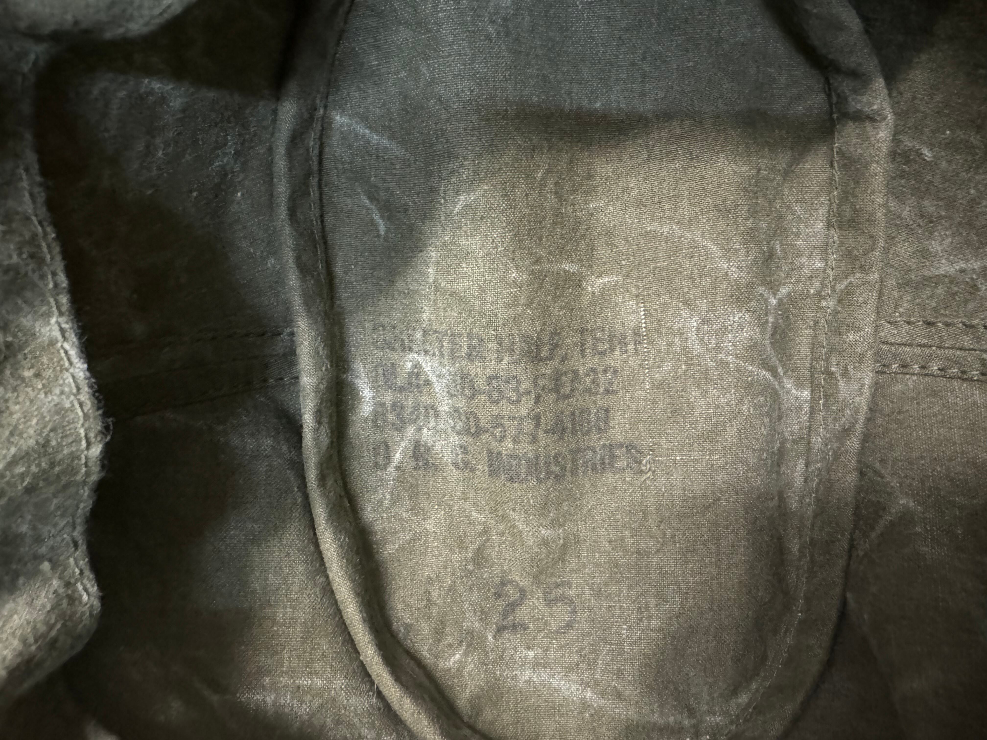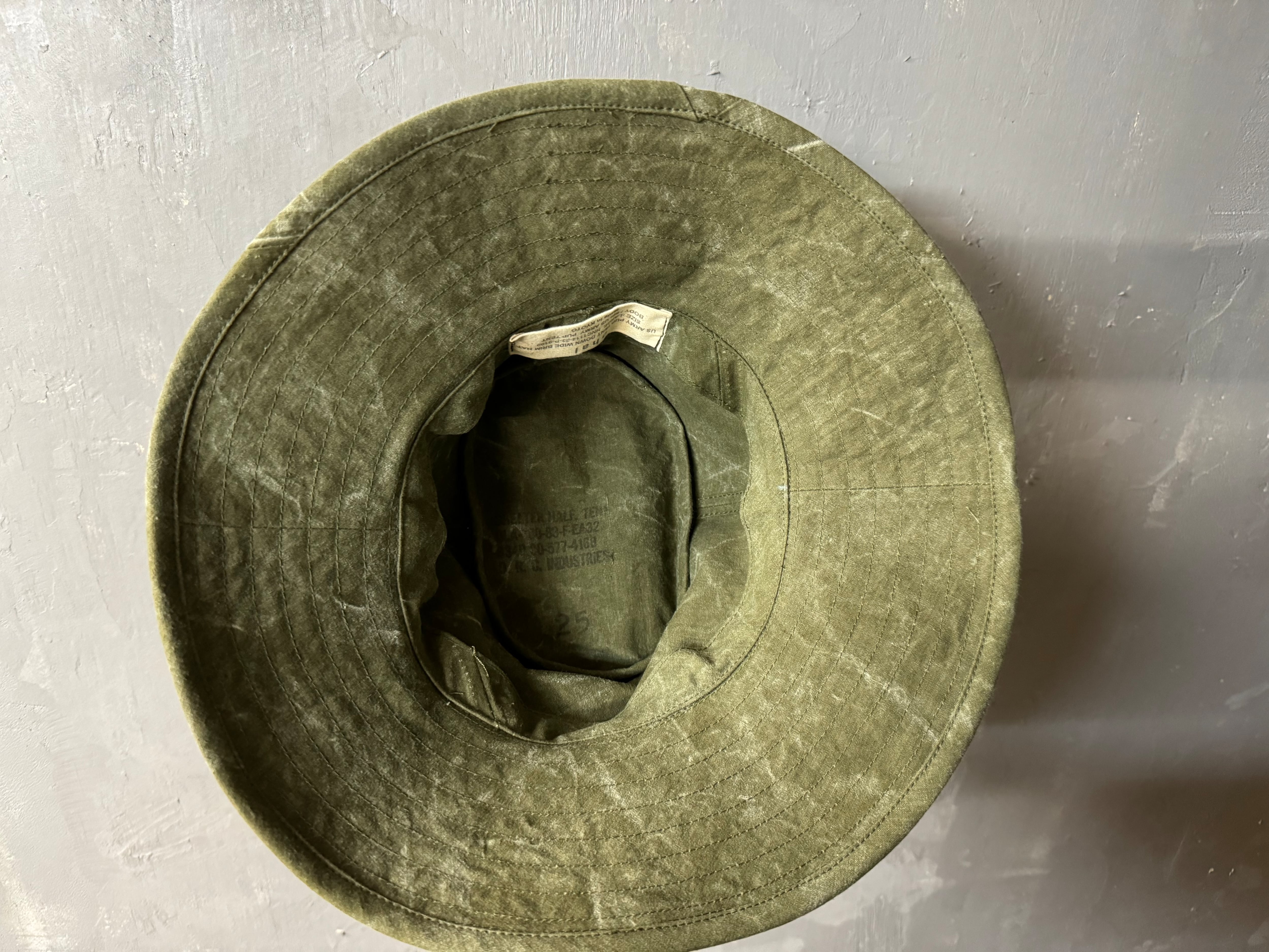 ボディーの素材は80年代アメリカ軍のパップテント。ハリがあり、ヴィンテージ素材にしか出せない風合いのある素材です。トップクラウンの内側にミルスペックが記載されています。