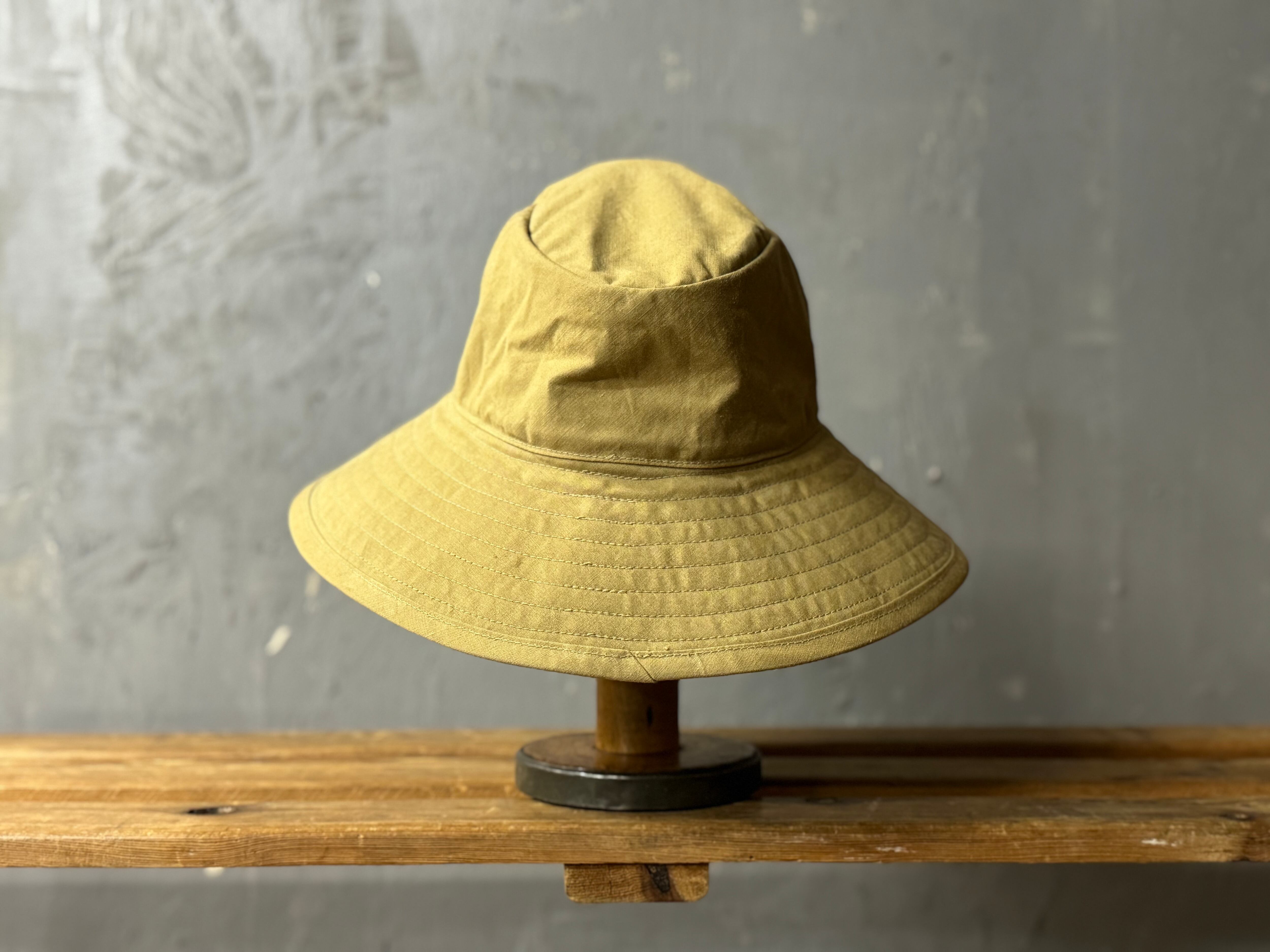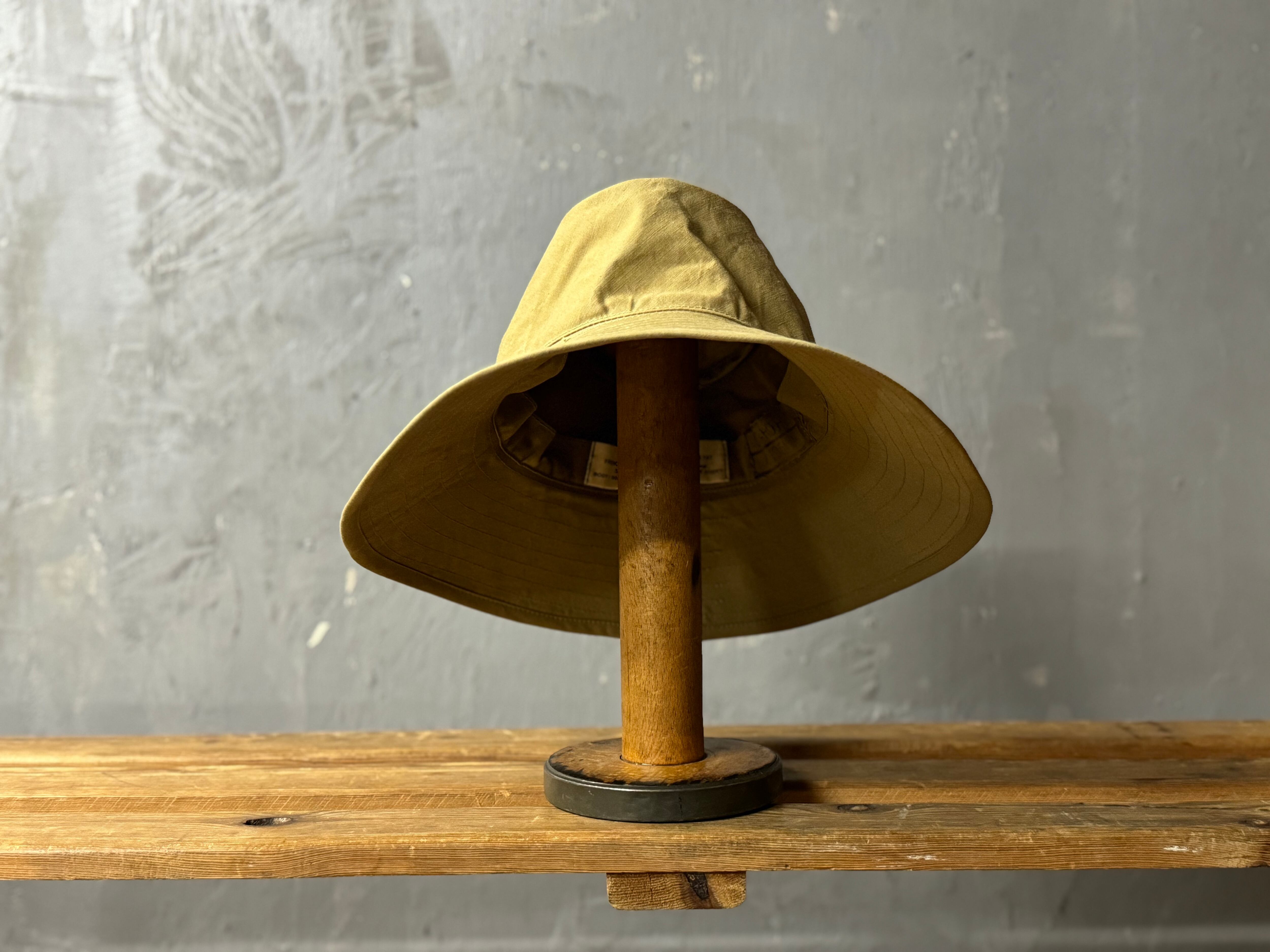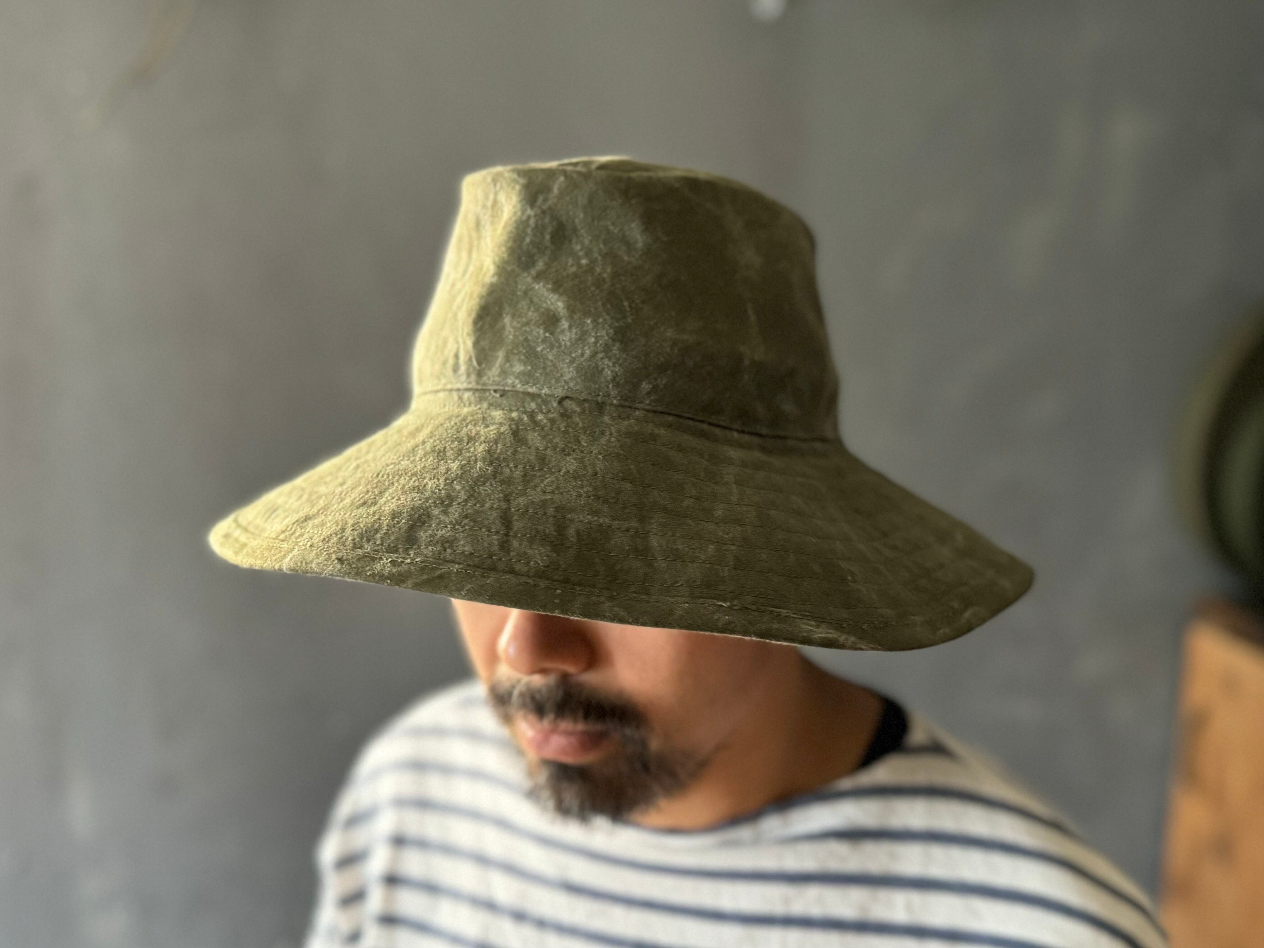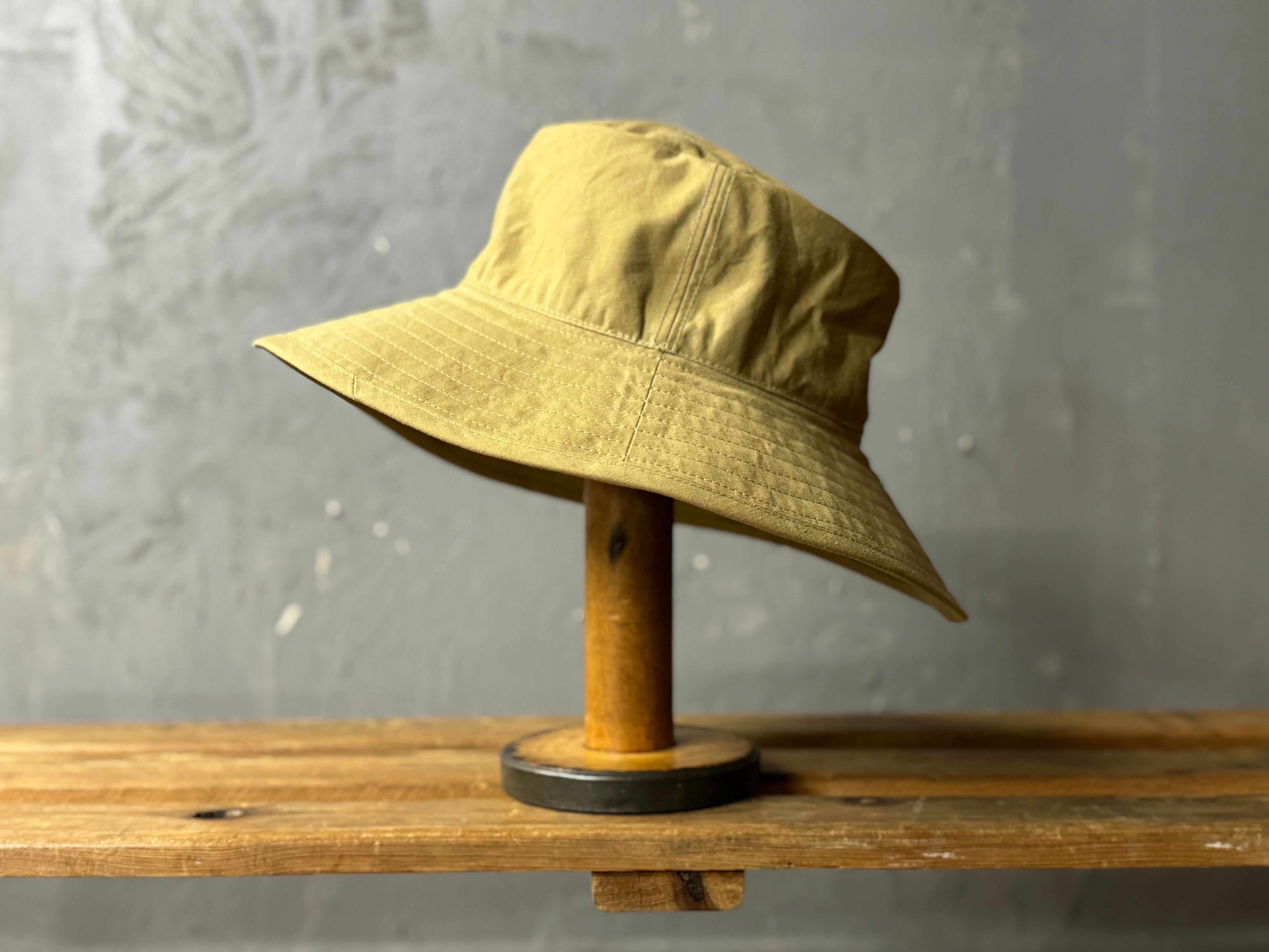 デザインは広めのブリム(ツバ)が垂直ではなく下方向へ角度をつけてついております。そしてトップクラウンが楕円形で、バケットハットや、サファリハットとは違ったクラシカルな雰囲気のあるハットです。