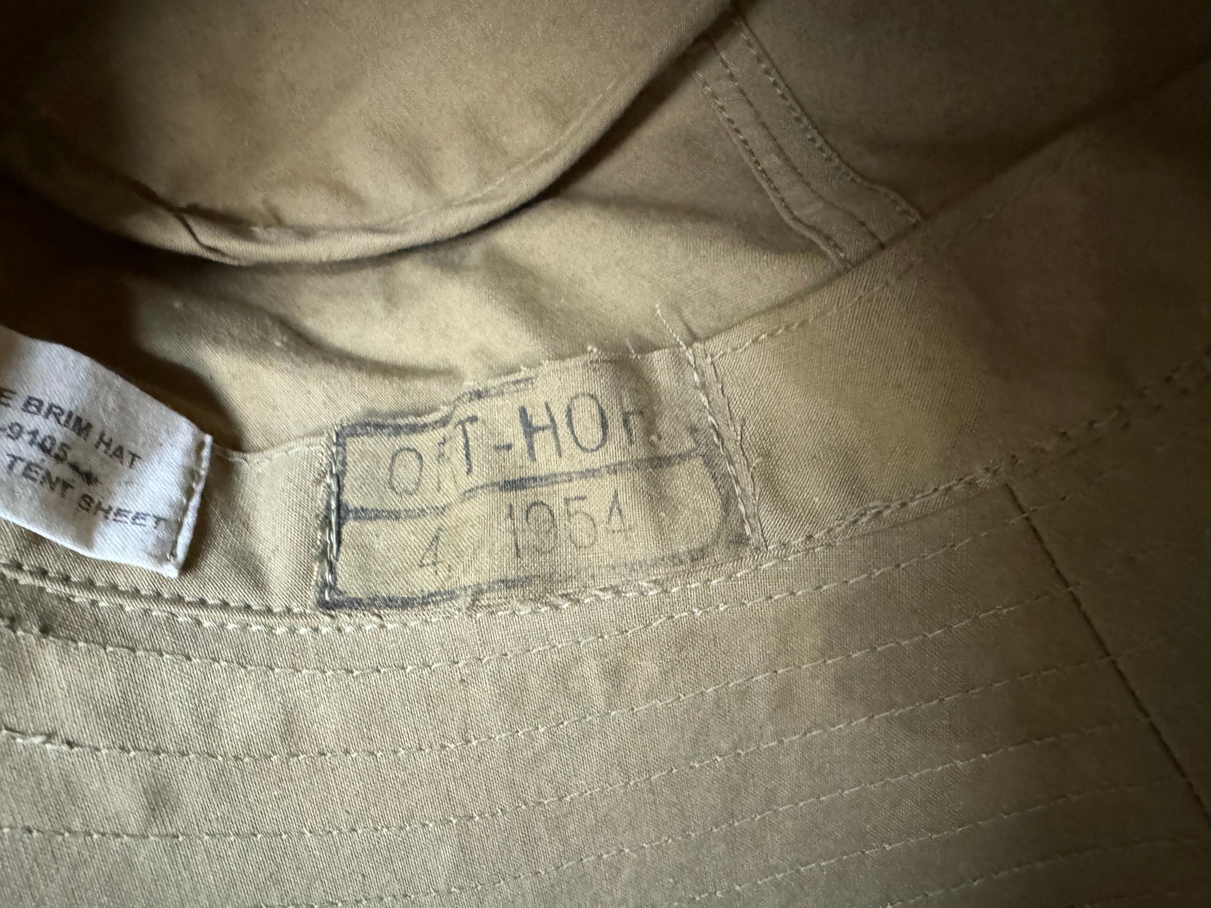 ボディーの素材は50年代フランス軍のトライアングルテント。ヴィンテージ素材にしか出せない風合いのある素材です。トップクラウンの内側にステンシル部分を切り出し貼り付けています。1954年製造の物とわかります。