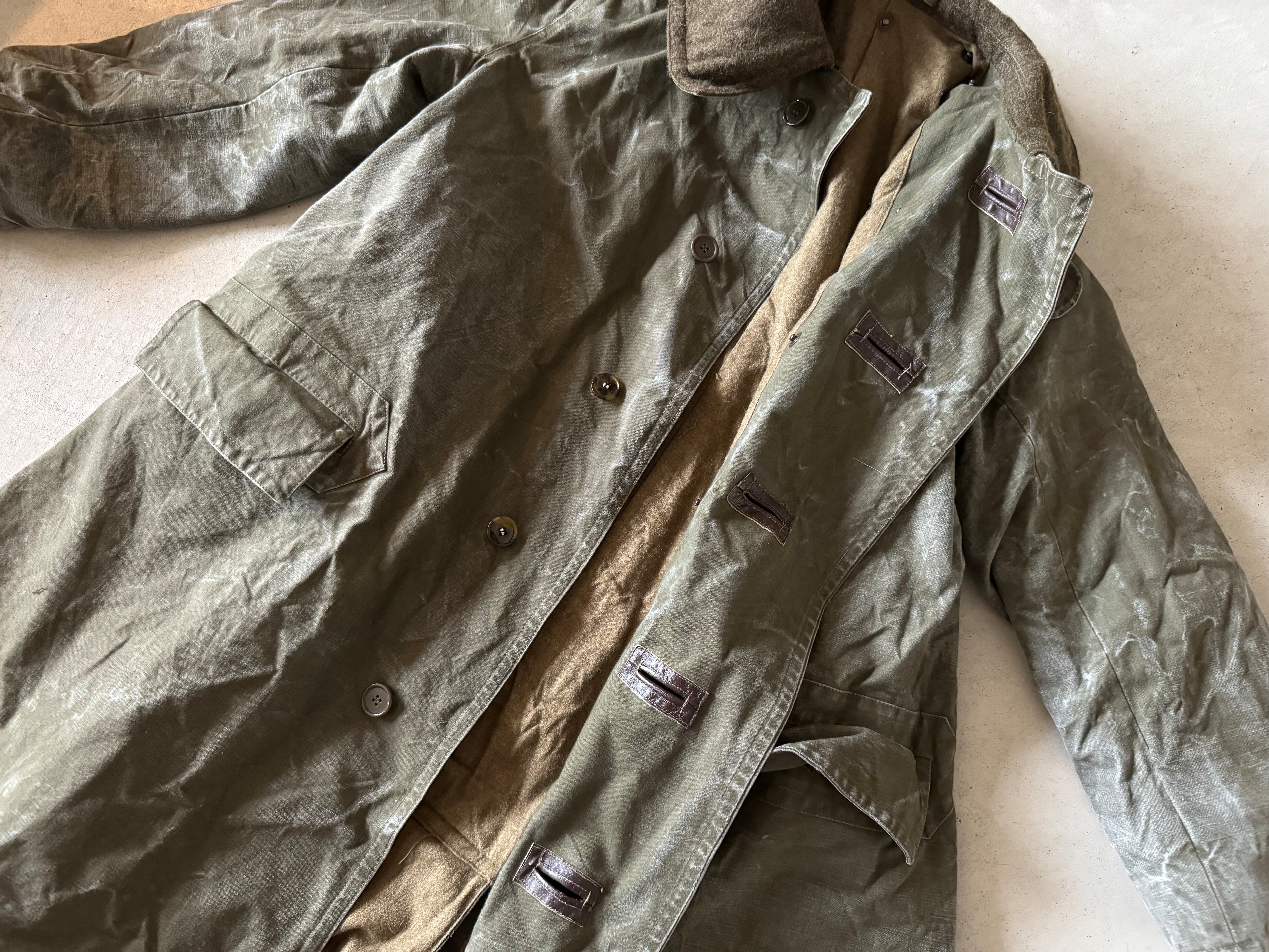首周りは風除け?用の大きめの襟。レザーベルトのストラップは欠損しています。ボタンホール一つ一つにレザーで補強される丁寧なつくり。ボタンはおそらくオリジナルではありません。