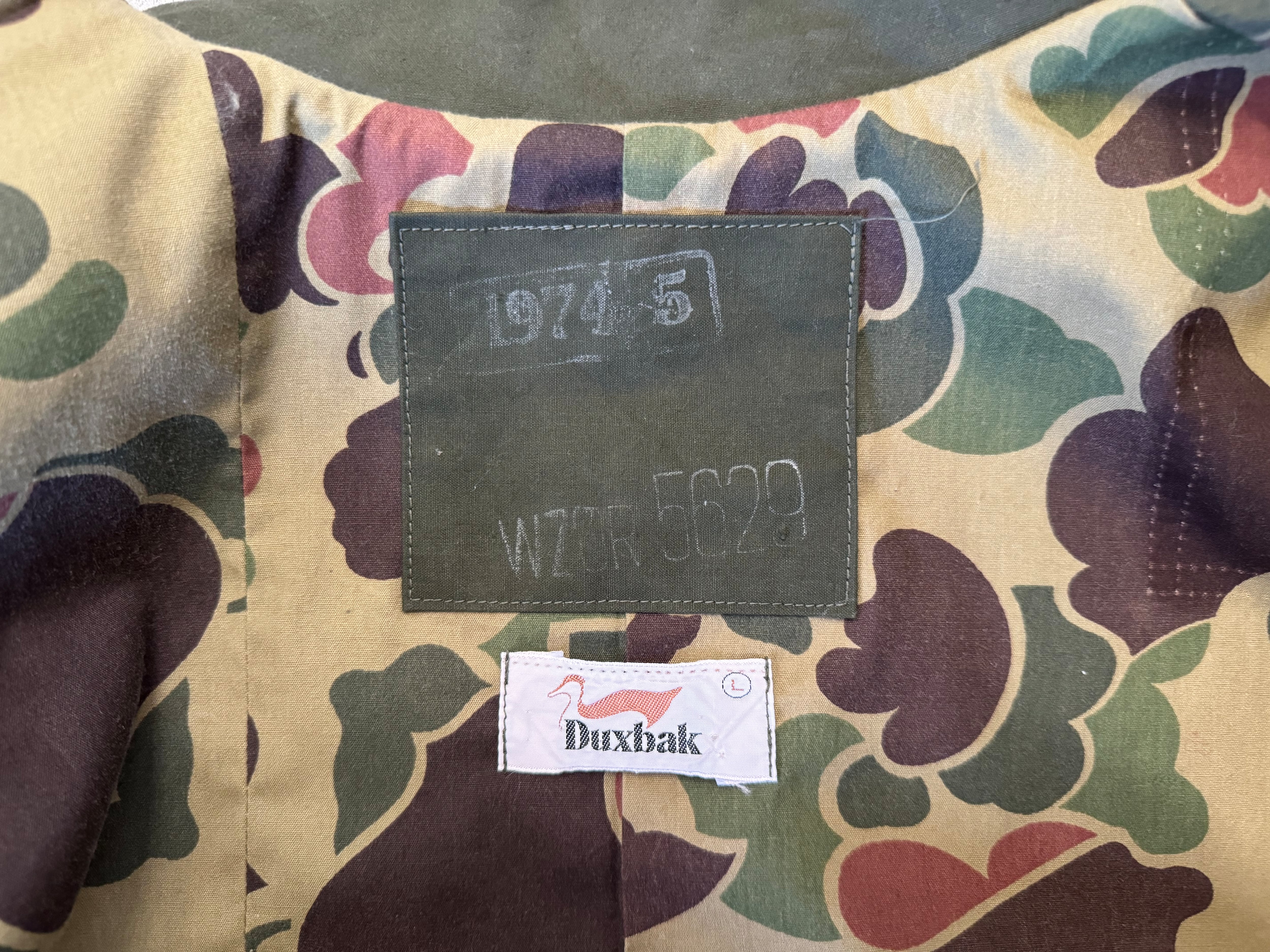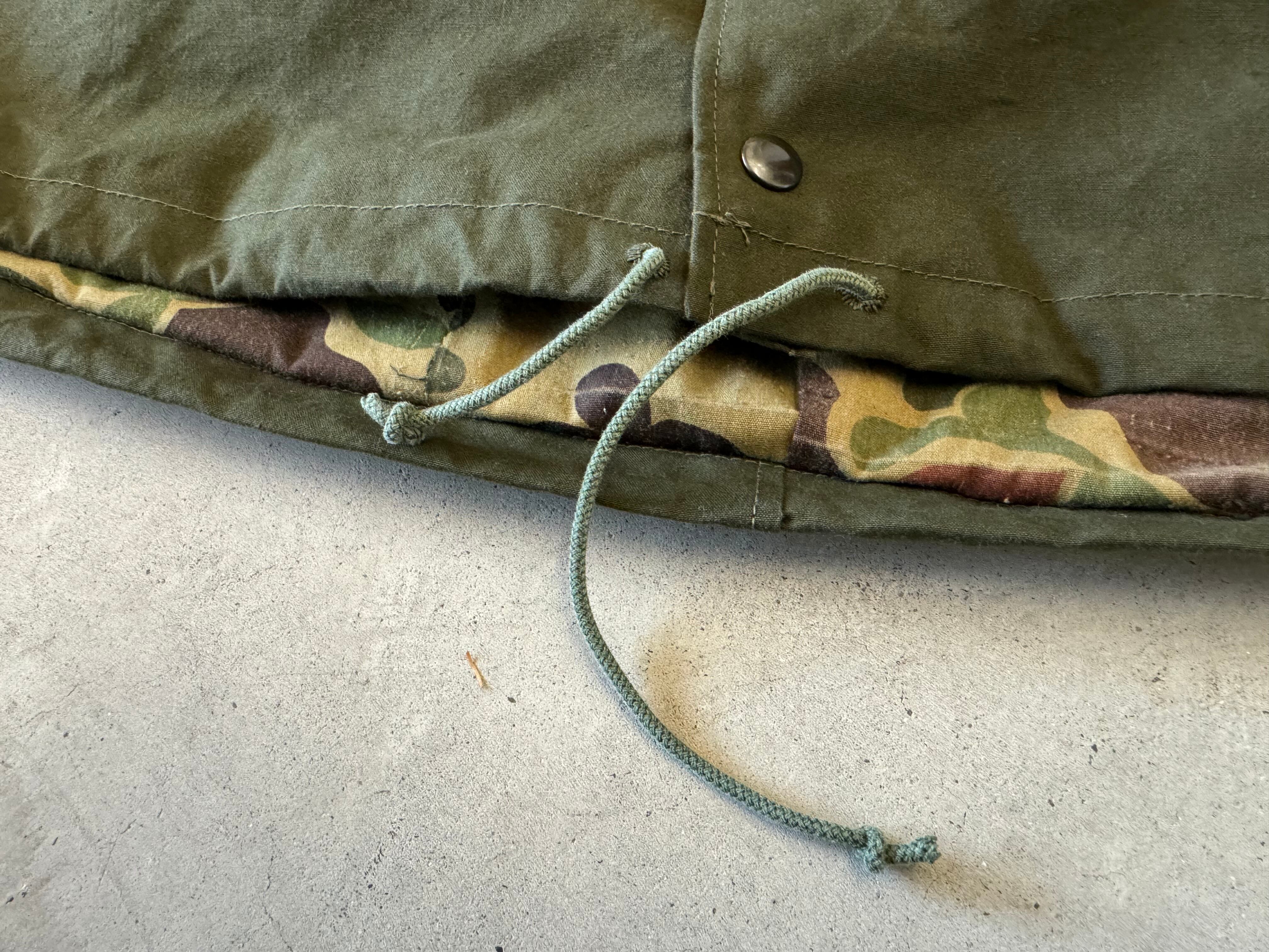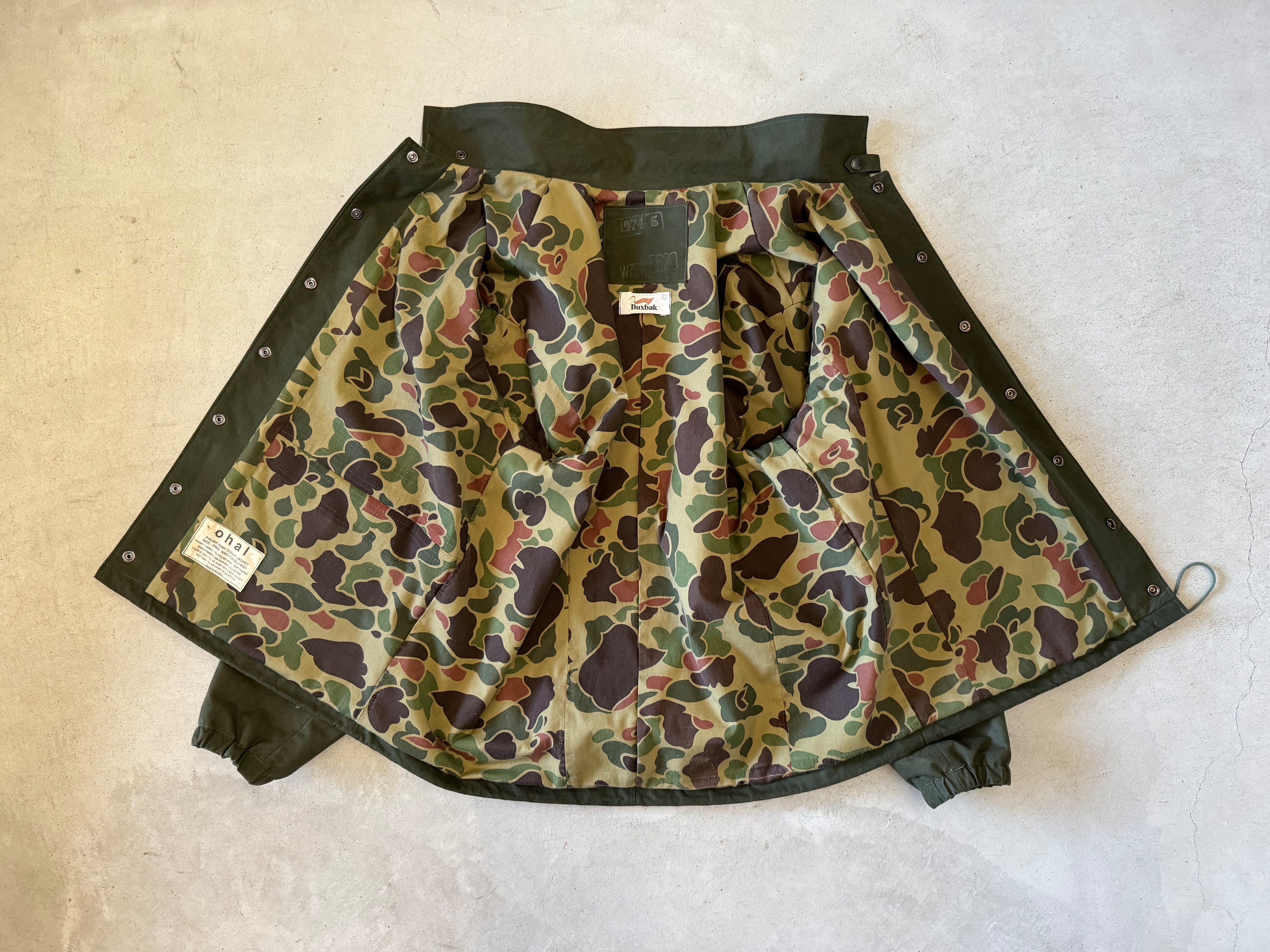 裏地は70年代のアメリカのアウトドアブランド、DUX BAKのハンターカモ柄のツナギを解体した生地を使用しています。