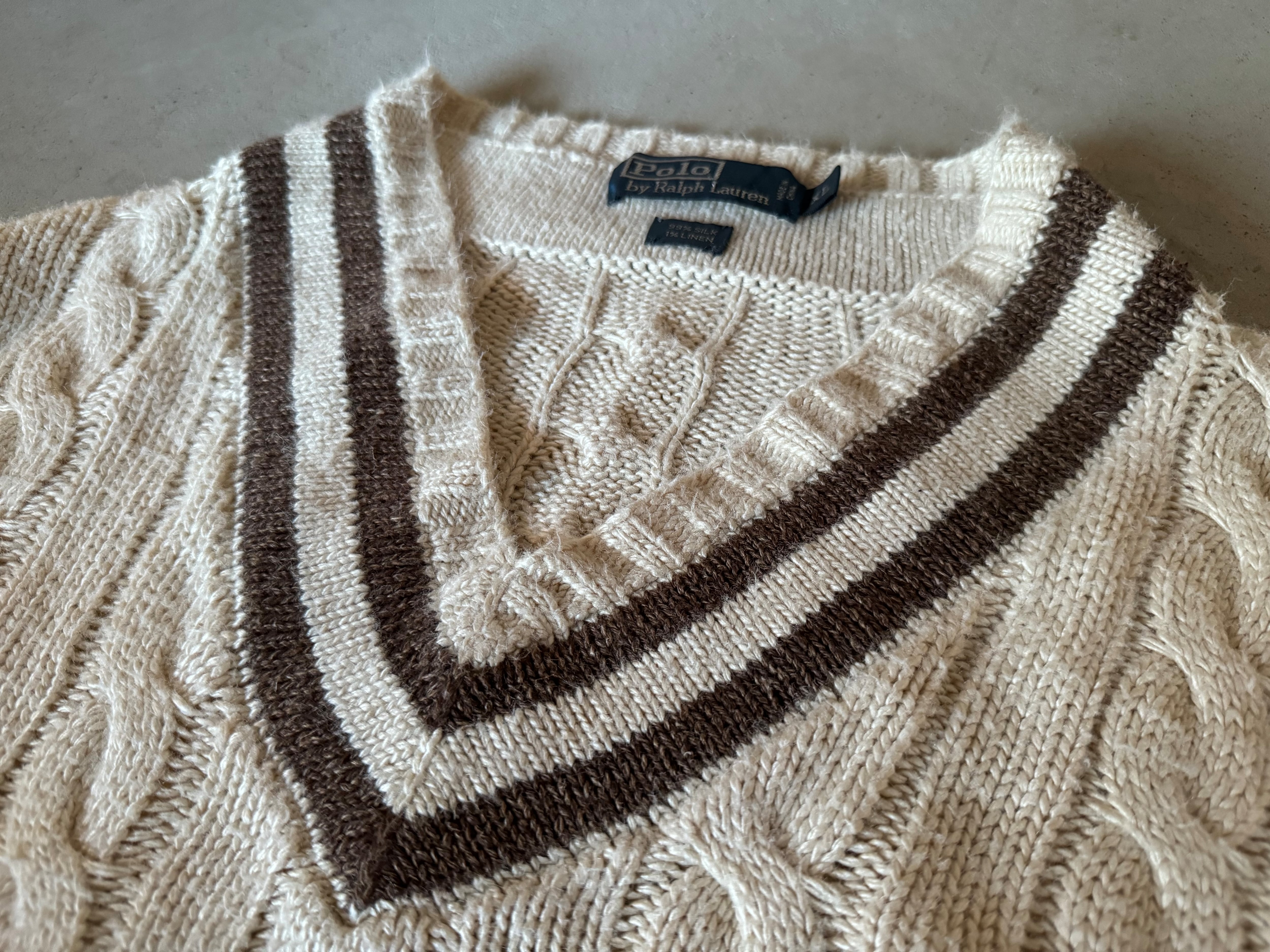 ラルフローレンのシルク99%、リネン1%のチルデンセーター。リネンが1%入ることでモヘア素材のように、少し毛羽立った素材です。ですが99%シルクですので非常に肌触りもなめらかで気持ちの良いセーターです。