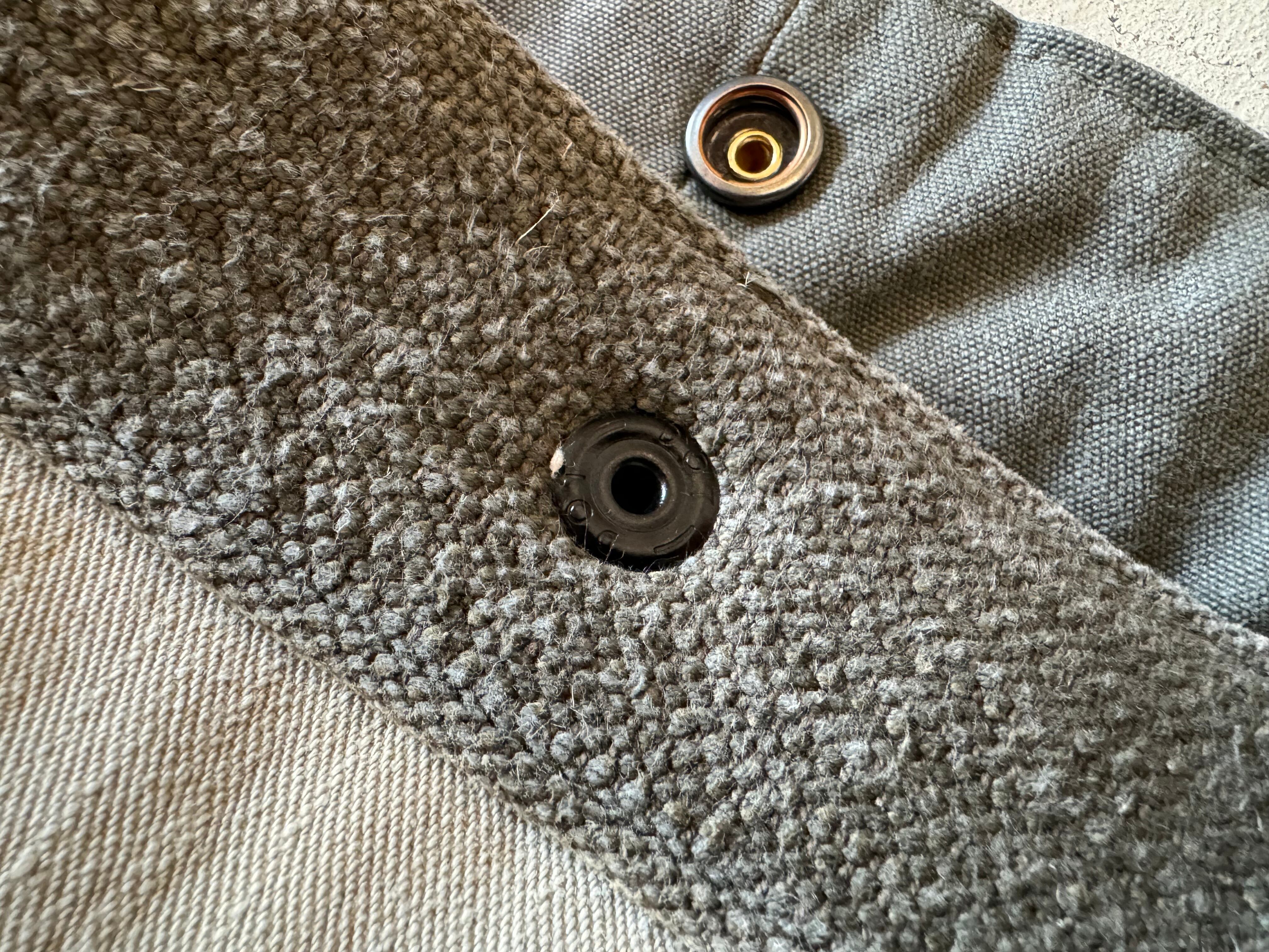 穴があいた、破れた、糸がほつれた、などのトラブルは、ヴィンテージ生地でのパッチワークや、ミシンでたたいて補修をします。ボタンやスナップボタンなどの付属品が取れてしまった、カバンのストラップがちぎれたなどの場合は、似寄りの物で対応させていただきます。