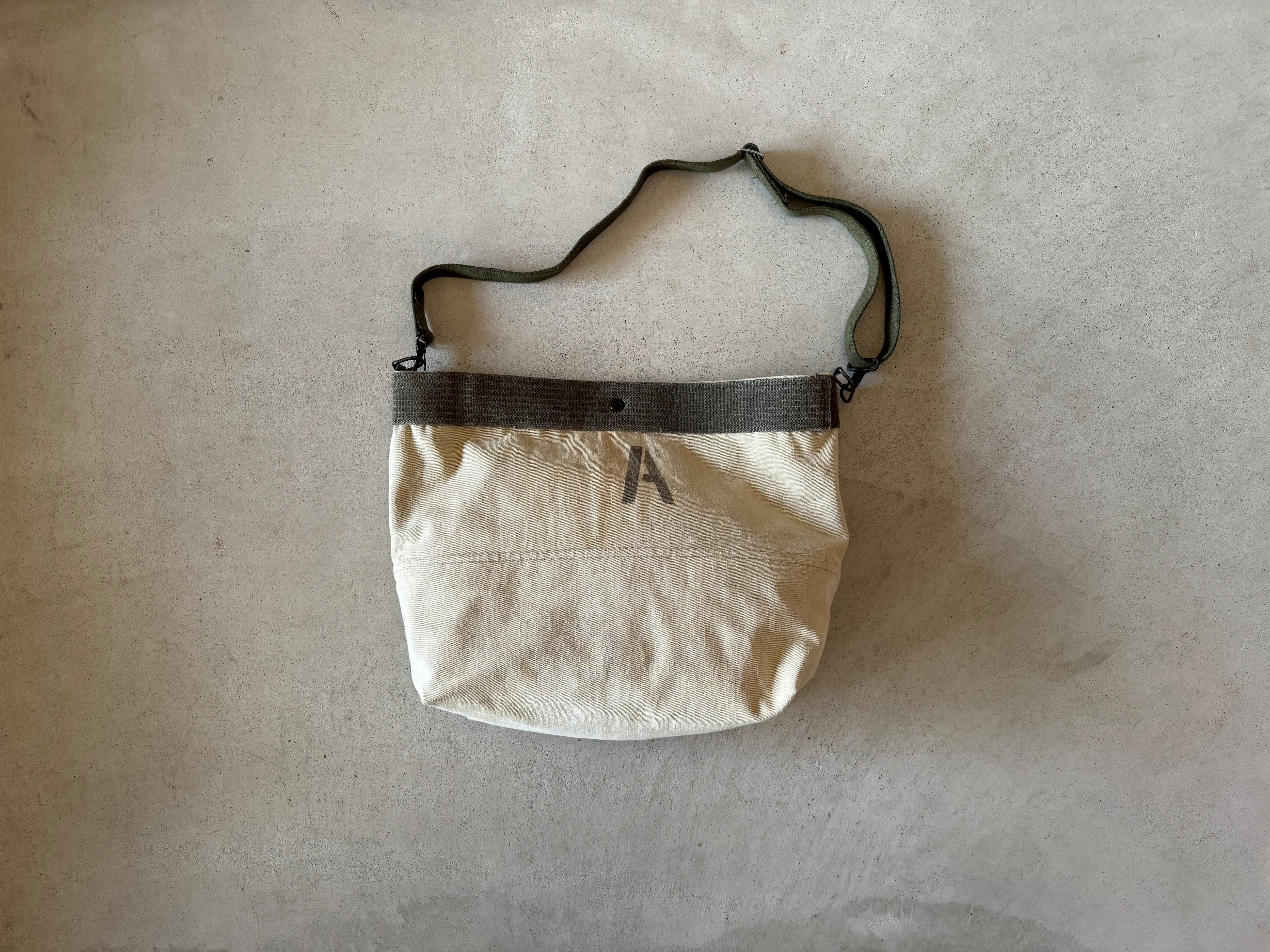 ヴィンテージのミリタリー素材を組み合わせて、ショルダーバッグを作りました。