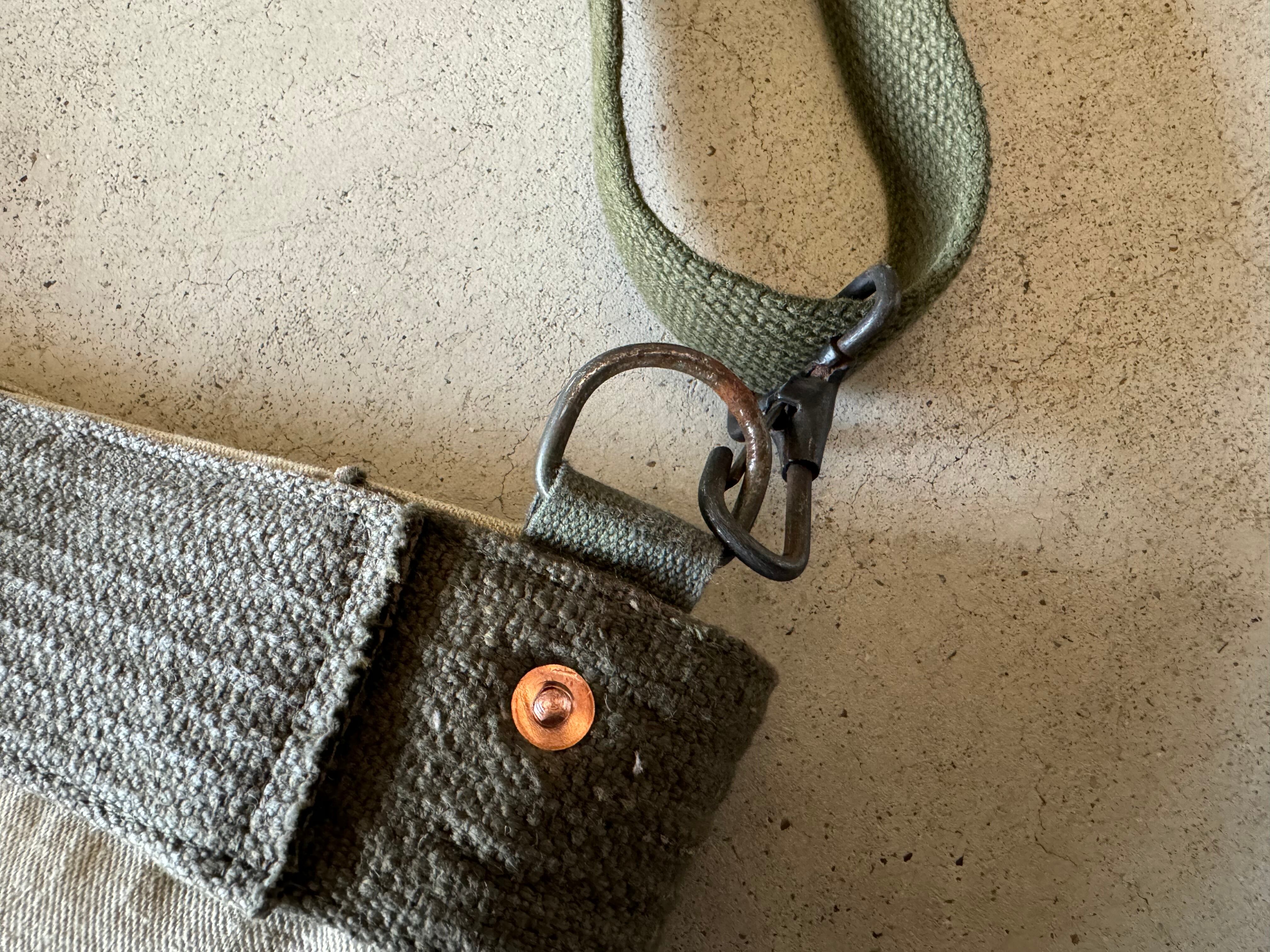 ショルダーベルトは取り外し、長さ調整可能で、素材は60年代頃のアメリカ軍のキャンバステープとナスカンを使用しています。アジャスターの金具は詳細不明ですがミリタリーのバッグに使用されていた物です。
