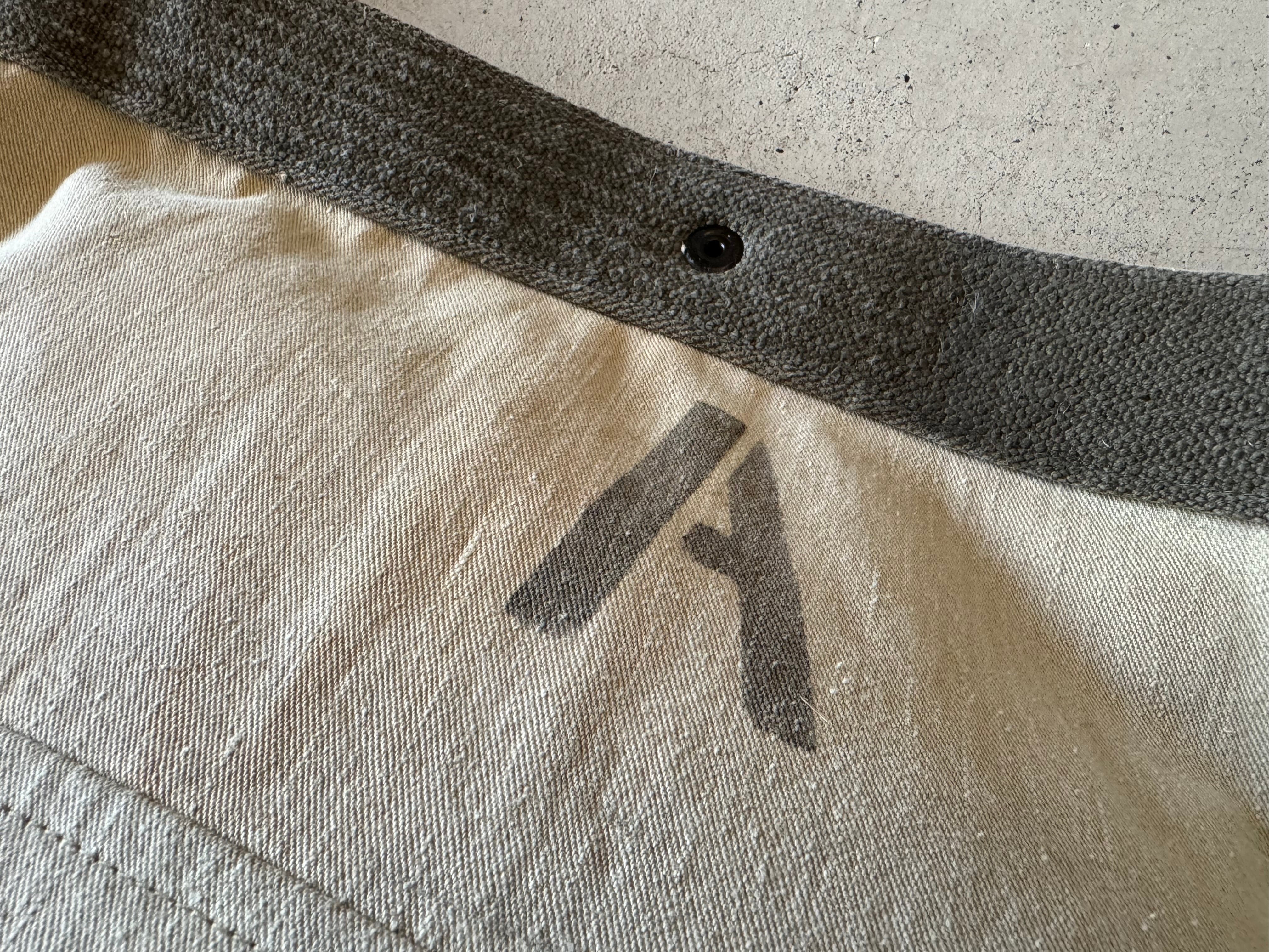 表地は詳細は不明ですが、かなり古いキナリのランドリーバッグを解体した生地を使用しています。表地だけでは生地が弱いので、裏地にフランス軍のダッフルバッグの端切れをパッチワークした物を使用しています。年代は80年代頃、素材はコットンキャンバスです。