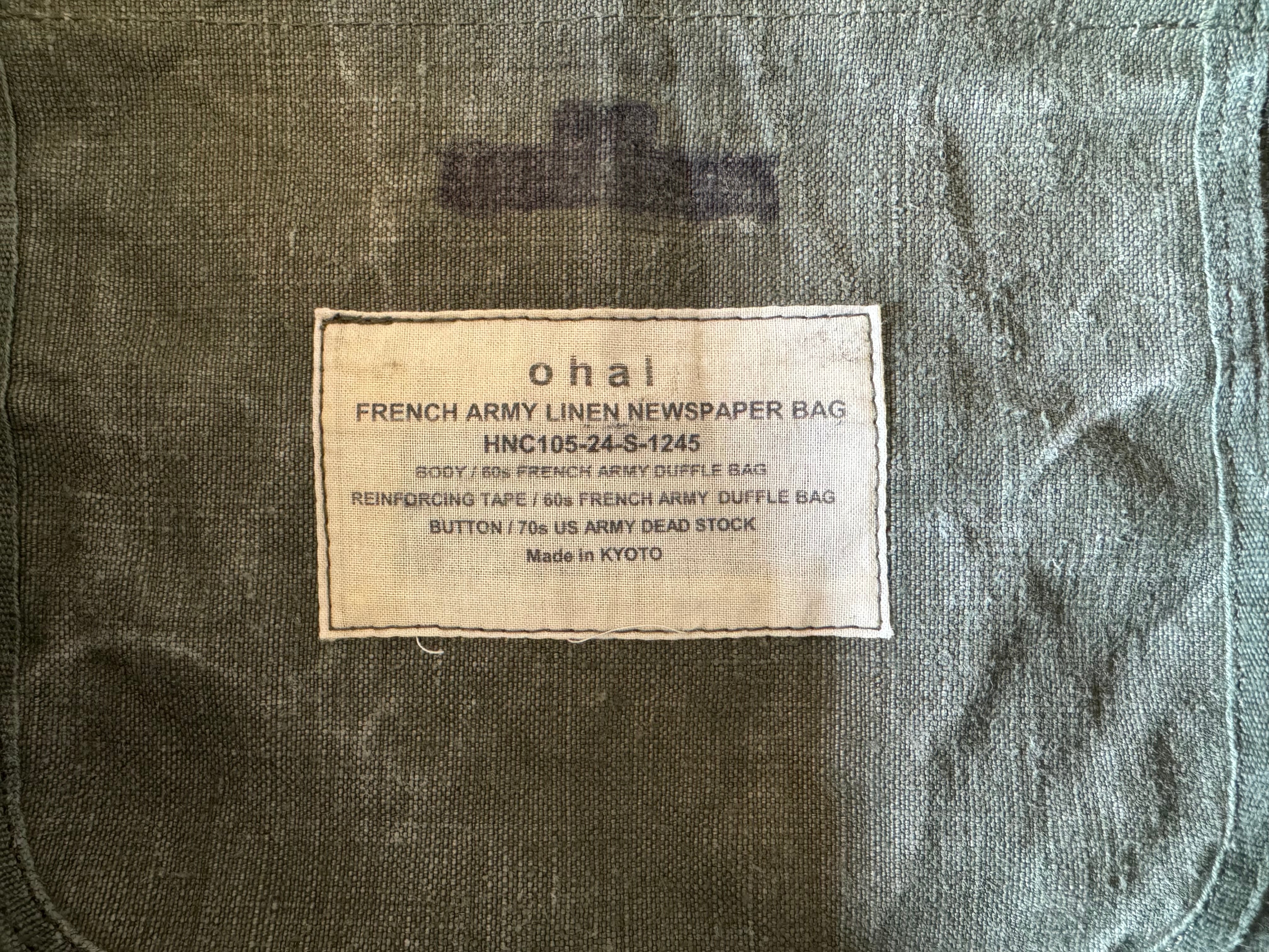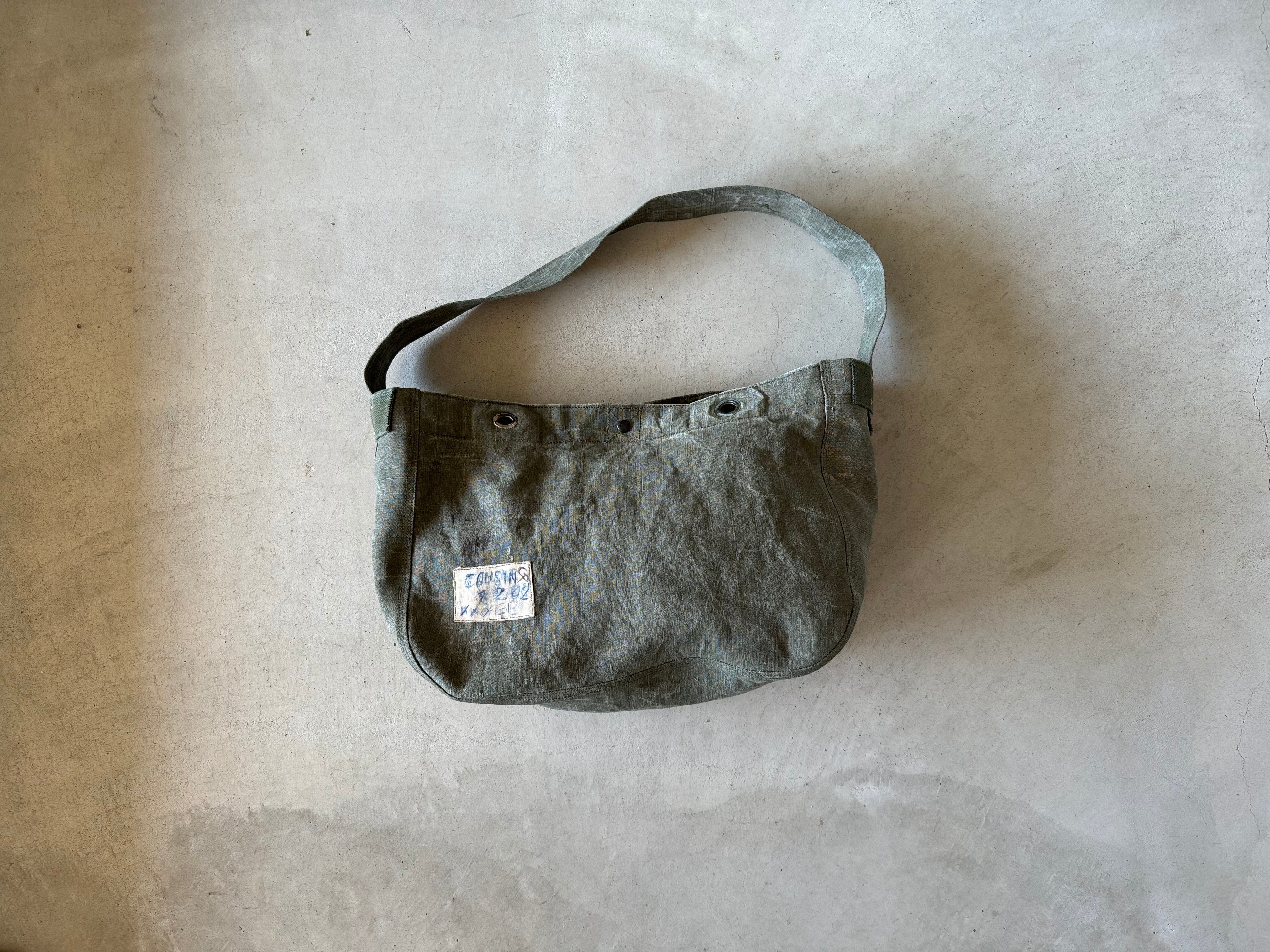ボディーの生地は60〜70年代頃、フランス軍のダッフルバッグ。リネン素材で、独特のクタッとした素材感でヴィンテージの雰囲気満載です。内側のポケットにうっすらとステンシルが打たれていますが、内容は判読できません。9枚目の画像をご確認ください。