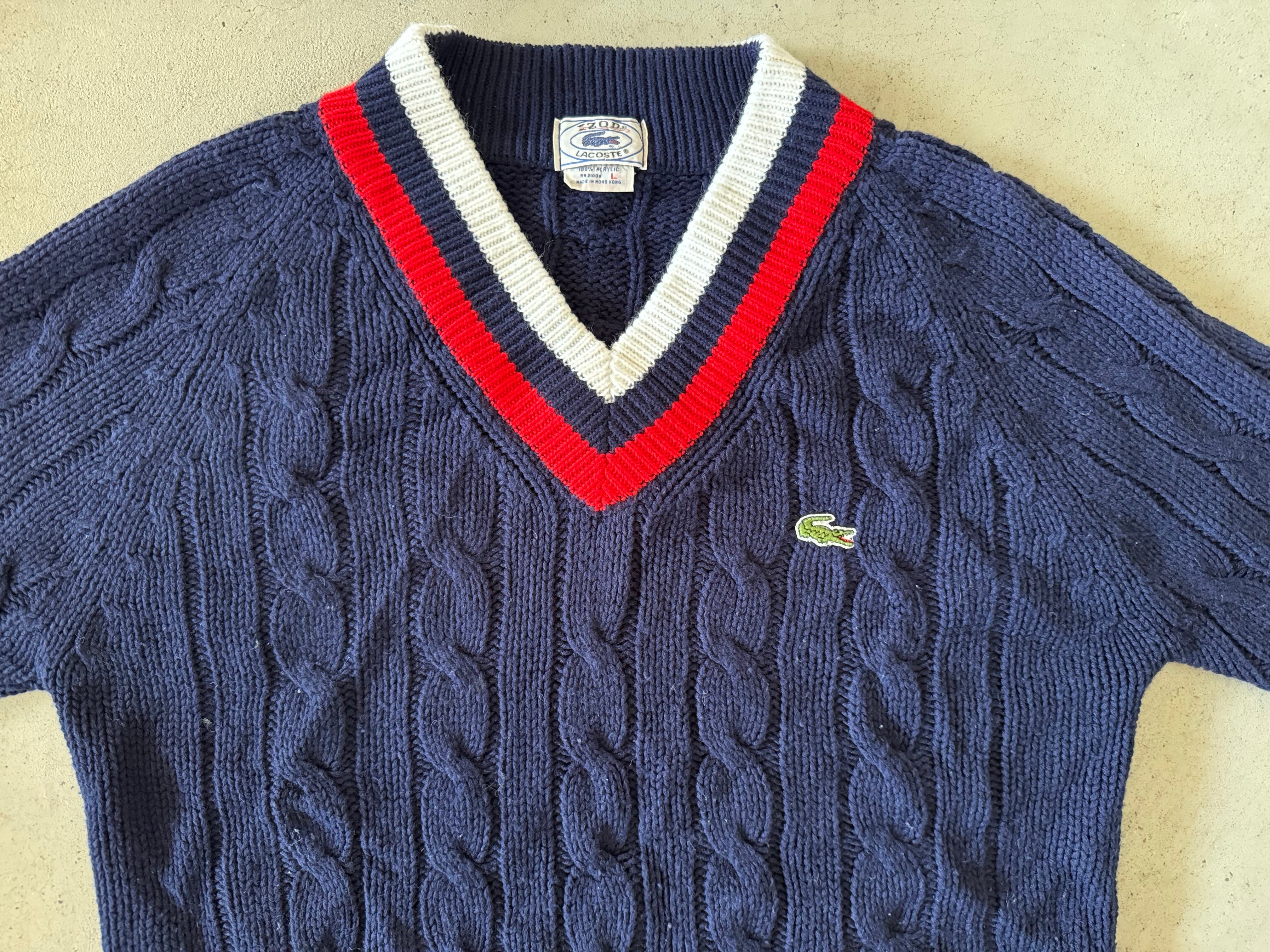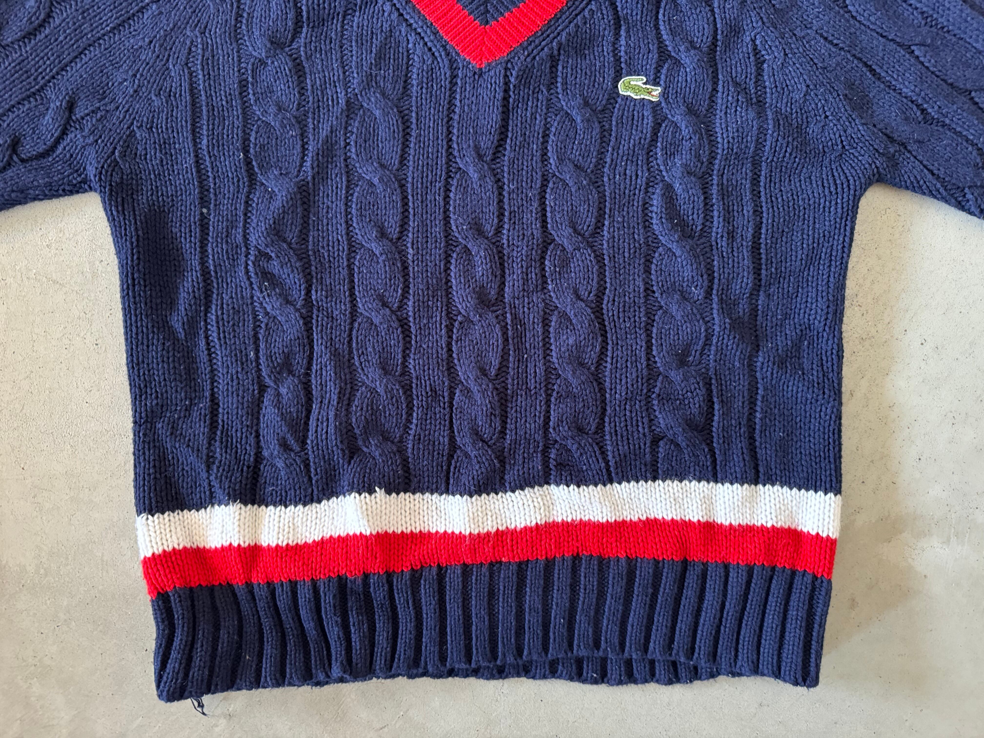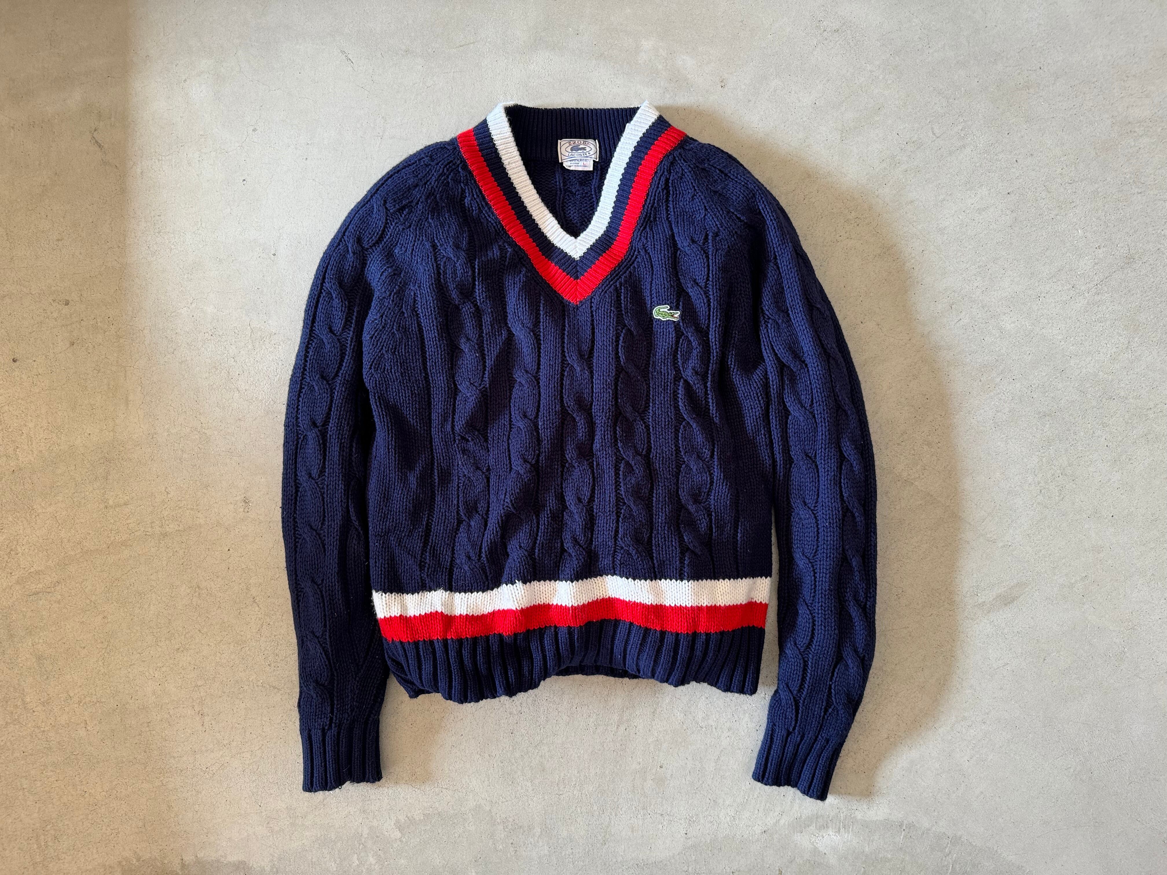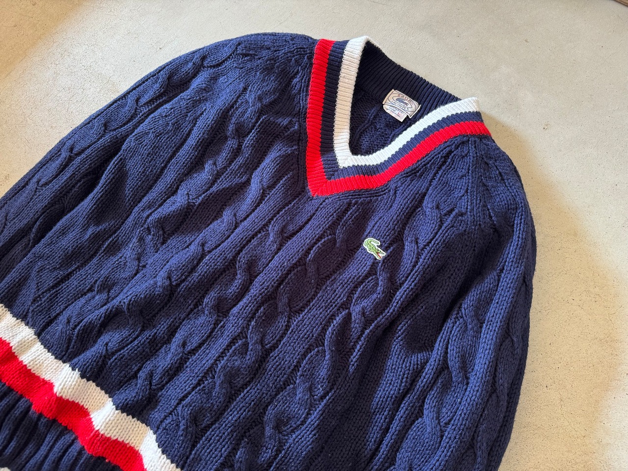 70〜80年代の糸巻きたぐがつく、IZOTのLACOSTE。ポロシャツやカーディガン、Vネックセーターはよく見かけますが、チルデンセーターは数が少ないので希少価値の高い一枚です。